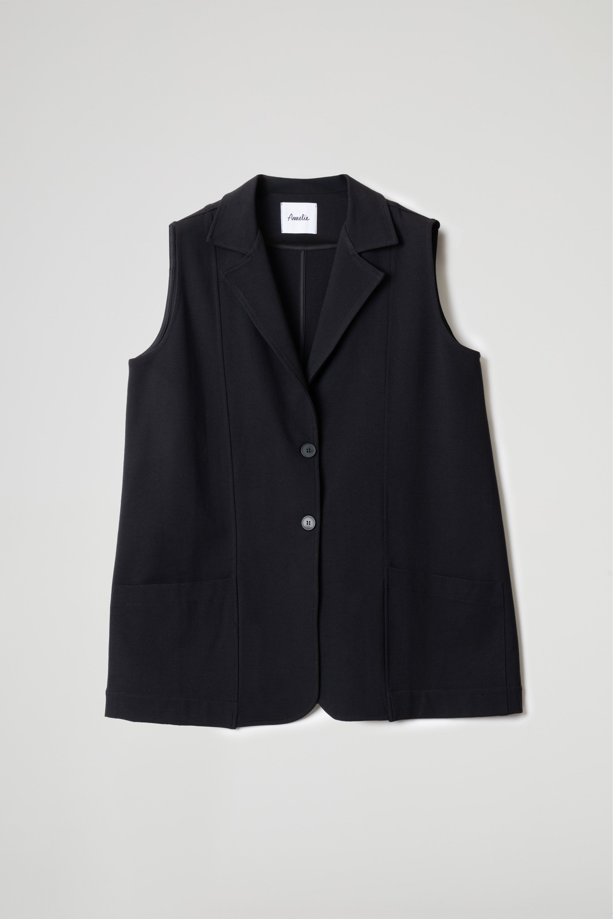 GILET OVER IN TESSUTO PUNTO MILANO DI VISCOSA ELASTICIZZATA, MANICA LUNGA,IMPUNTURA FRONTALE, COLLO REVERS, MAXI TASCHE A TOPPA, SPACCHETTO SUL RETRO, CHIUSURA CON BOTTONE. LINEA A TRAPEZIO.