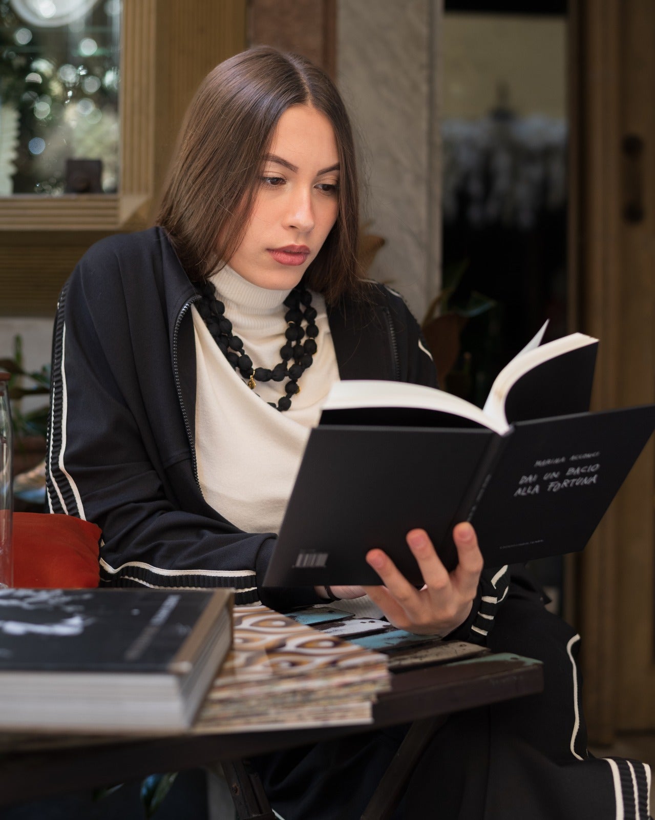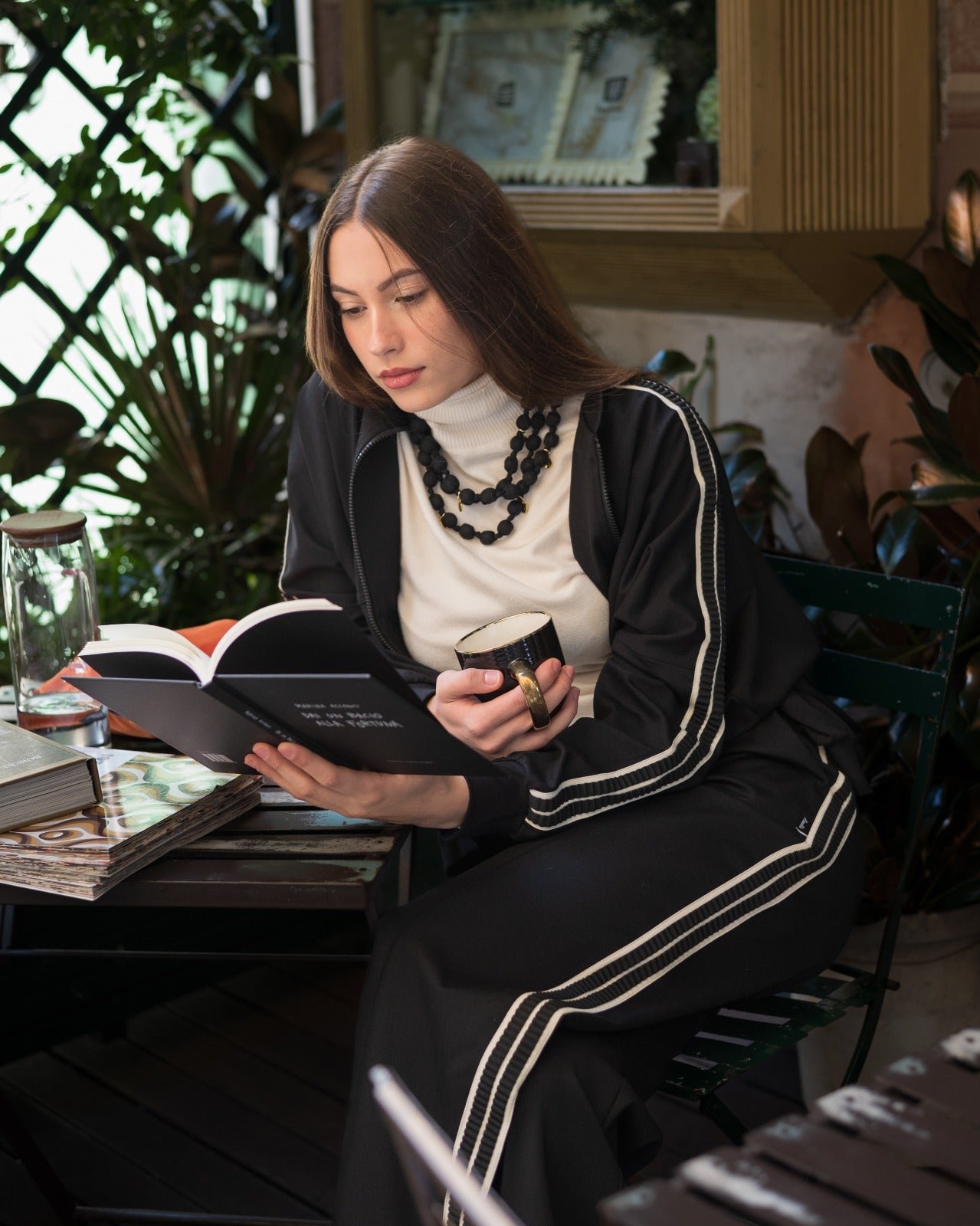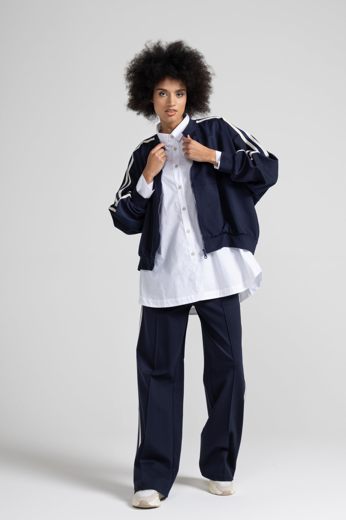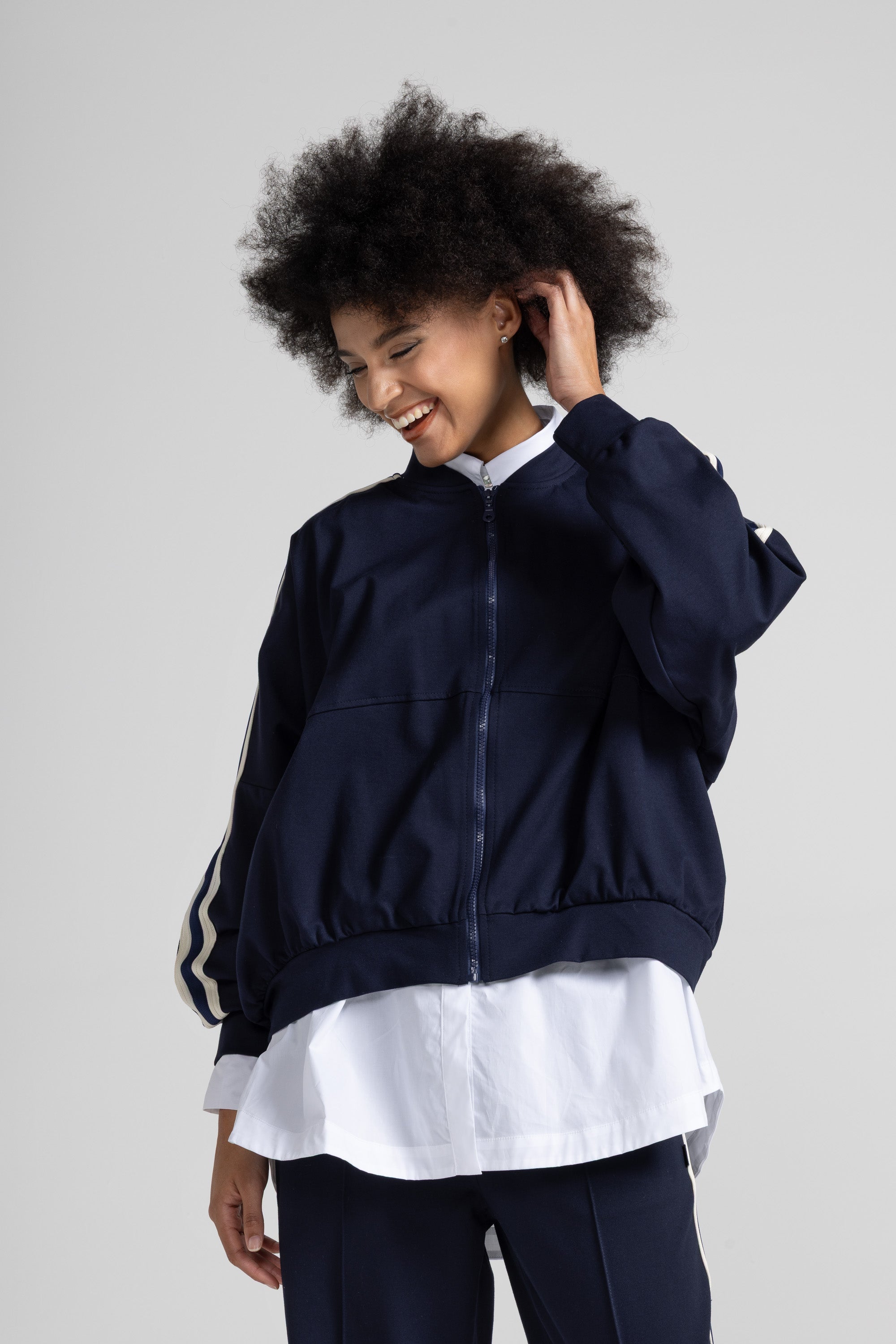 BOMBER IN PUNTO MILANO DI VISCOSA, DETTAGLIO TAGLIO CENTRALE RIBATTUTO, MANICA LUNGA, POLSO E FONDO RIBATTUTI ALTI, DETTAGLIO PASSAMANERIA SU LUNGHEZZA MANICA.