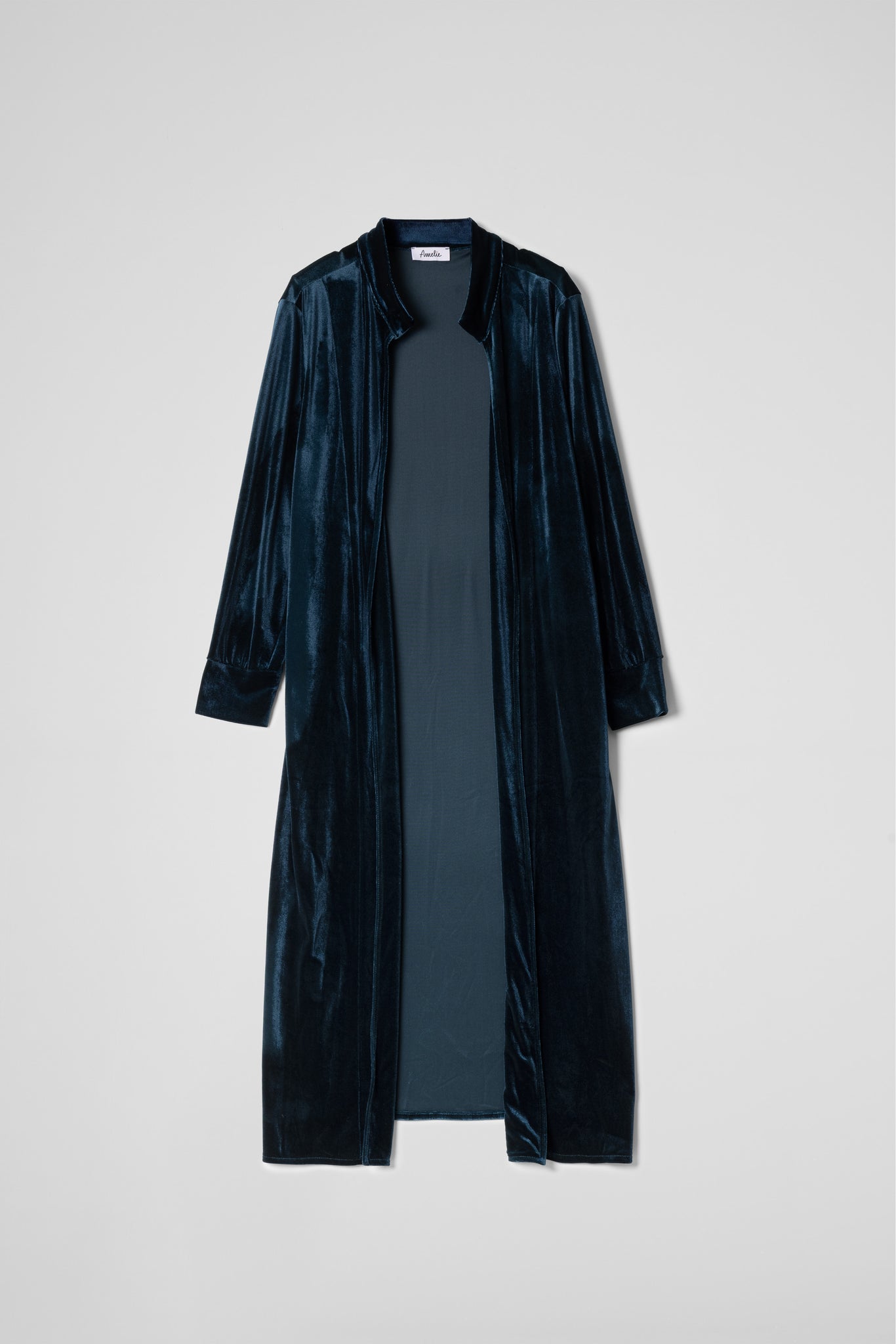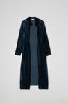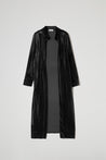 Soprabito lungo in morbido tessuto di velluto, raffinato e versatile, un modello elegante ma disinvolto, ideale per impreziosire qualsiasi outfit con un tocco di sofisticata luminosità.