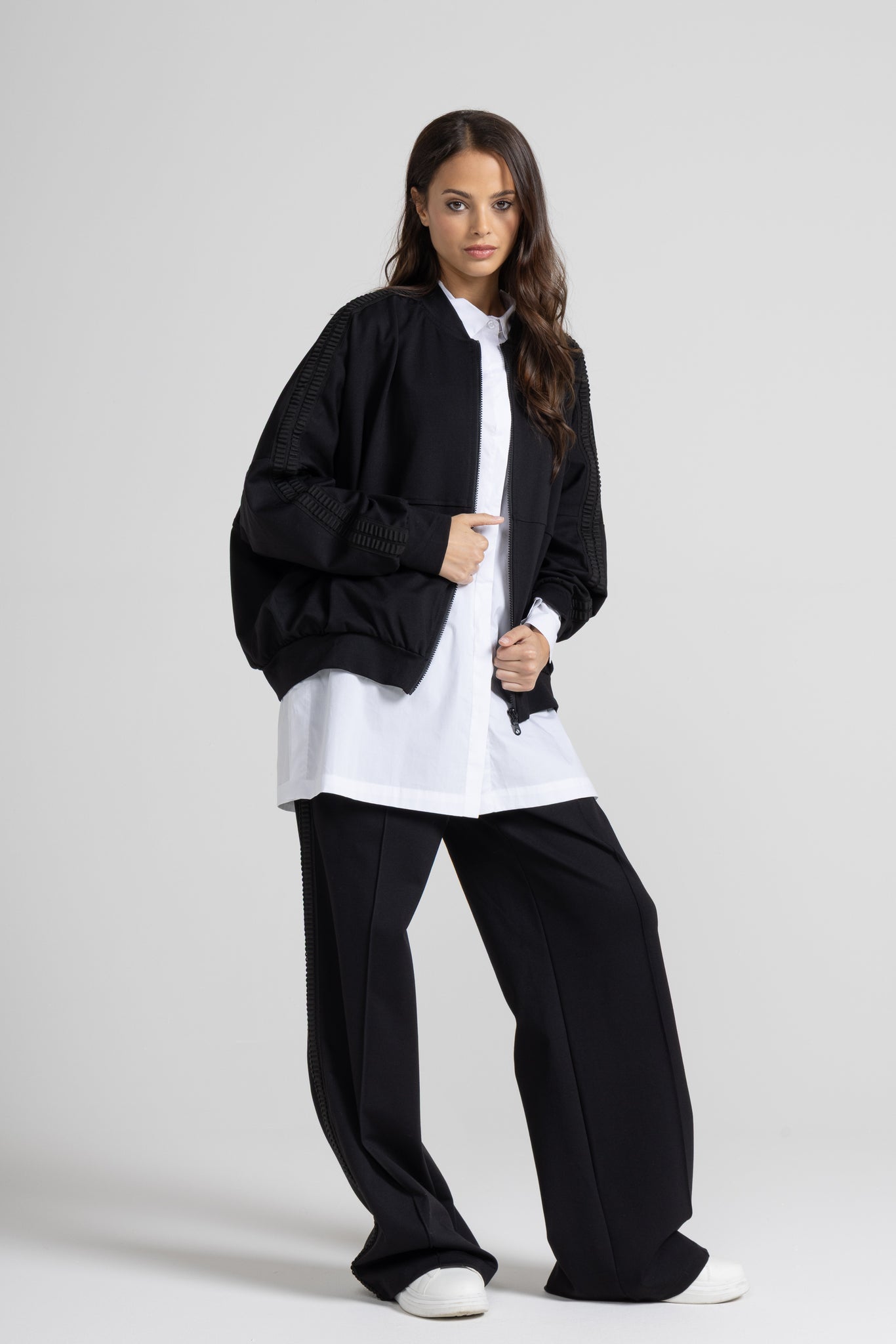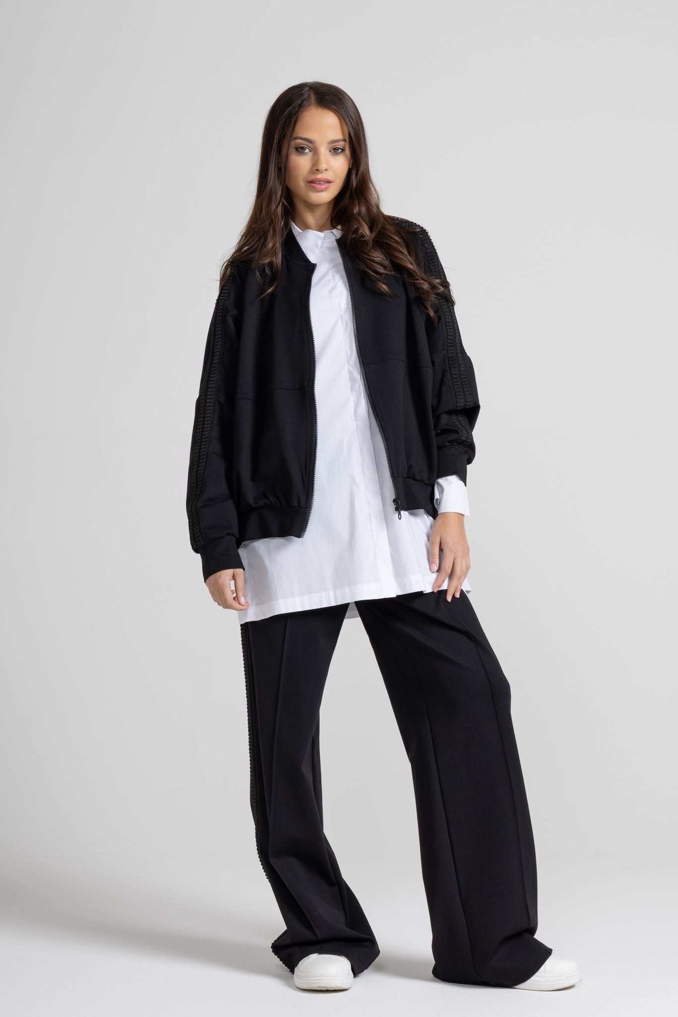 PANTALONE PALAZZO IN PUNTO MILANO DI VISCOSA, ELASTICO E COULISSE REGOLABILE IN VITA, DETTAGLIO PASSAMANERIA SULLA LUNGHEZZA DELLA GAMBA.