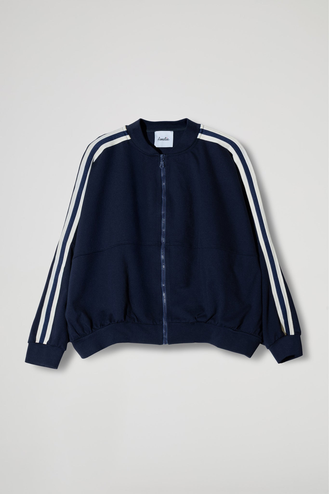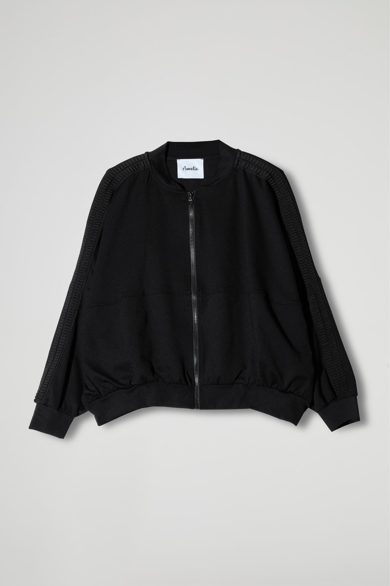 BOMBER IN PUNTO MILANO DI VISCOSA, DETTAGLIO TAGLIO CENTRALE RIBATTUTO, MANICA LUNGA, POLSO E FONDO RIBATTUTI ALTI, DETTAGLIO PASSAMANERIA SU LUNGHEZZA MANICA.