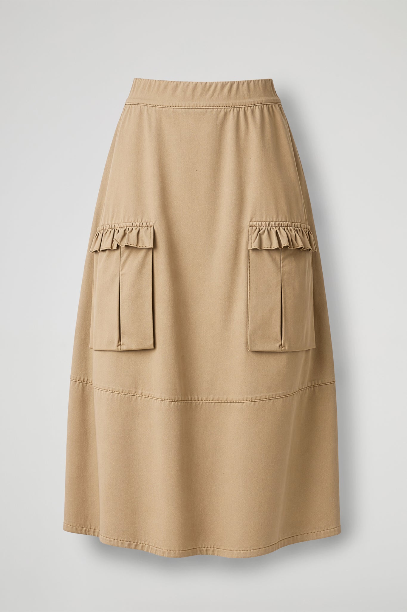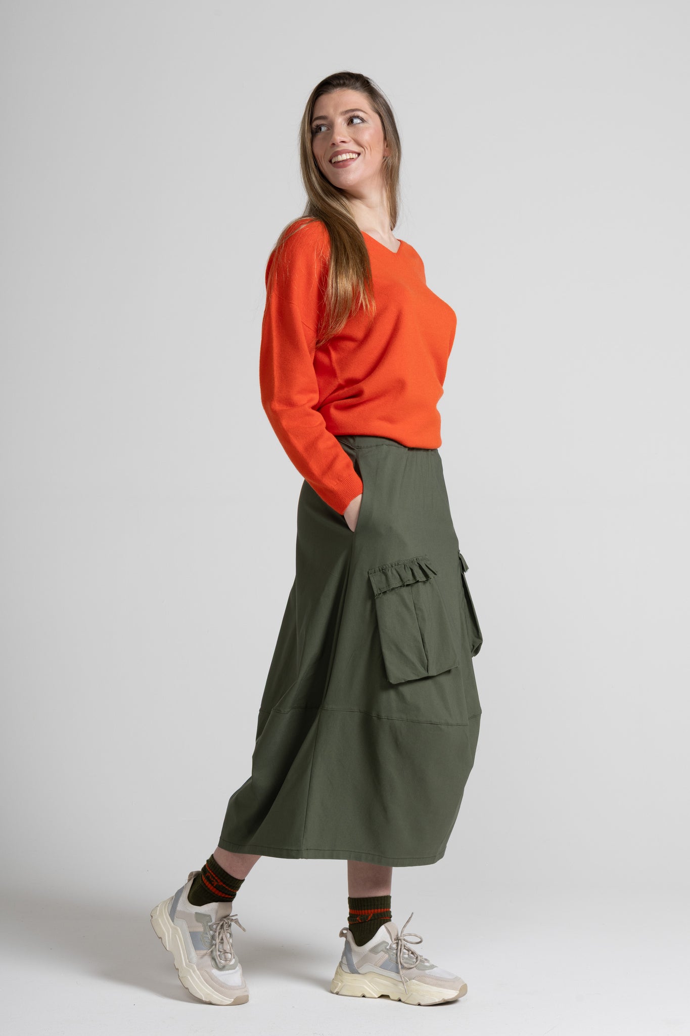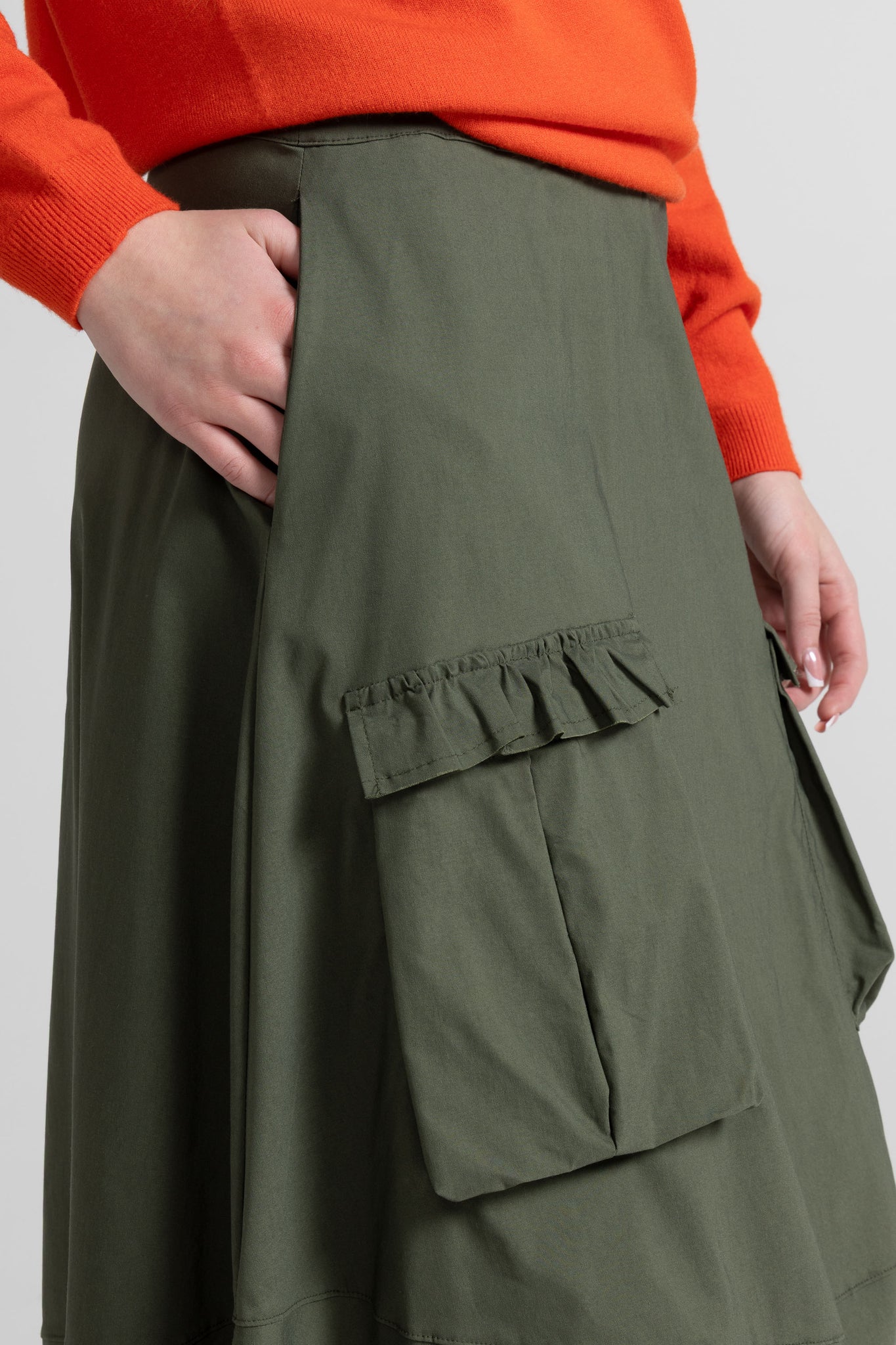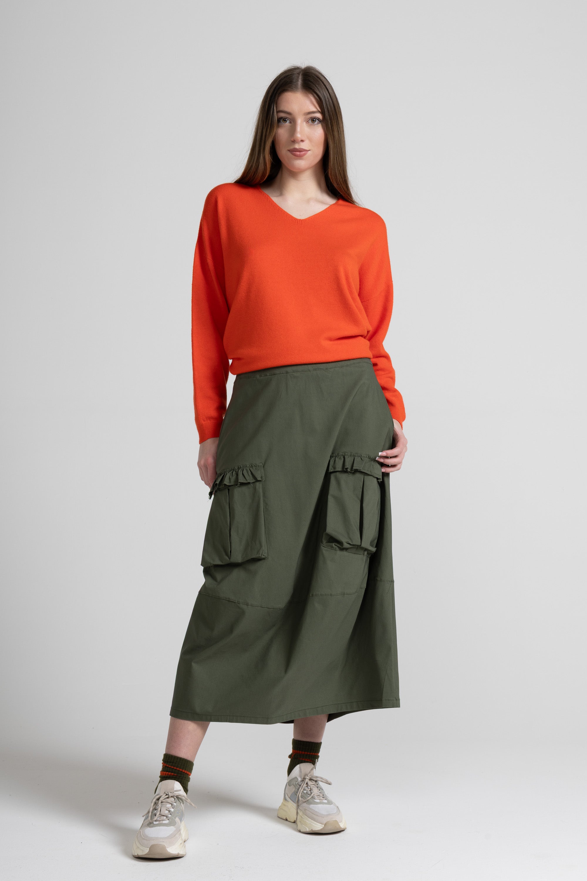 Gonna lunga dalla linea morbida e contemporanea, caratterizzata da un design utility rivisitato in chiave femminile. La silhouette è svasata e scivolata, con vita alta pulita e fascia confortevole. Sul davanti spiccano due maxi tasche applicate in stile cargo, rifinite da una balza arricciata sul bordo superiore che aggiunge un dettaglio delicato. Il modello è completato da un taglio orizzontale nella parte bassa che crea movimento e valorizza la caduta del capo.
