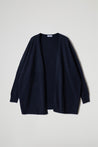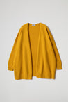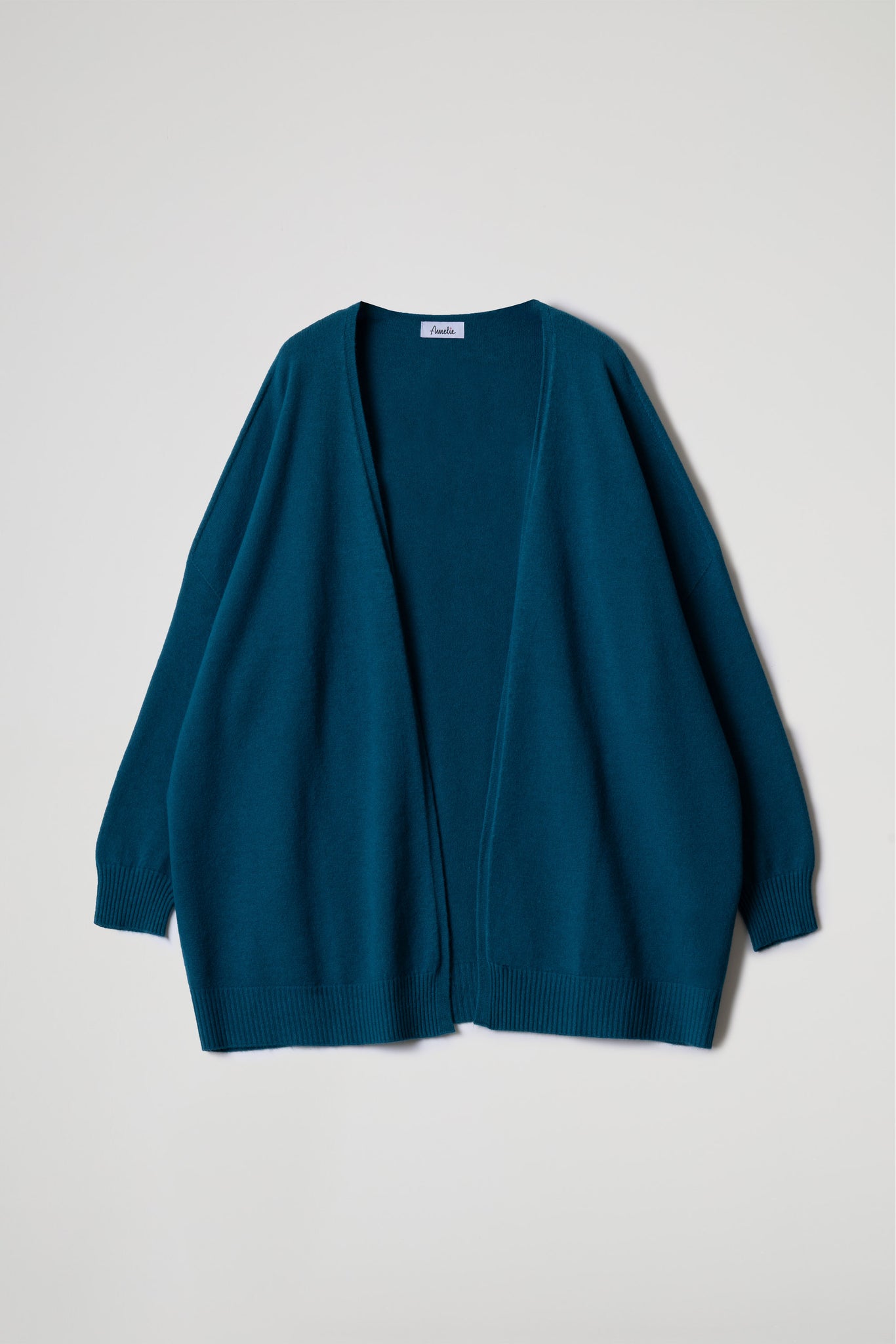 Cardigan  Over, apertura frontale senza bottoni con bordo rifinito con lavorazione pulita e lineare, spalle scese, manica lunga con polsino a coste, orlo ribattuto alto con dettaglio a coste. Linea ampia.
