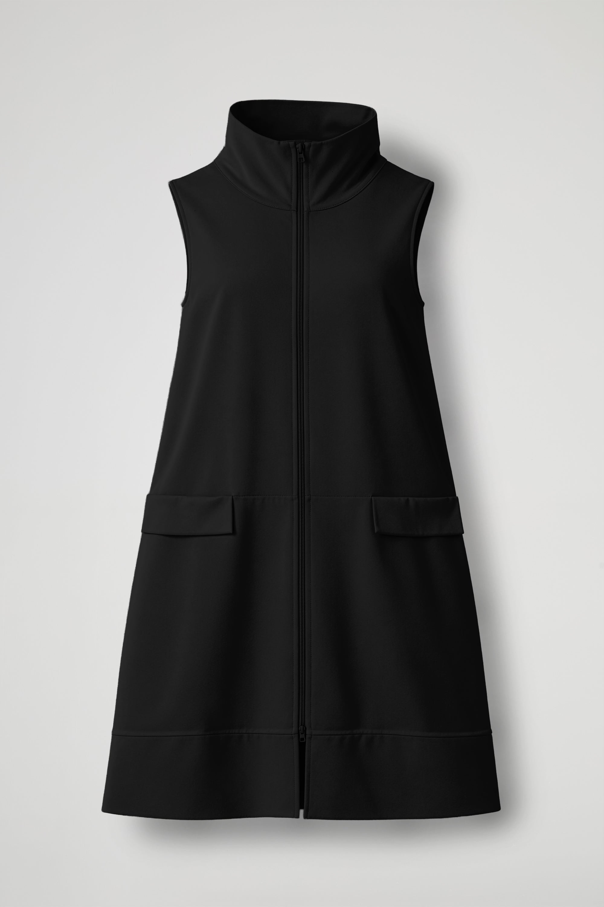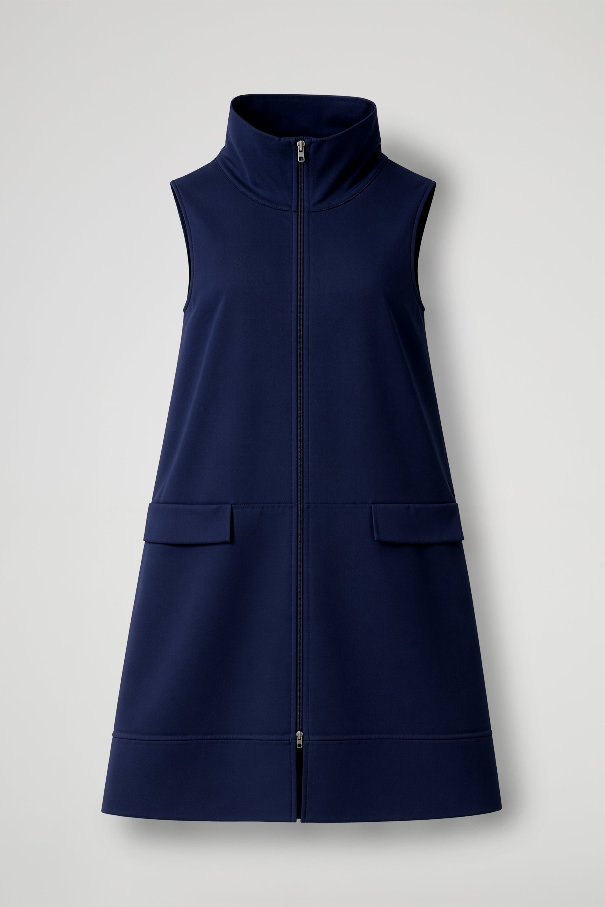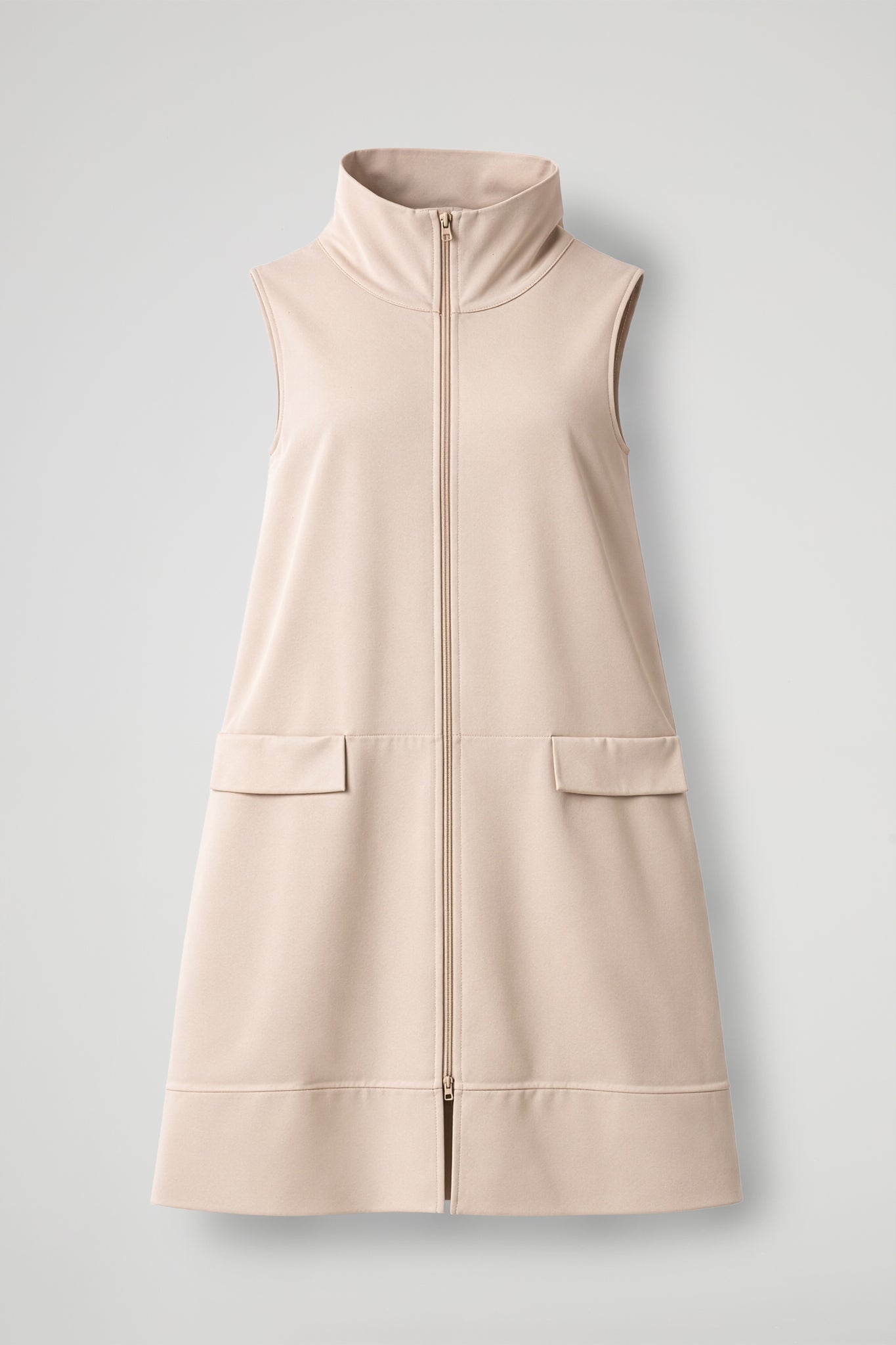 SPOLVERINO LUNGO SMANICATO IN TESSUTO PUNTO MILANO DI VISCOSA, AMPIO COLLO AD ANELLO, ZIP TONO SU TONO, TASCHE A TAGLIO CON PATTINA ROVESCIATA, FONDO RIBATTUTO ALTO. LINEA A TRAPEZIO