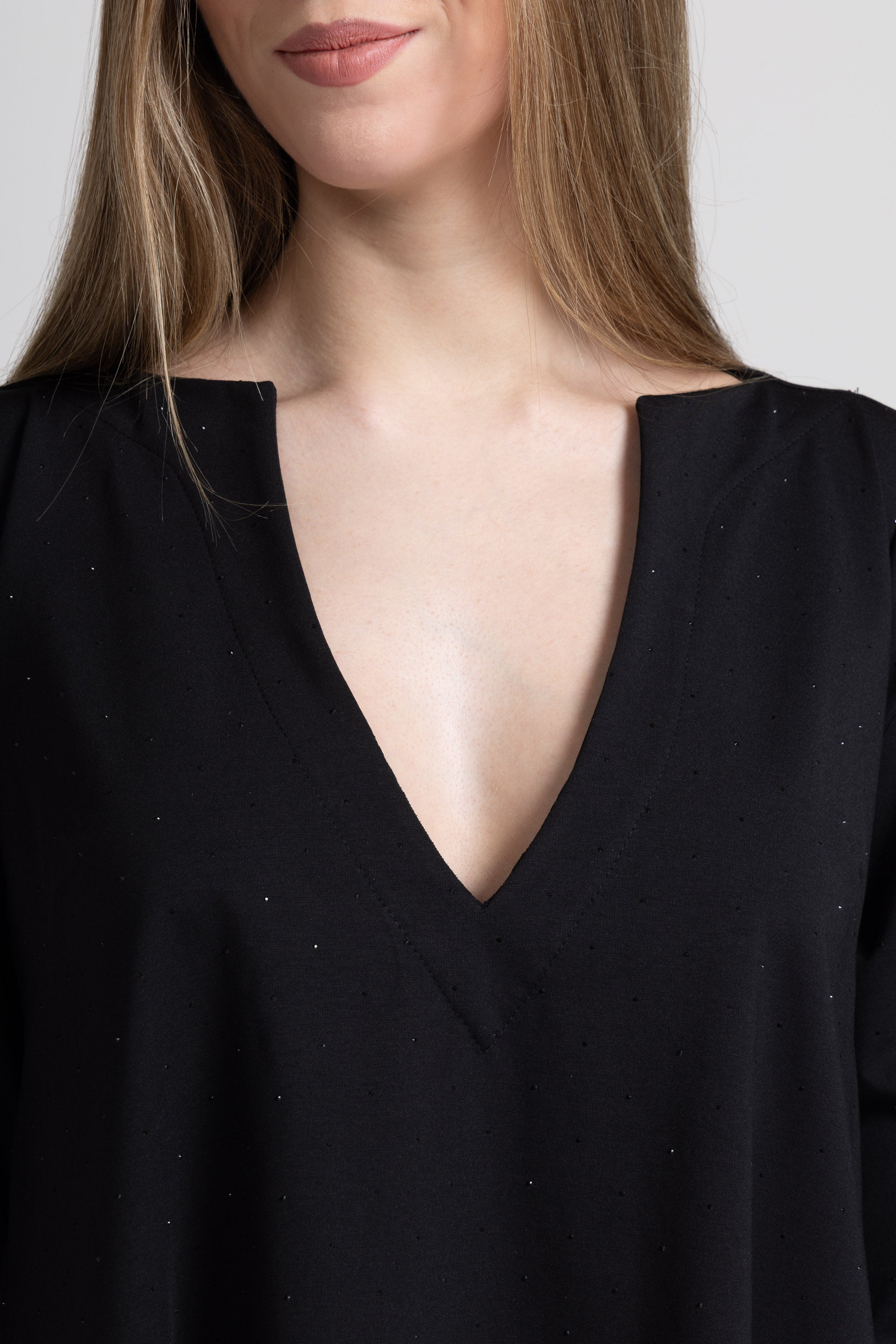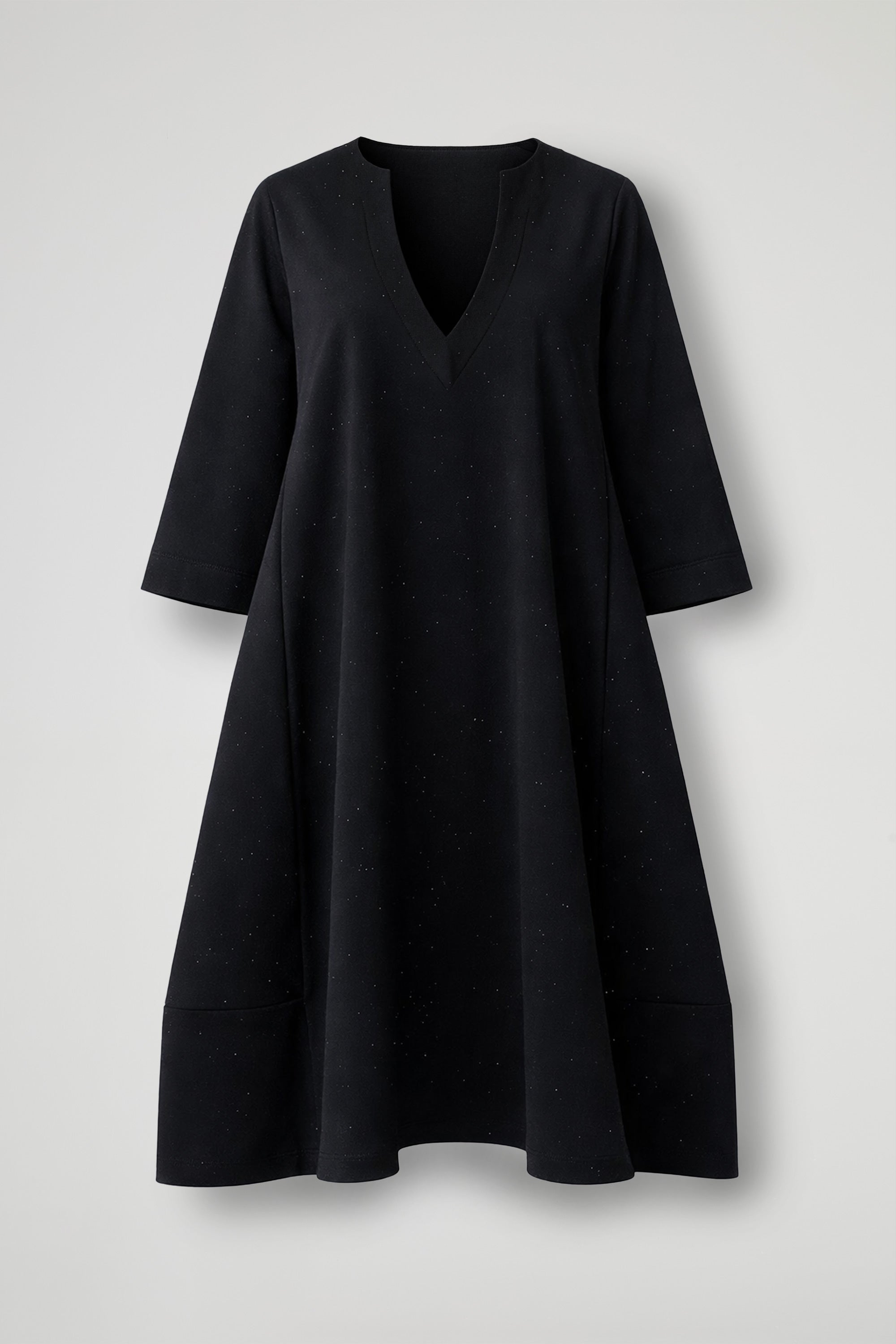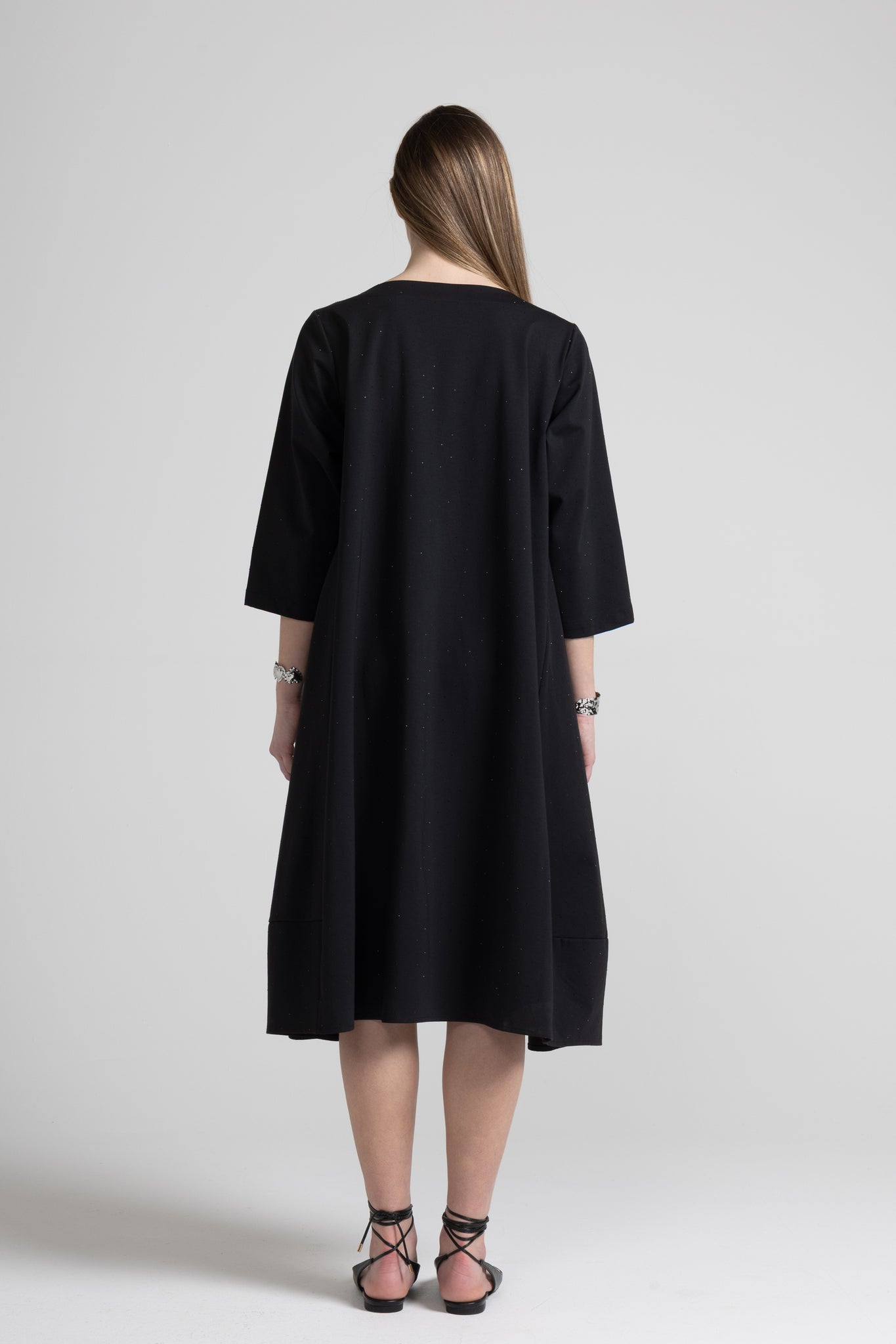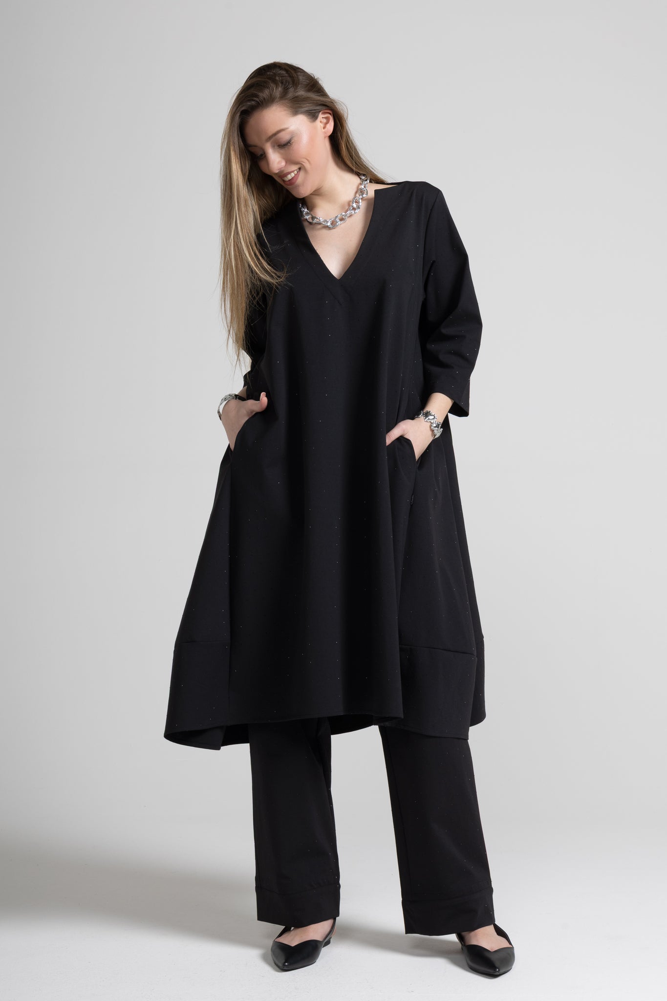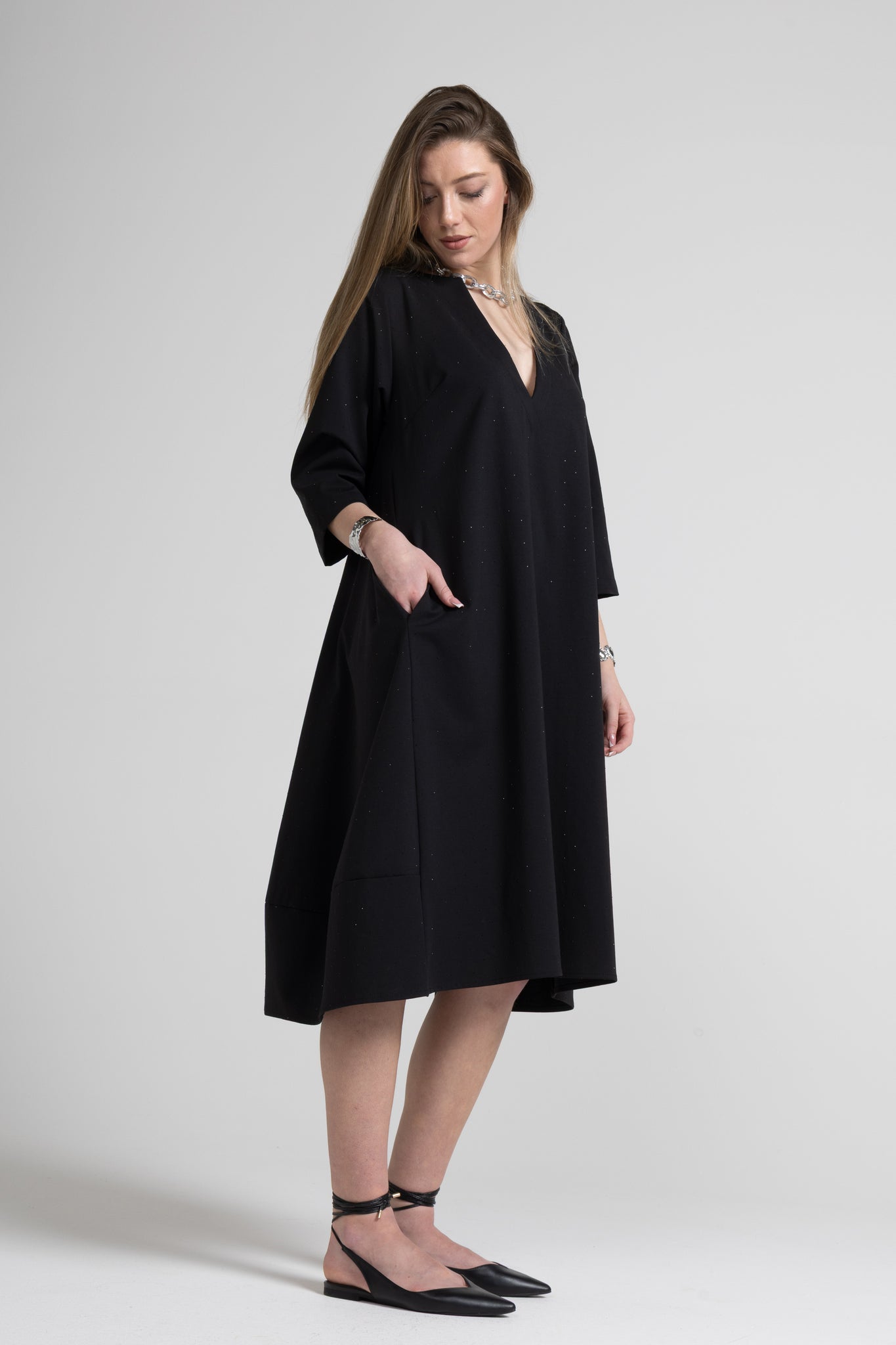 Abito midi in tessuto di viscosa con micro strass tono su tono, scollo a V profondo, manica a 3/4,tasche a filo, linea a trapezio con taglio a triangolo sul fianco. Linea ampia