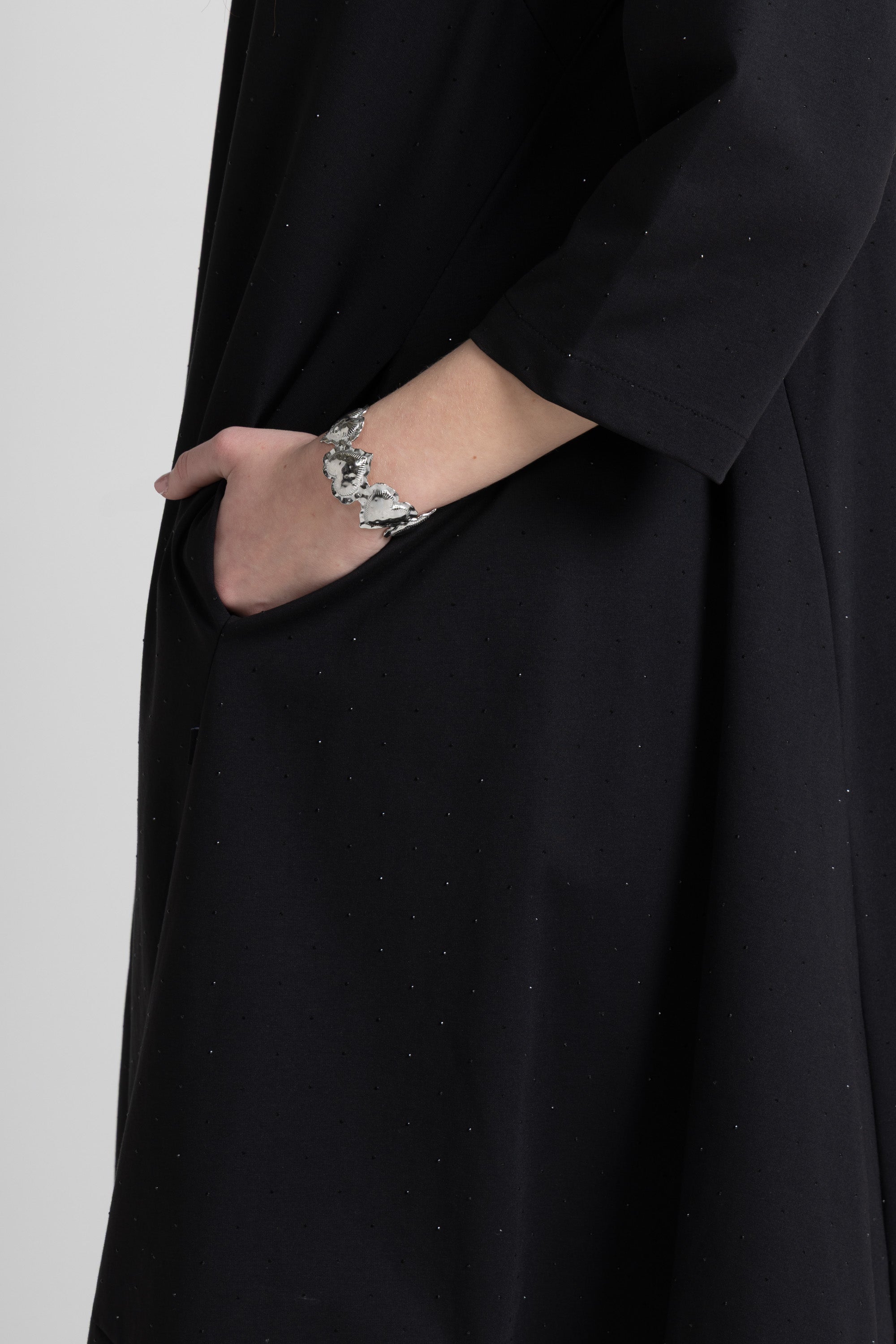 Abito dal fascino essenziale, illuminato da delicati micro strass che regalano un effetto luminoso elegante e discreto. Linea a trapezio che cade leggera sul corpo.