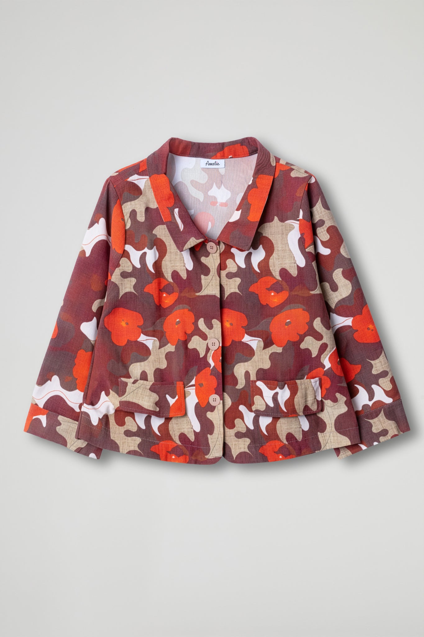 Giacca corta , stampa all-over camo-floreale, collo a rever, chiusura frontale con 3 bottoni, 2 tasche applicate sul davanti co patta, maniche lunghe con bordatura alta, fondo leggermente arrotondato