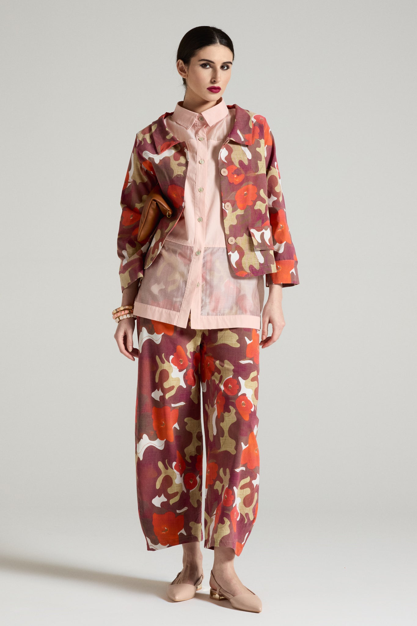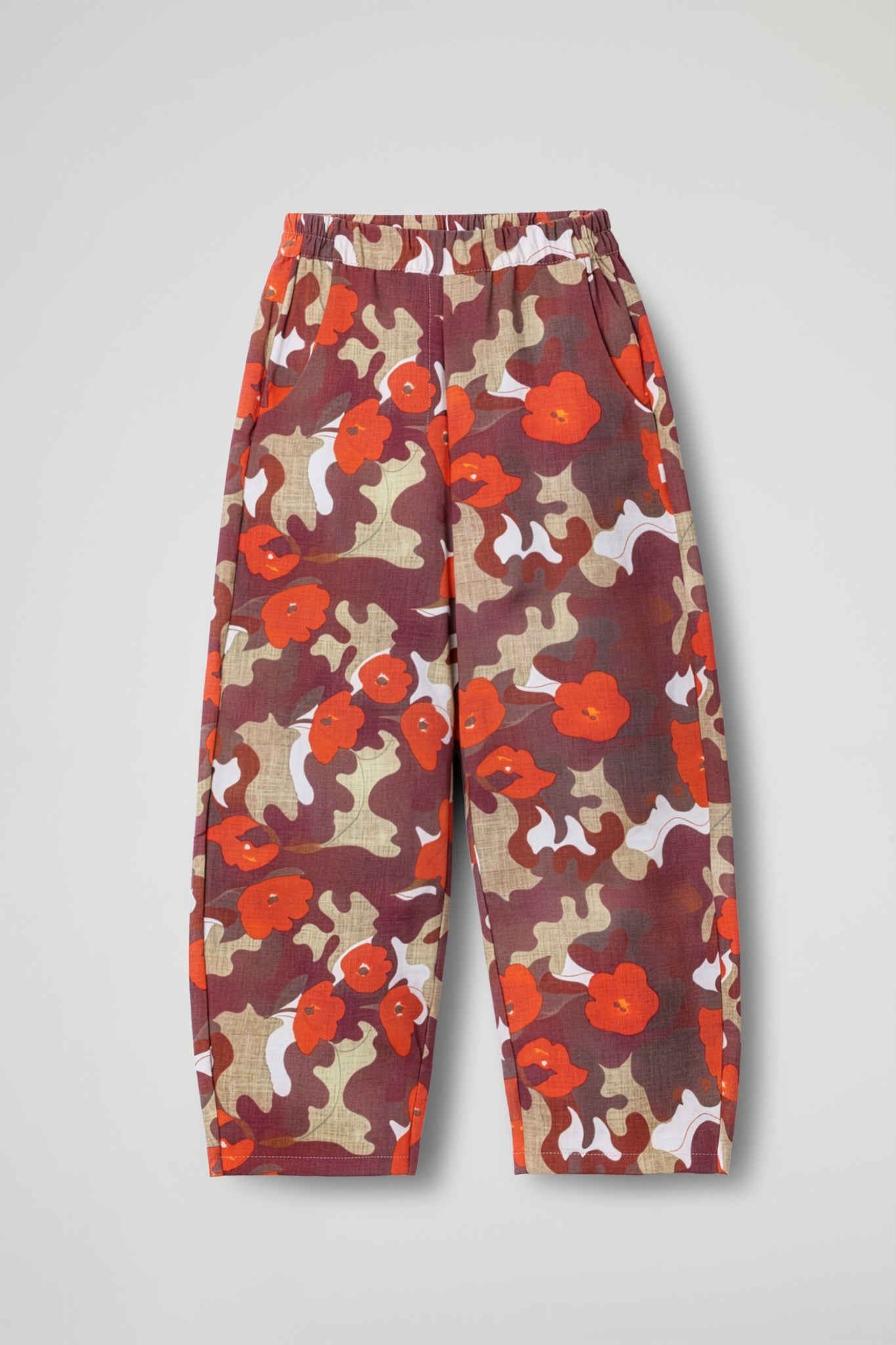 Pantalone baggy dalla stampa camo-floreale e dal tessuto leggero piacevole da indossare, fascia elastica in vita , gamba morbida e ampia che valorizza la silhouette con un effetto rilassato ma curato.