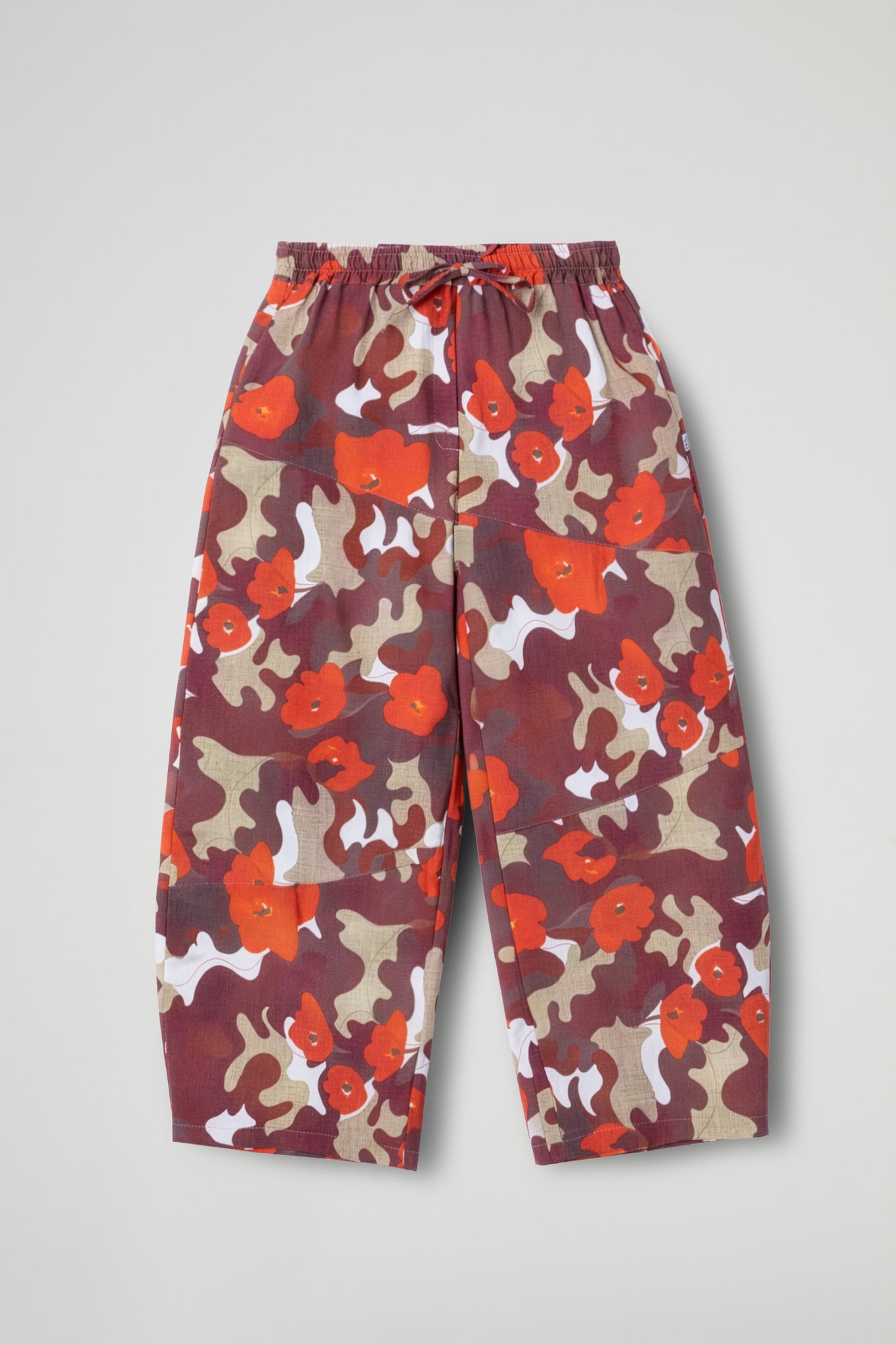 Pantaloni baggy dalla stampa camo-floreale e dal tessuto leggero piacevole da indossare .La vita elasticizzata si adatta perfettamente e la coulisse permette di regolare la vestibilità, mentre la gamba morbida e ampia scende fluida e valorizza la silhouette con un effetto rilassato ma curato; i tagli diagonali a pannelli con impunture a vista donano un tocco moderno e strutturato d’impatto.