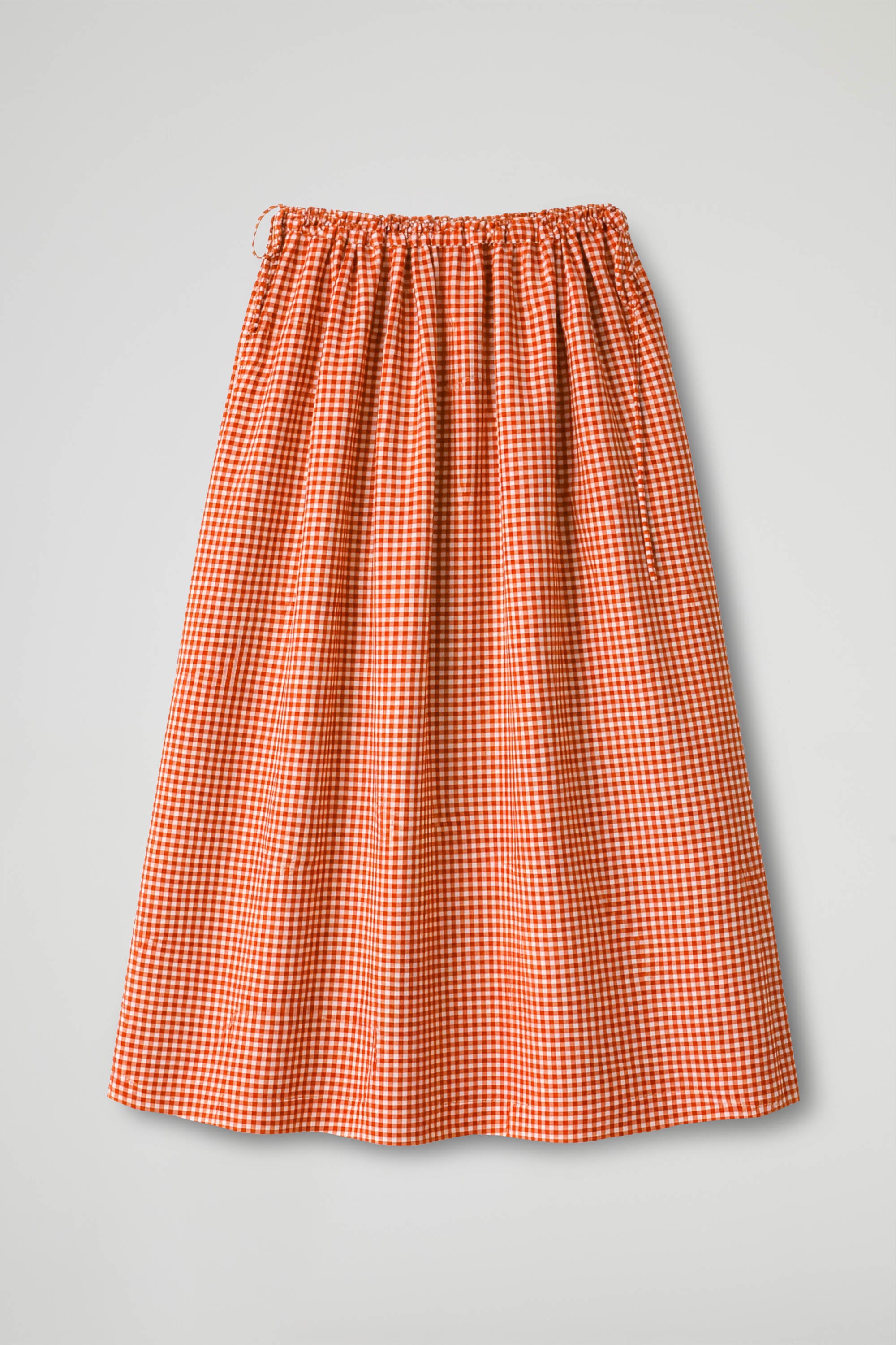 Gonna lunga a portafoglio, realizzata in fantasia vichy a quadretti, avvolge la silhouette valorizzando la figura; la chiusura è regolabile con laccetti che consente una vestibilità personalizzata, la linea è morbida e svasata.