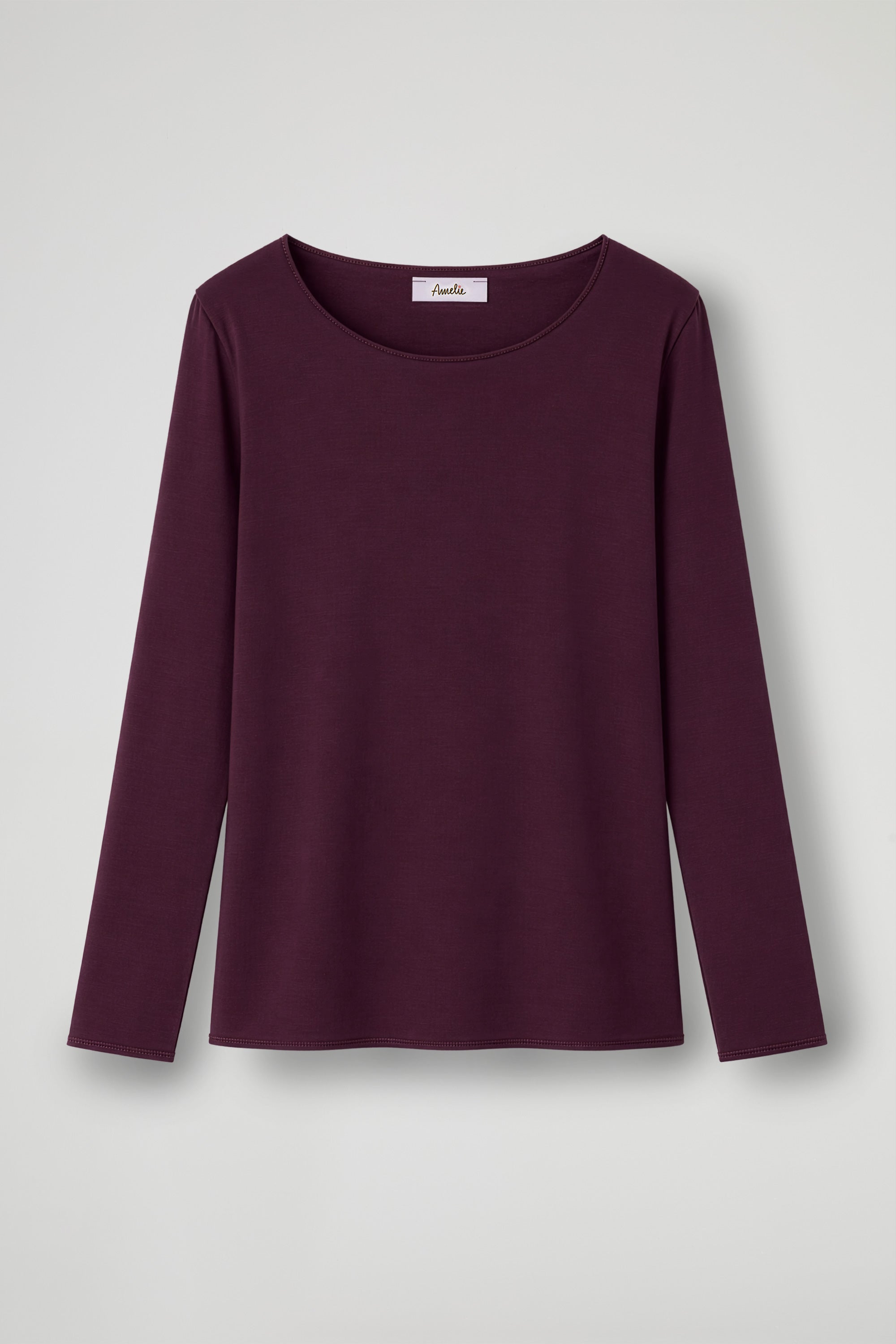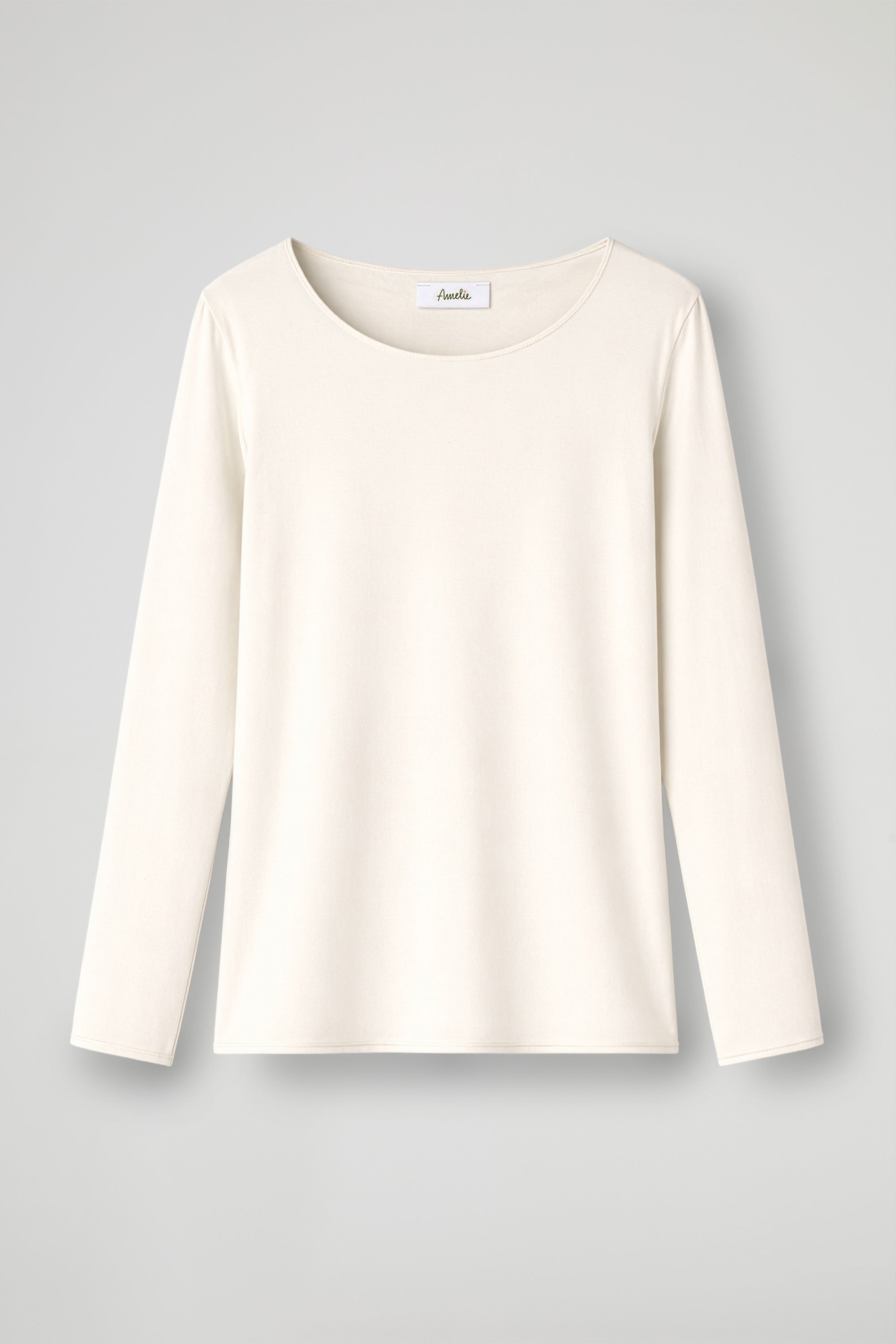 Maglia a maniche lunghe dal design essenziale ed elegante, realizzata in tessuto morbido e confortevole. Il modello presenta uno scollo ampio e arrotondato che valorizza il décolleté, con una vestibilità fluida che cade delicatamente sul corpo; Ideale da indossare da sola o come base sotto giacche e cardigan.