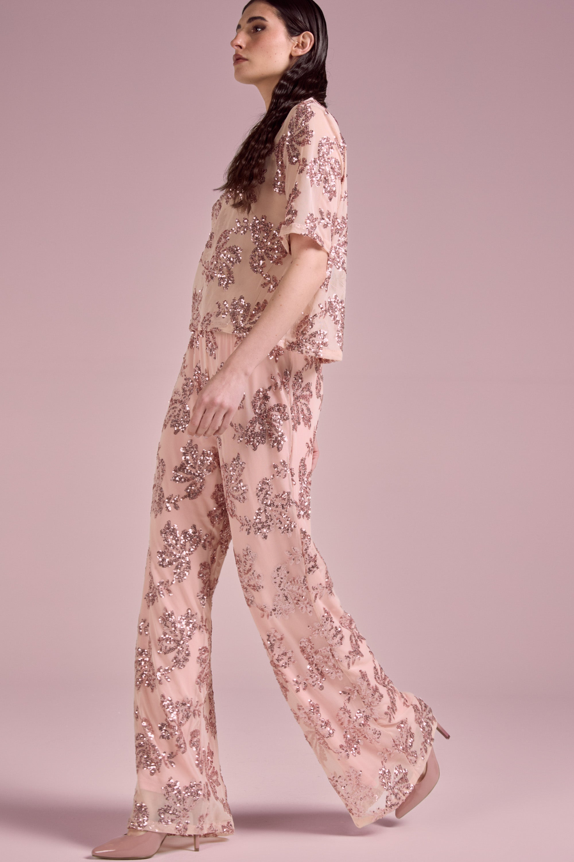 Top elegante dal design luminoso e raffinato, realizzato in tessuto leggero impreziosito da ricami in paillettes con motivo floreale all-over; Il modello presenta una linea morbida e leggermente boxy, con maniche corte e girocollo, per una vestibilità confortevole e contemporanea. La lavorazione ricercata dona brillantezza e rende il capo ideale per occasioni speciali o per creare outfit sofisticati .