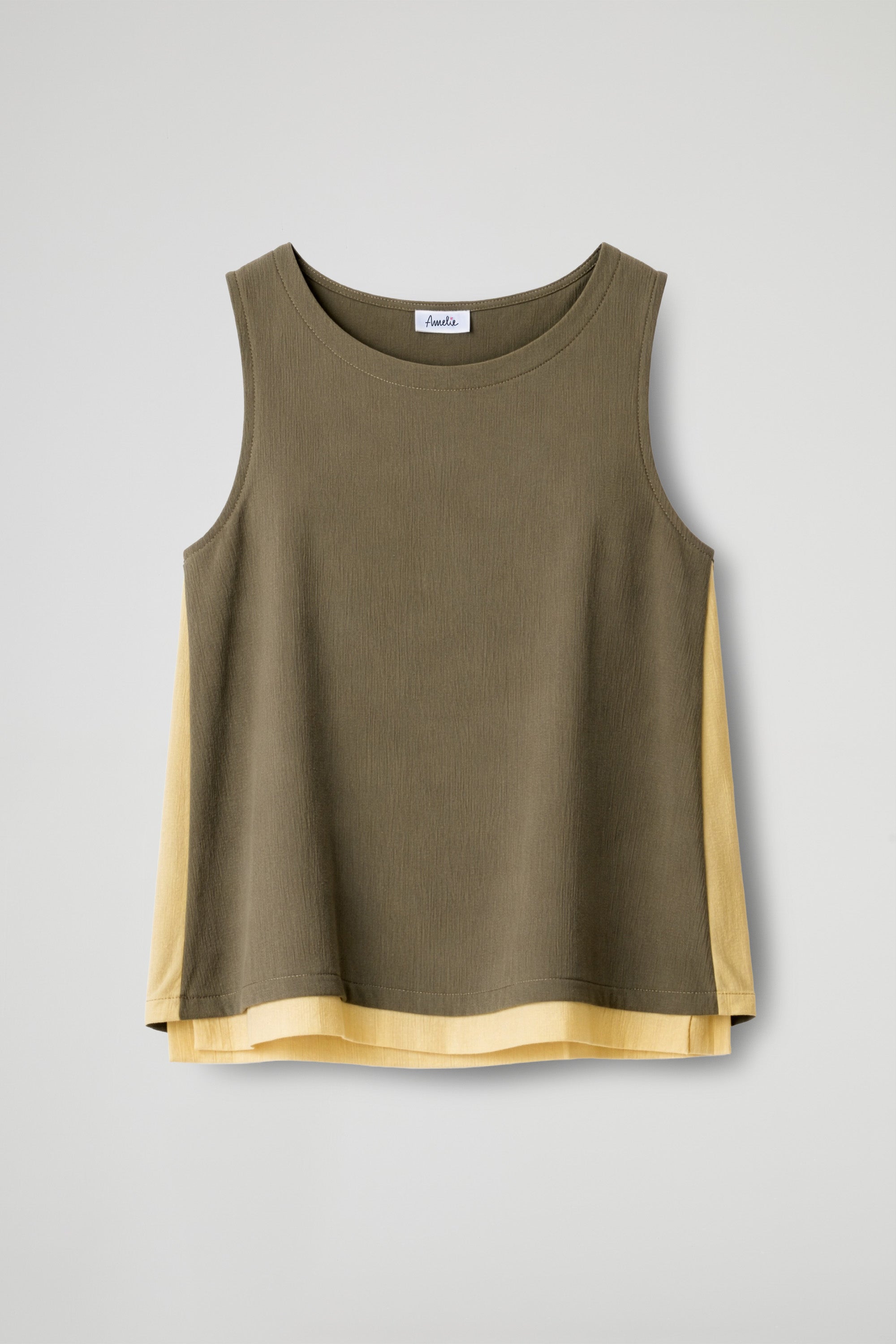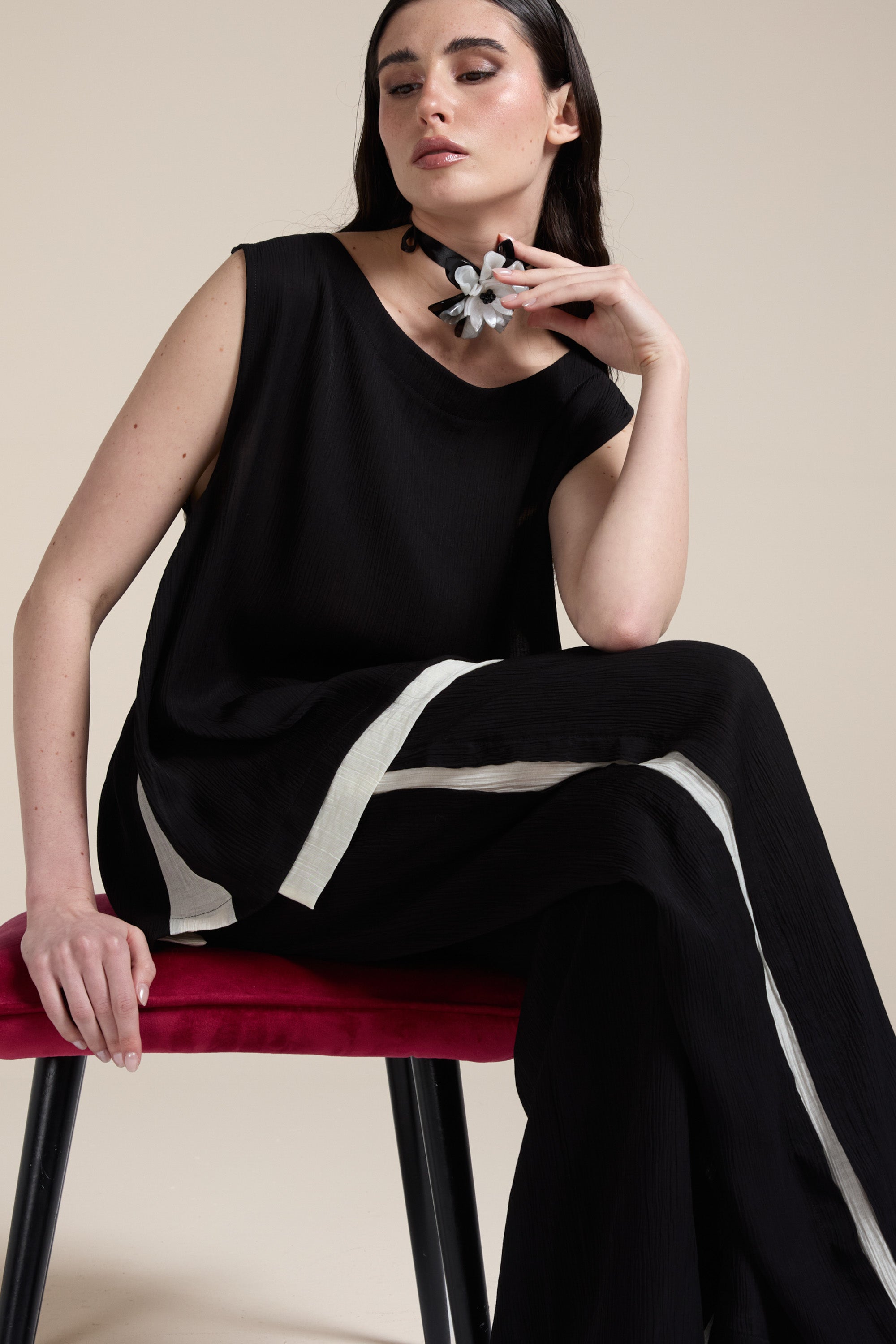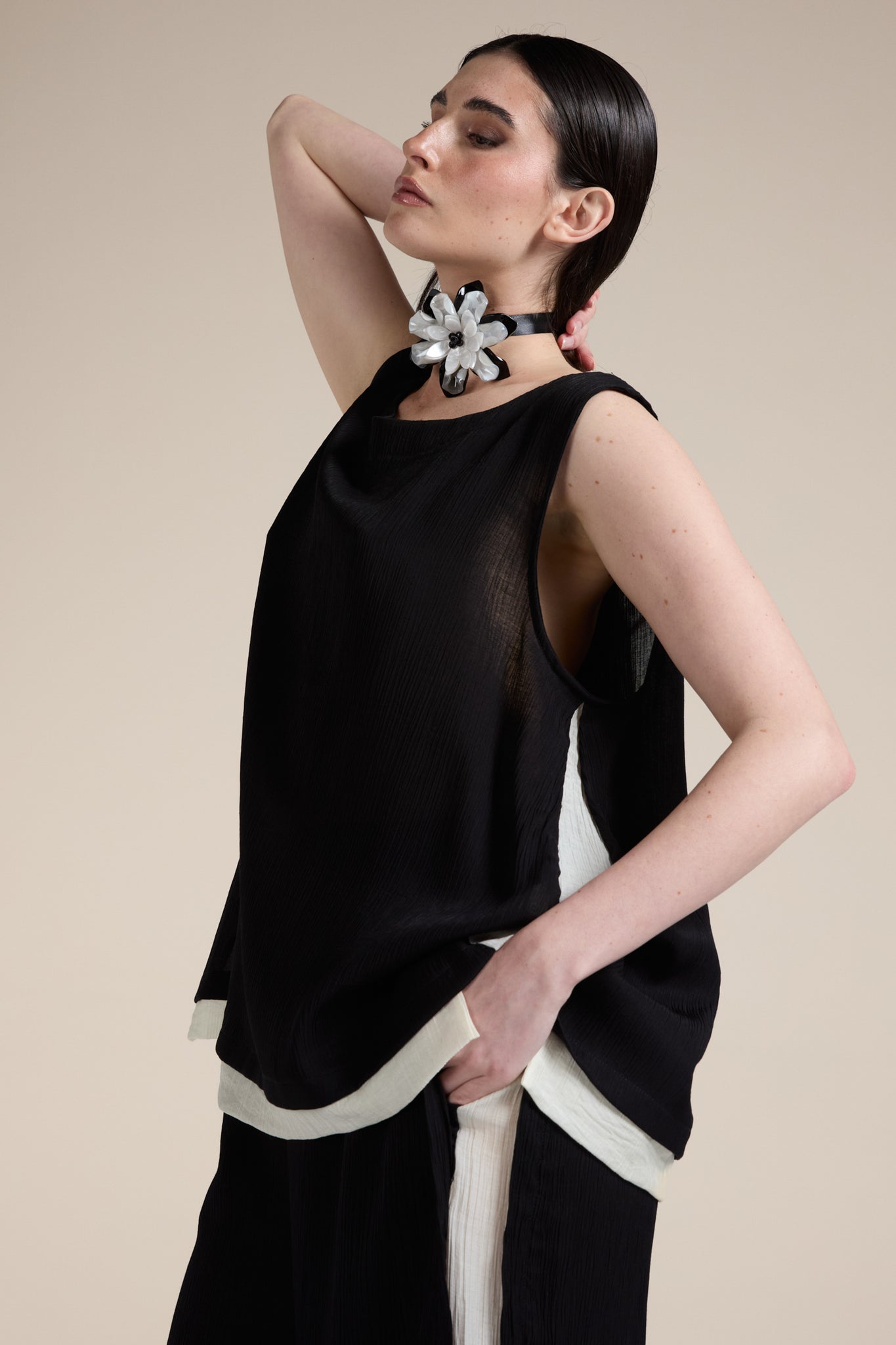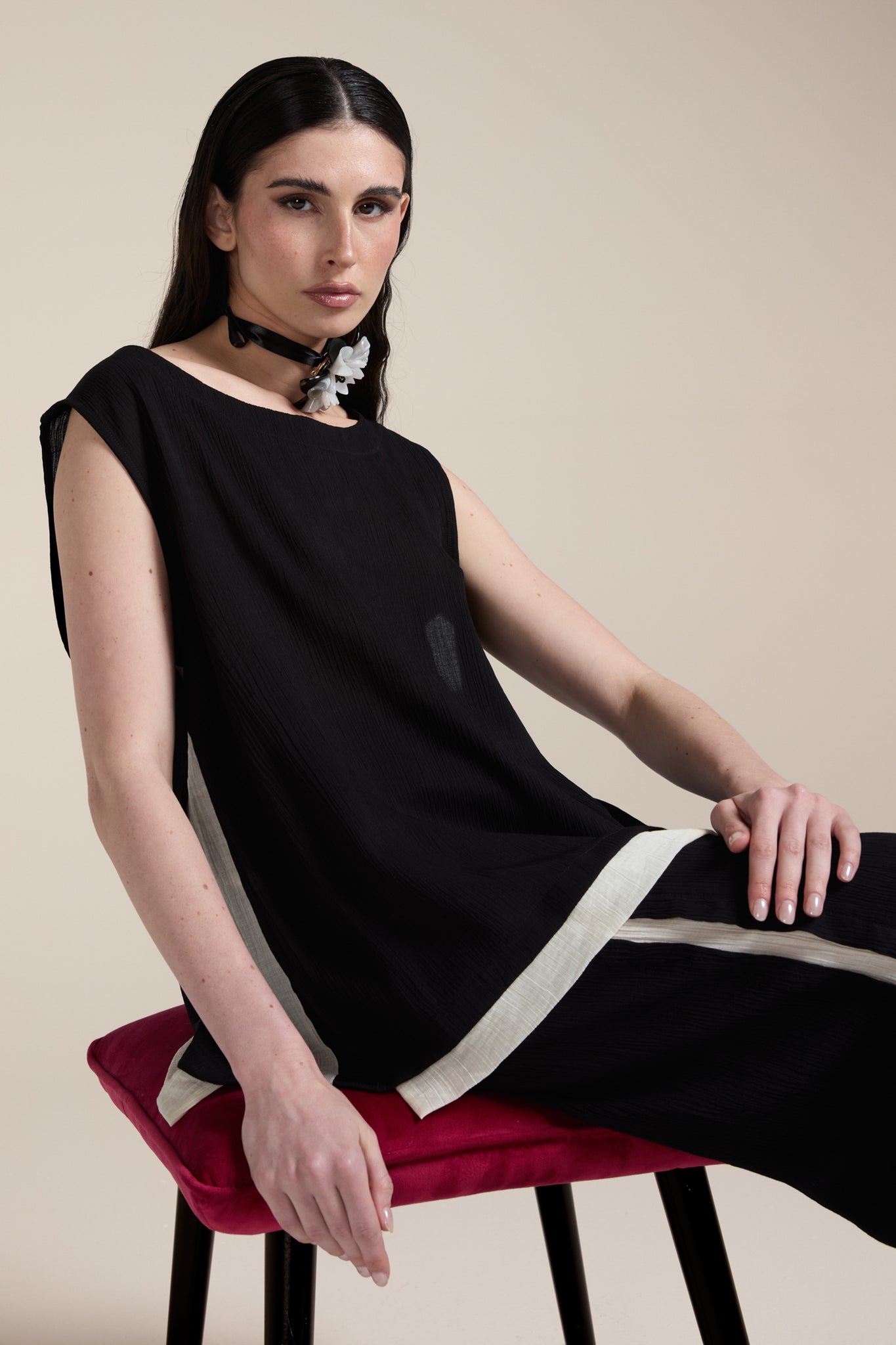 Top smanicato dal design contemporaneo, realizzato in tessuto leggero e leggermente trasparente, con una texture delicatamente stropicciata che dona movimento al capo; Il modello presenta uno scollo rotondo e una linea morbida e fluida, pensata per offrire comfort e vestibilità rilassata; il capo è valorizzato da inserti a contrasto in tonalità più chiare lungo i fianchi e il fondo, che creano un elegante gioco cromatico.
