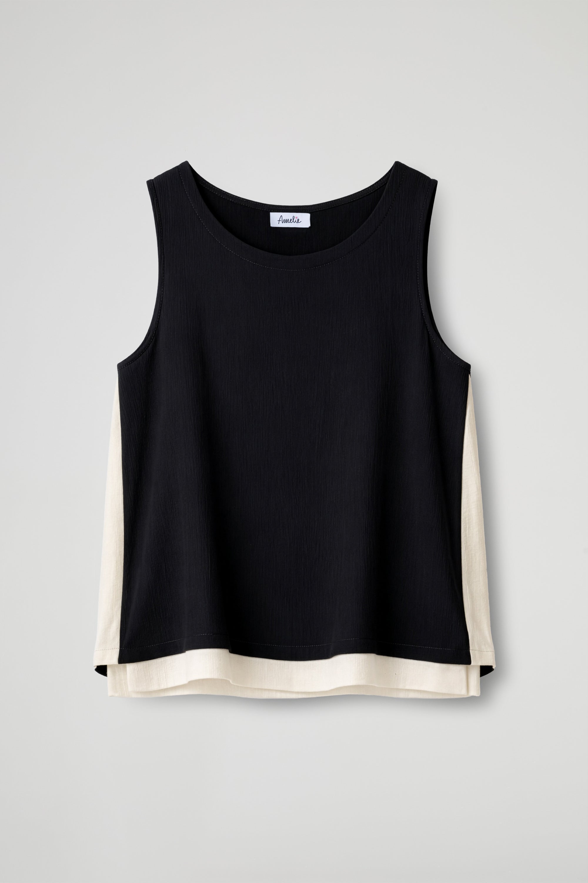 Top smanicato over e asimmetrico, scollo ampio ribattuto, dettaglio a contrasto su fianco e fondo. Linea ampia