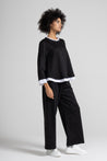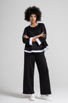 Pantalone a palazzo, elastico e coulisse regolabile in vita, tasche a filo, taglio a V sul retro, impuntura su gamba.