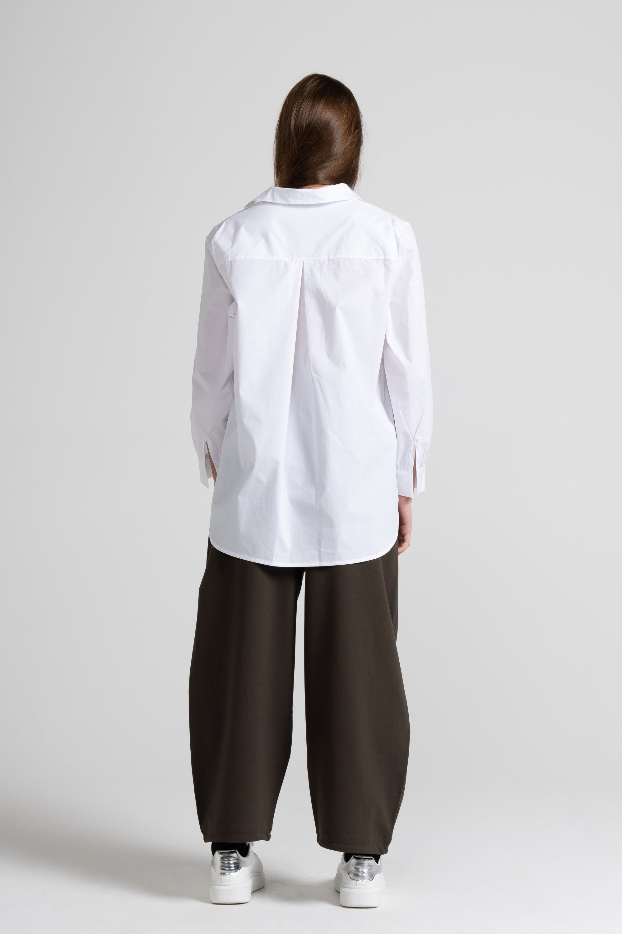 Camicia Over, un capo iconico reinterpretato con eleganza contemporanea, la sua linea pulita e il caratteristico orlo a petalo donano un movimento delicato e femminile, offre una vestibilità fluida e confortevole.