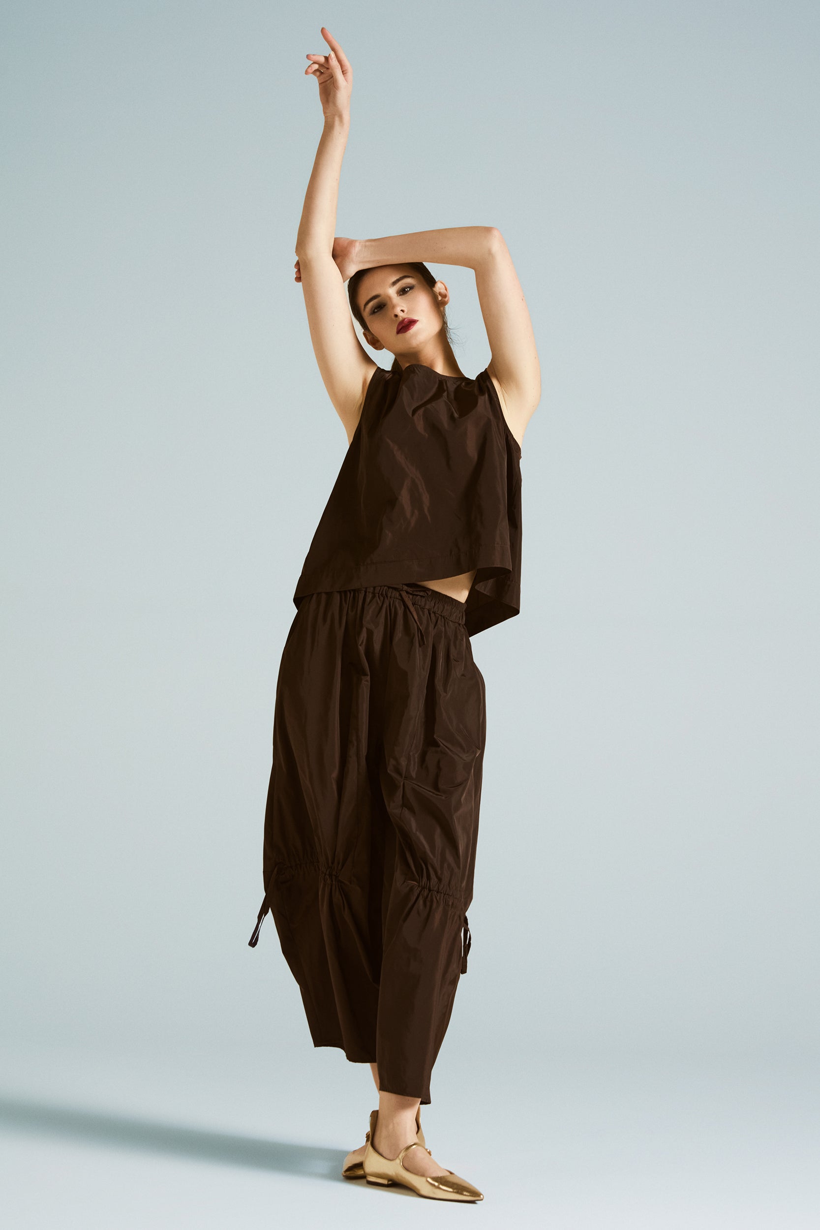 Pulito, moderno e super versatile: questo top smanicato è realizzato in tessuto tecnico effetto nacré, con una finitura leggermente luminosa che illumina il look con discrezione. La linea morbida e minimale lo rende perfetto da indossare ogni giorno, mentre il taglio essenziale lo trasforma in un alleato ideale anche per outfit più chic.