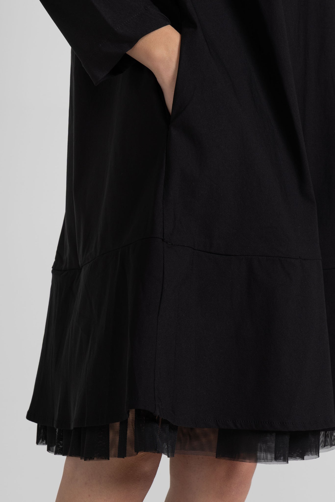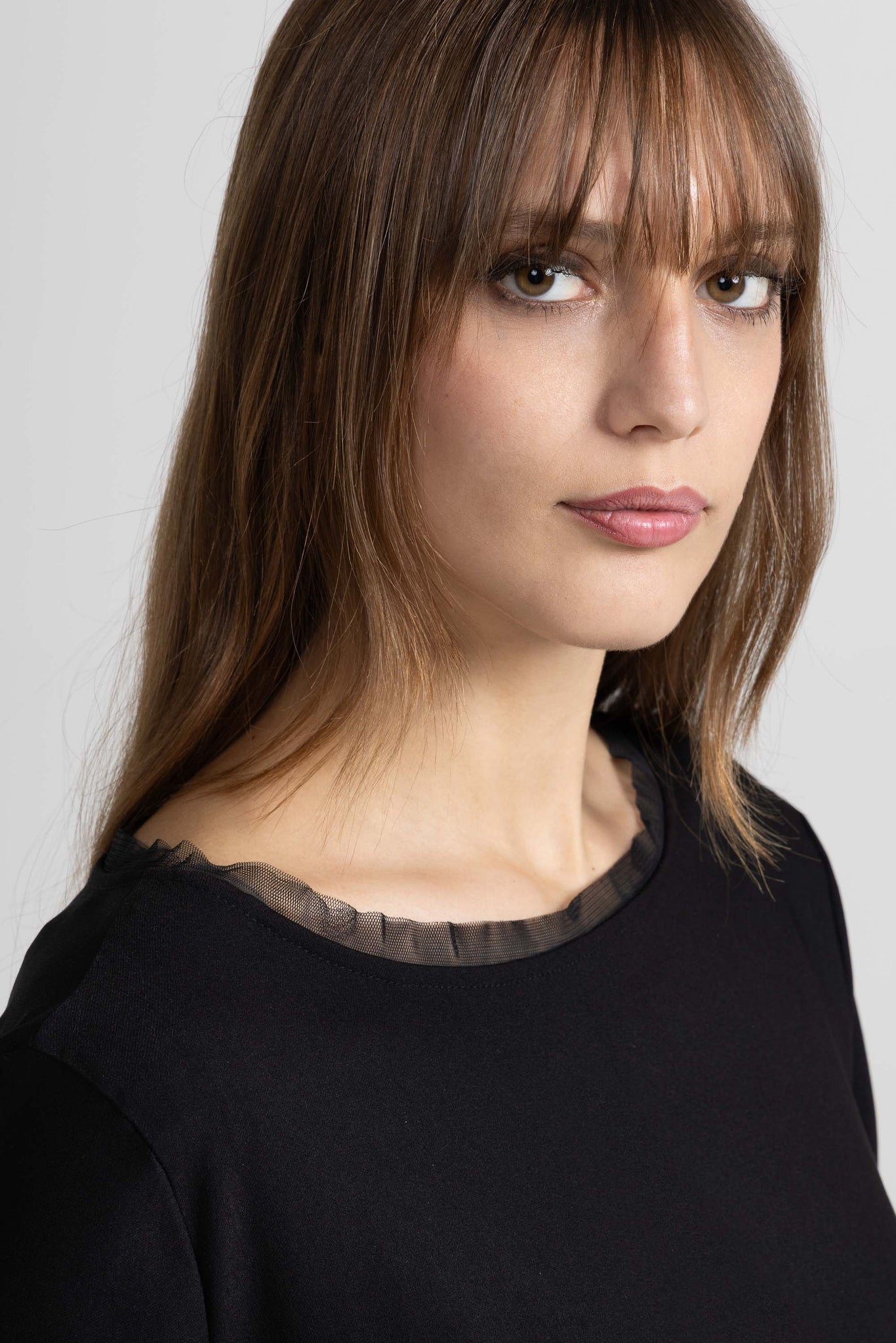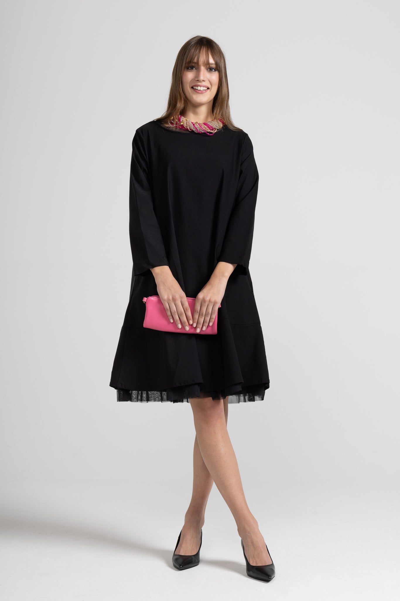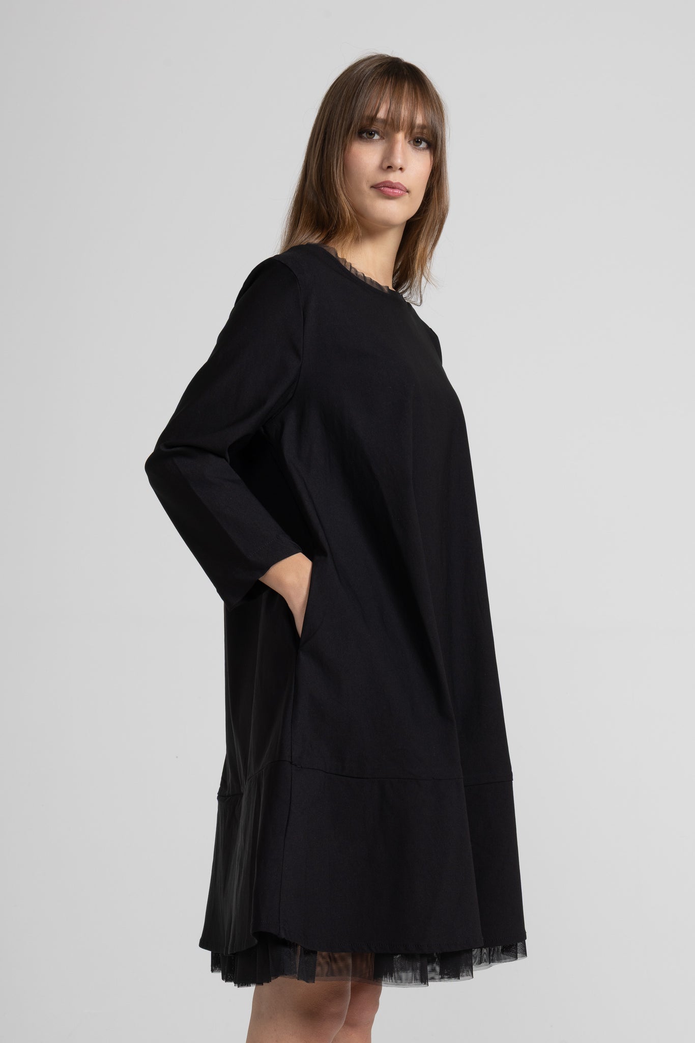 Midi dress in stretch viscose bengaline fabric, crew neck finished with tulle insert, long sleeves, welt pockets, flared line with slightly asymmetrical hem, decorative stitching at the bottom, tulle detail at the hem that adds a touch of lightness and refinement to the dress, giving it a feminine and modern look.