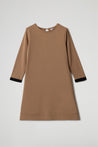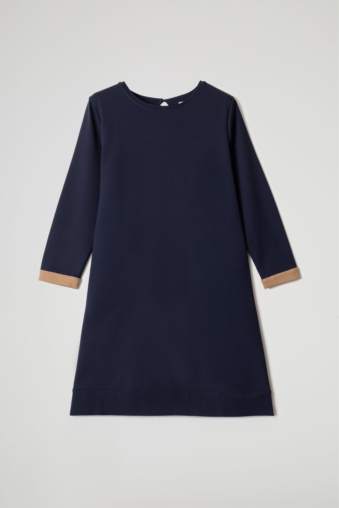 Midi dress, stretch viscose fabric, clean crew neck, teardrop opening on the back with small central button, long sleeves finished with contrasting color cuff, side welt pockets, A-line cut, high folded hem at the bottom.