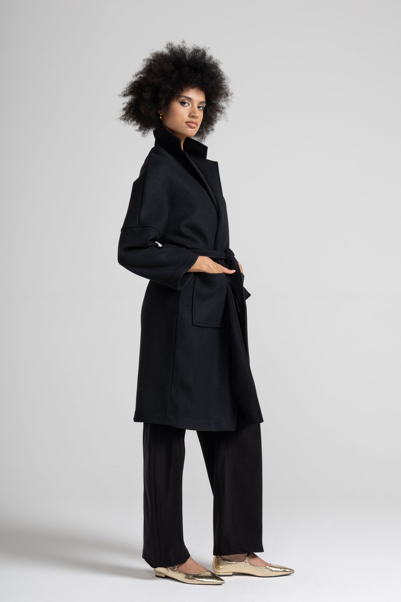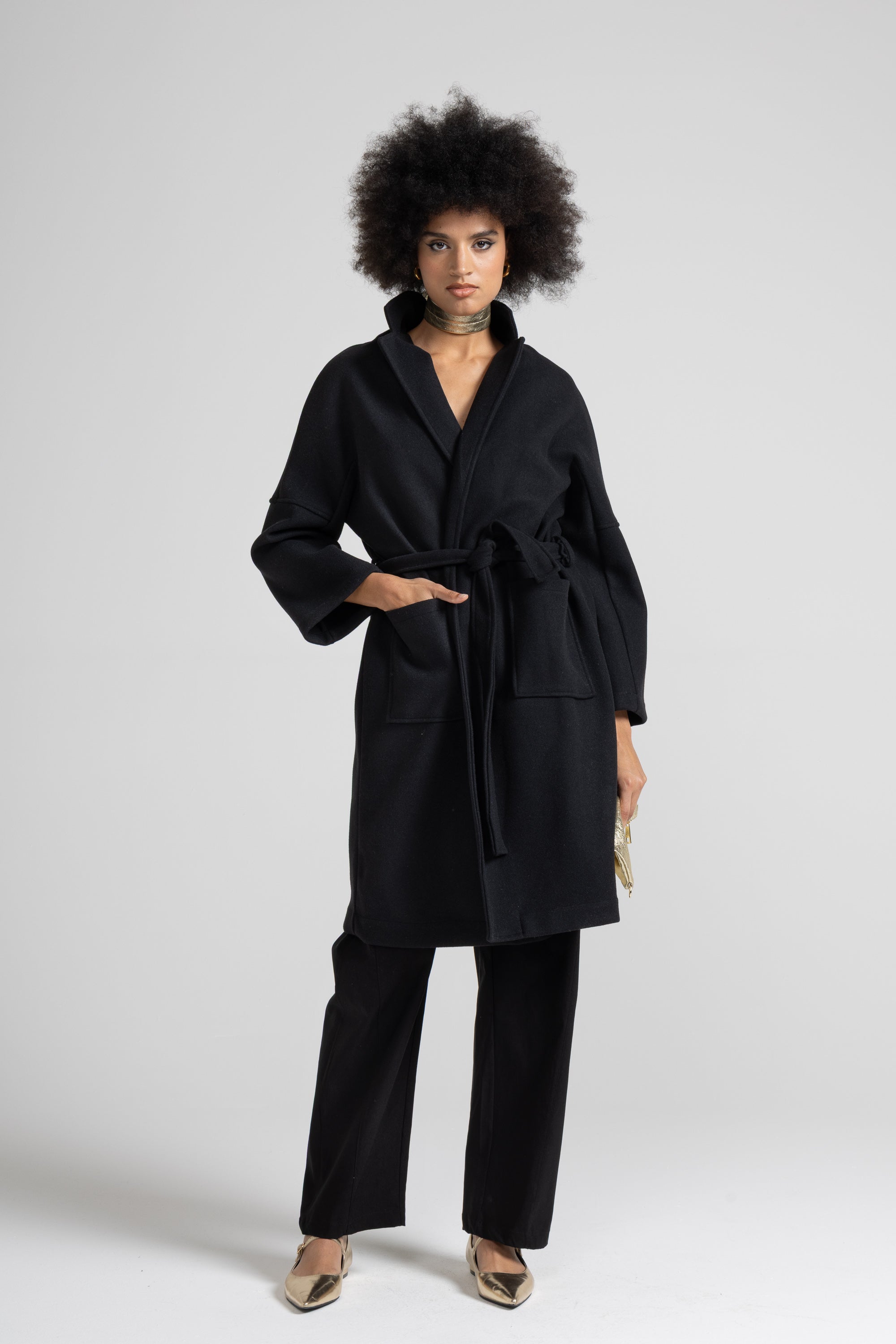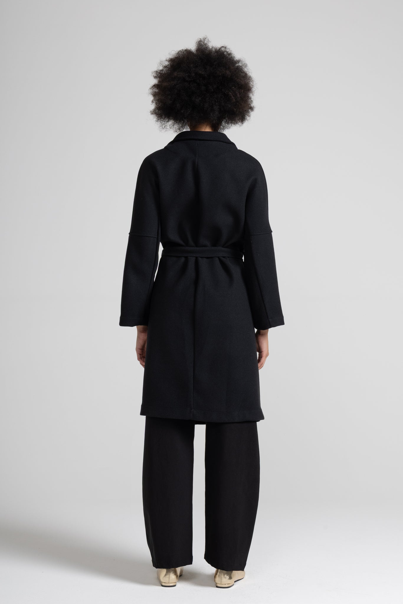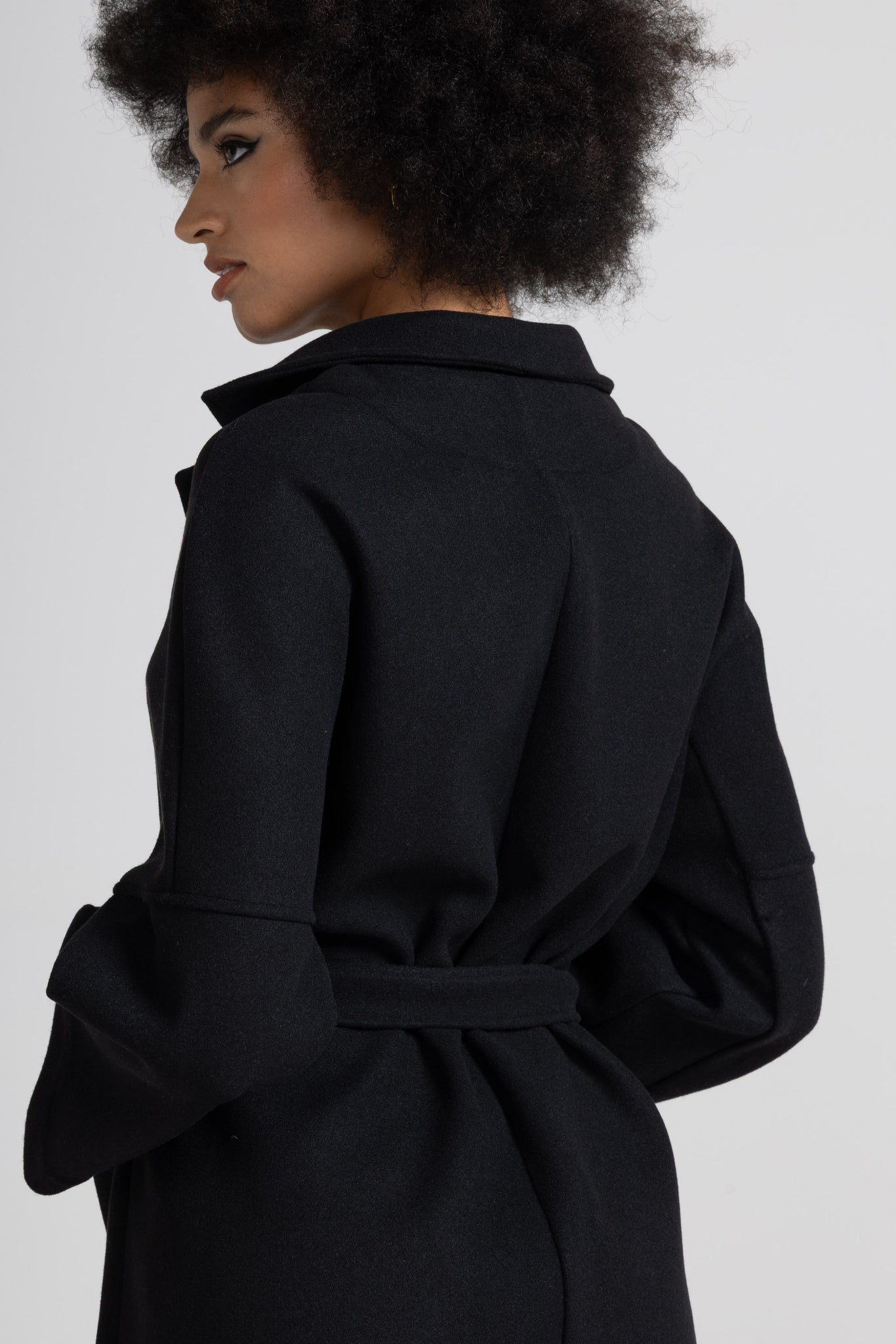 High crew neck, long sleeves with a slightly dropped cut, belted waist, large buttonholes at the sides, two large and practical front patch pockets, and a central vertical seam at the back. Comfortable fit.