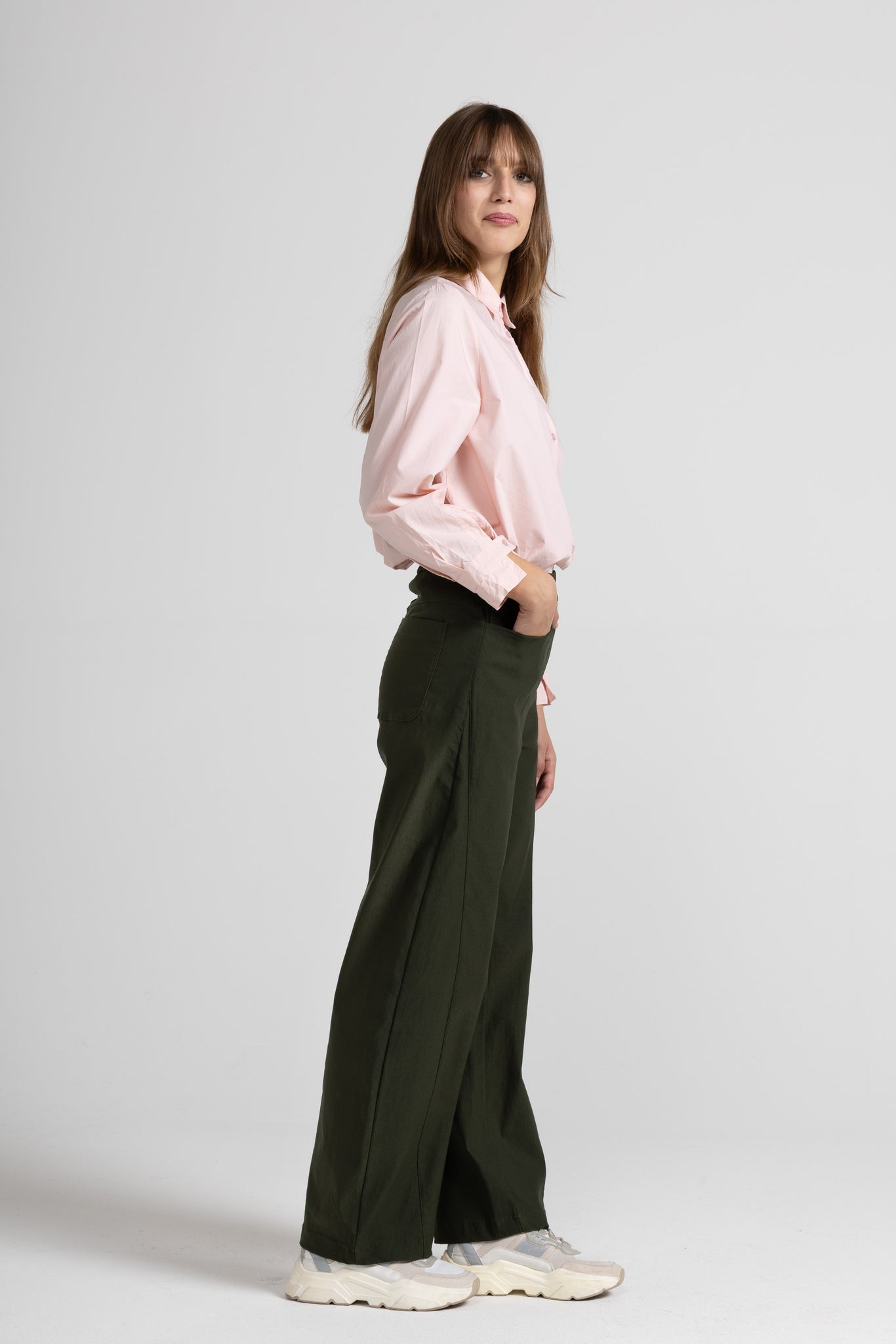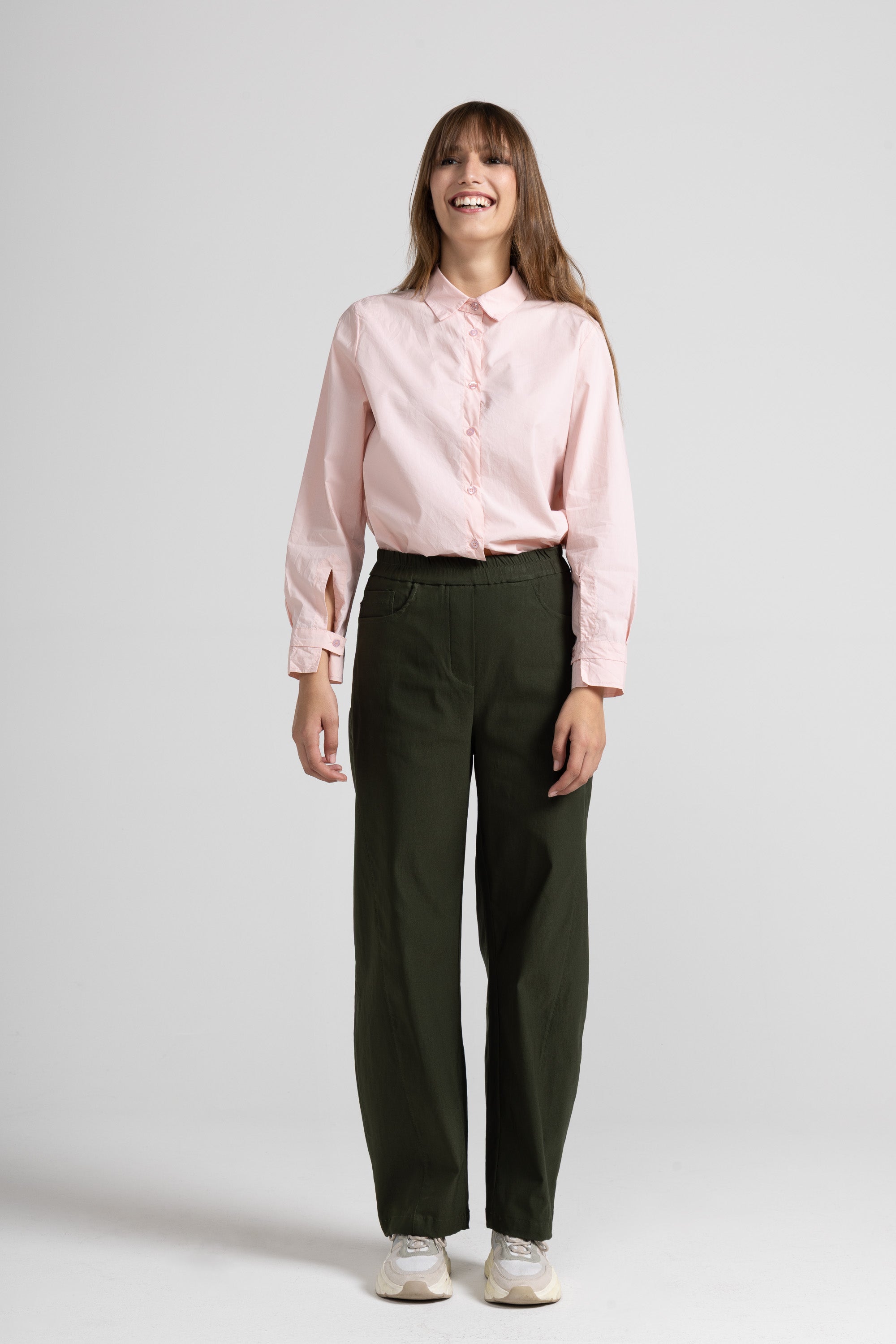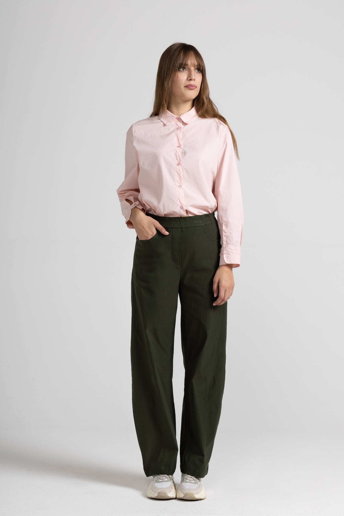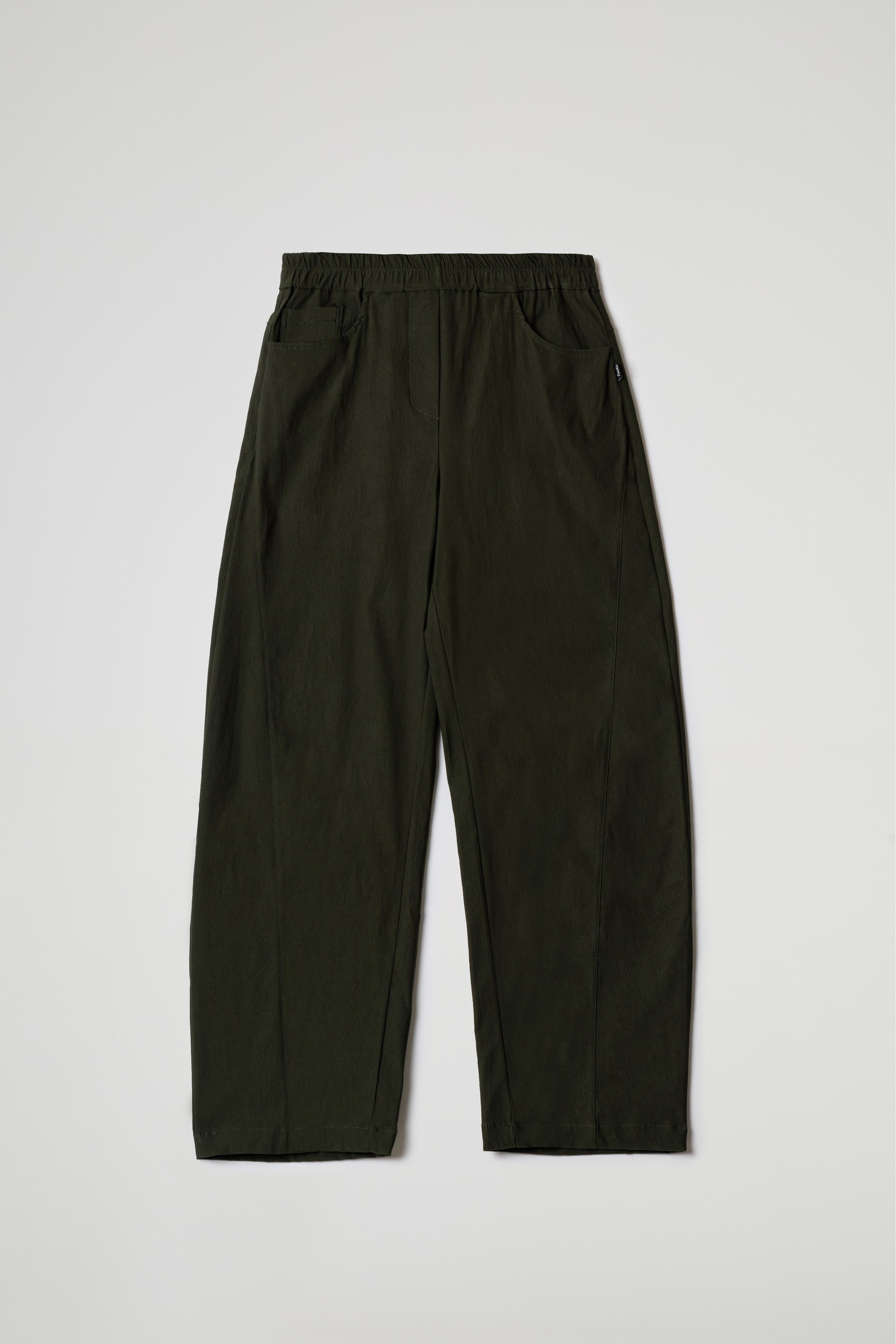 Stretch viscose bengaline trousers with an elastic waistband, functional side pockets, tone-on-tone stitching on the front, and a loose, comfortable fit.