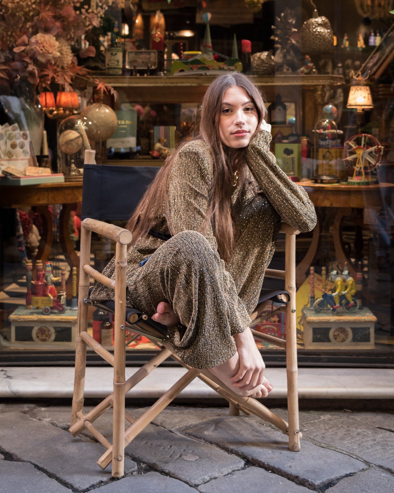 Pantalone a palazzo in lurex, un capo femminile e contemporaneo, ideale da indossare con il suo top coordinato per un outfit total glam o con un capo basico per un contrasto luminoso e di carattere.