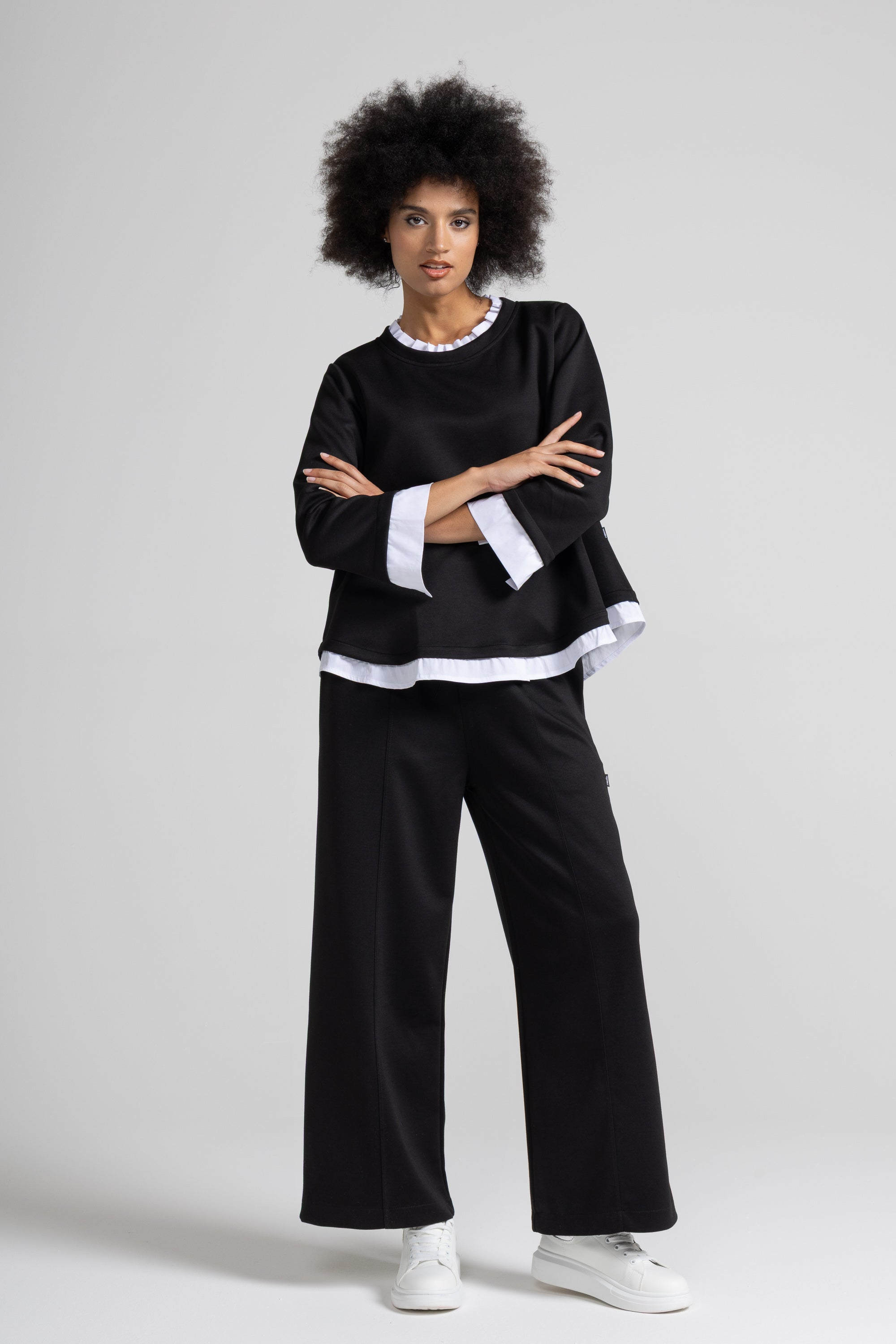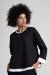 A top with a refined and contemporary design. This model combines the comfort of a stretch cotton knit with the sophistication of shirt-style poplin inserts, visible at the collar and cuffs.