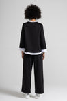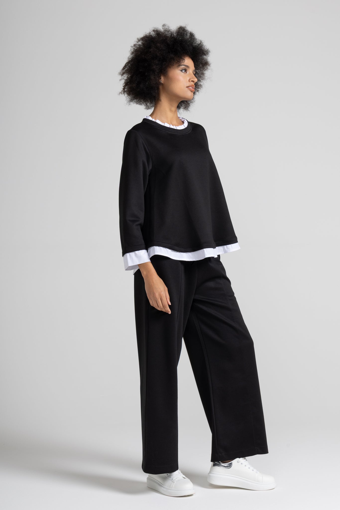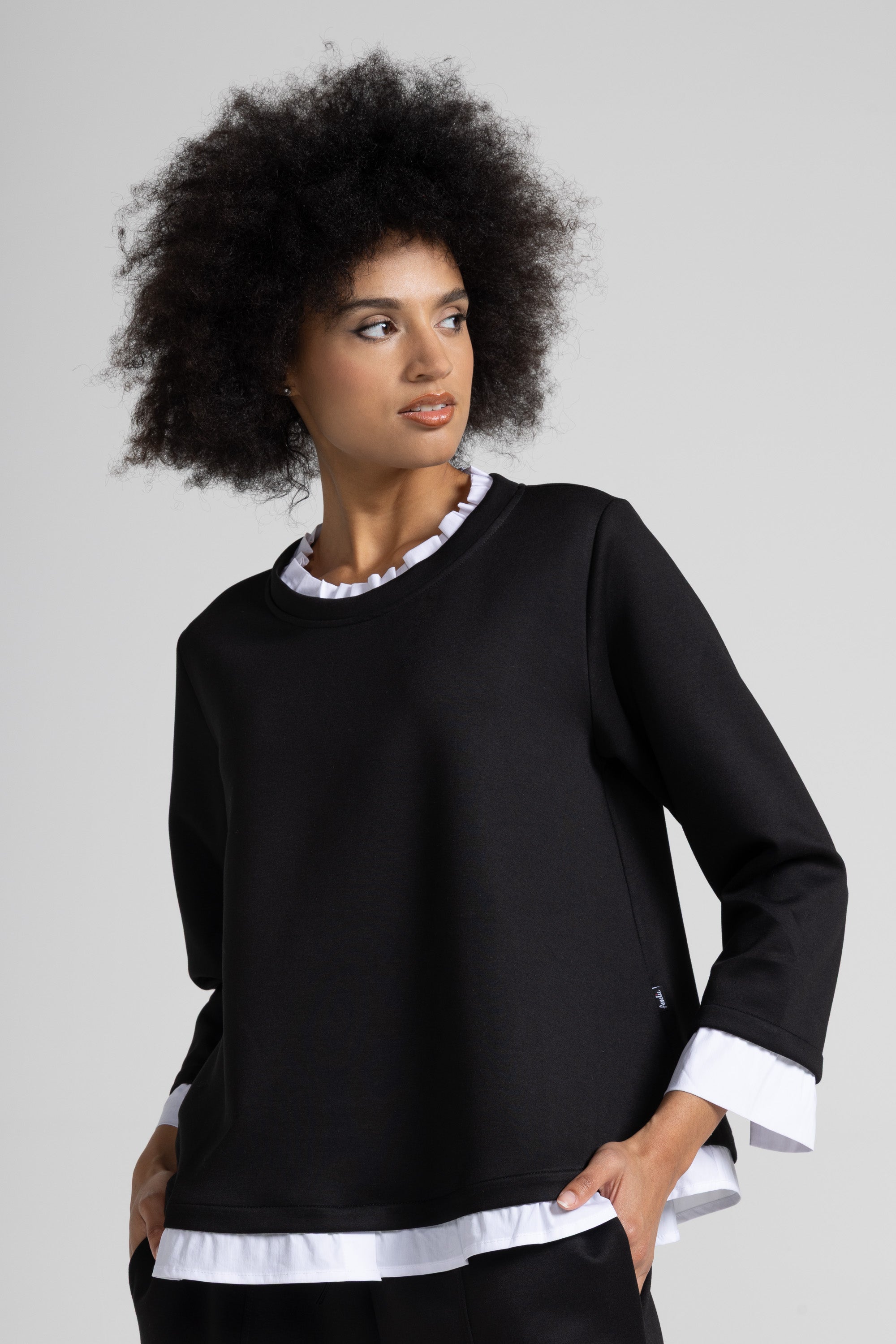 A-line top in flowing viscose fabric, round neckline with poplin ruffled collar detail, long sleeves, poplin detail on sleeve and hem.