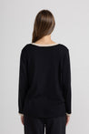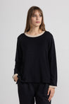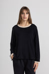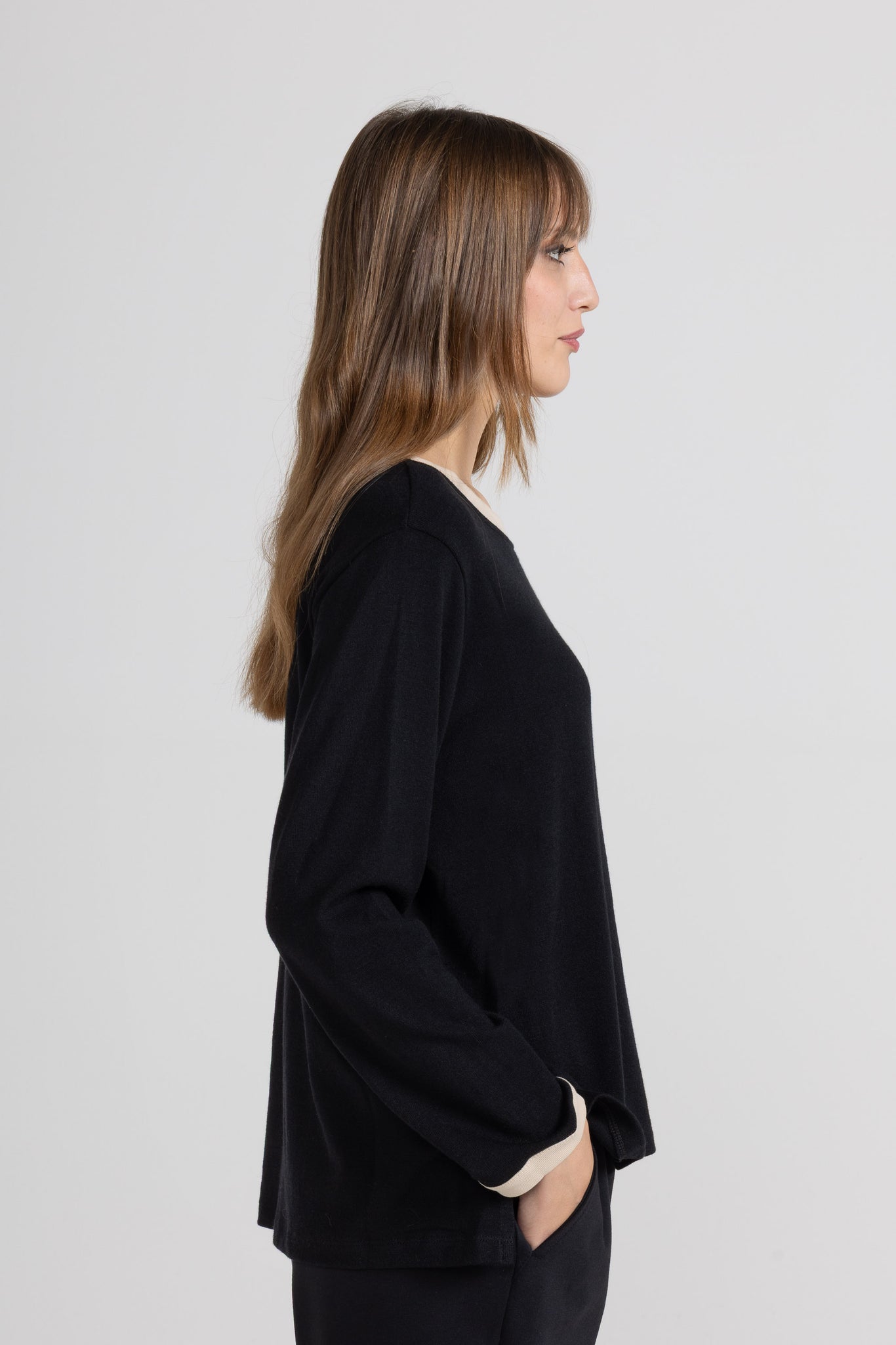 ASYMMETRIC TOP IN KNIT VISCOSE, WIDE ROUND NECK, SIDE SLITS, HIGH TWILLED BOTTOM, CONTRASTING RIBBED DETAIL ON NECK AND CUFFS. WIDE AND SOFT FIT