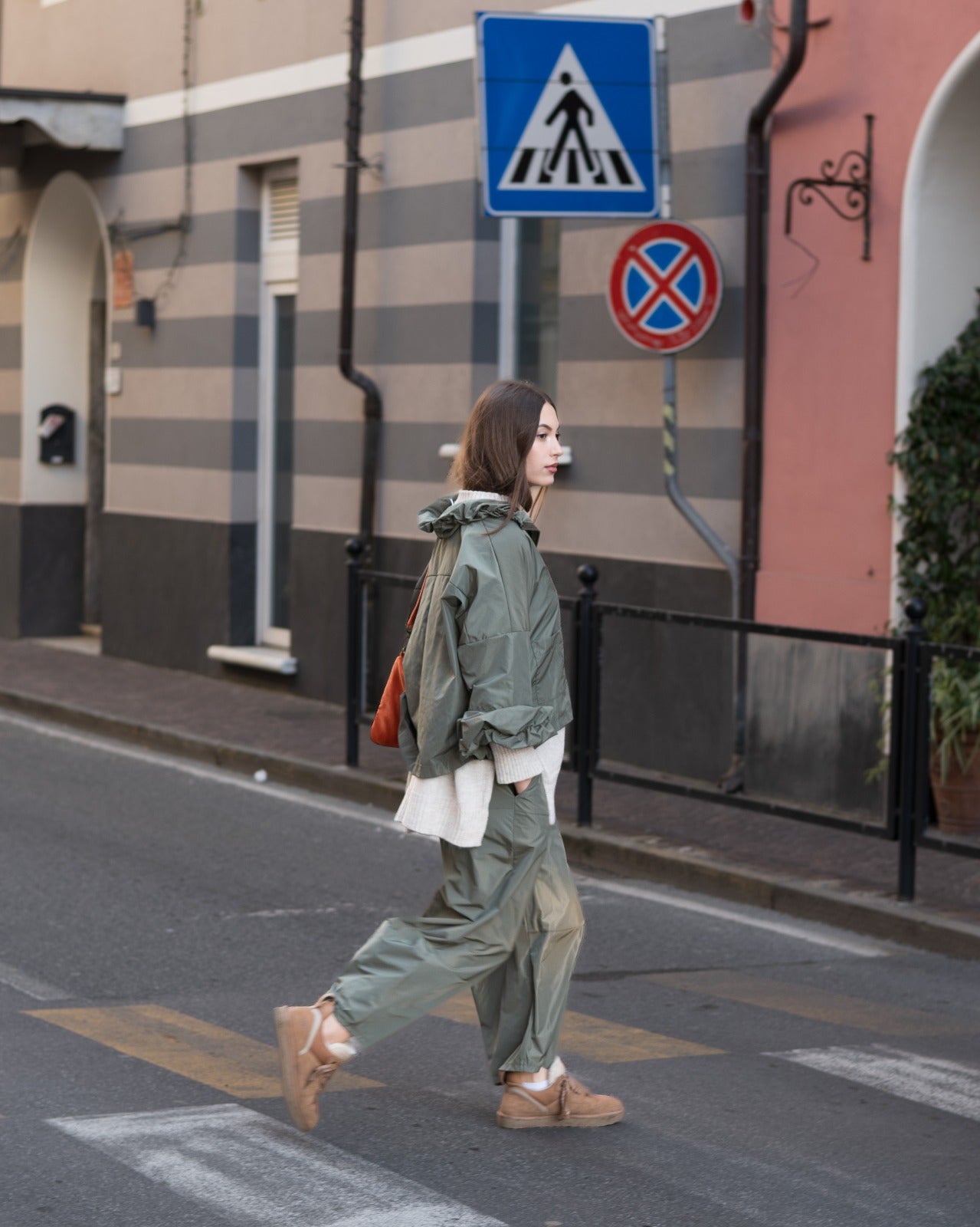 GIACCA CORTA IN TESSUTO TAFFETA’ EFFETTO NACRE’, COLLO E MANICA CON AMPIA ROUCHES,MANICA LUNGA, ZIP TONO SU TONO, TASCHE A TOPPA SUL FRONTE. LINEA BOXY ADATTA A TUTTE LE FISICITA’.