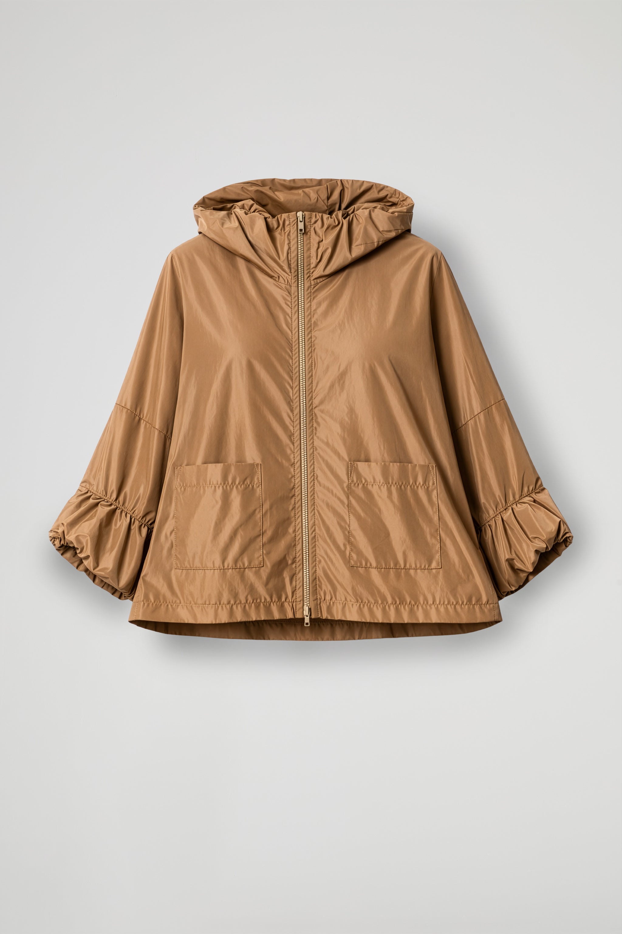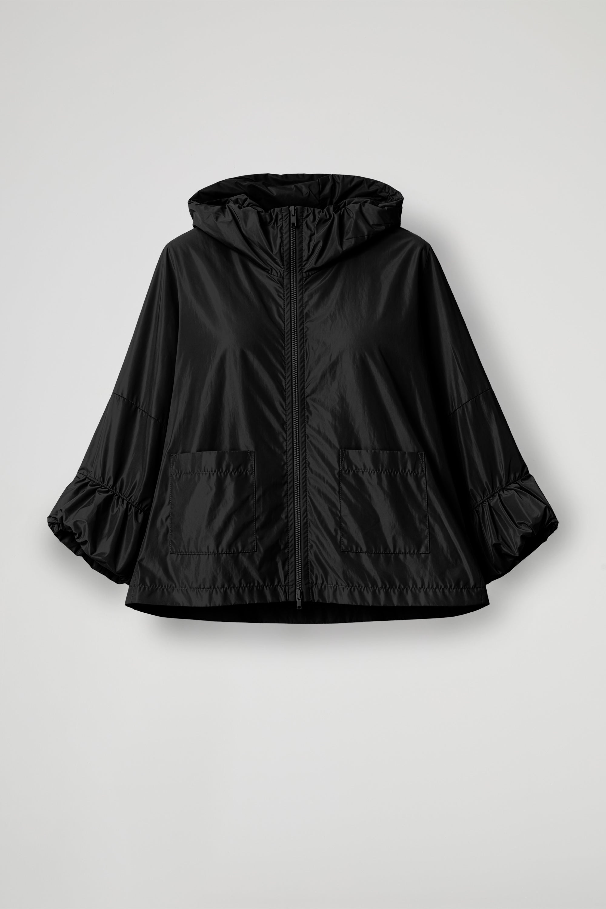 Giacca in tessuto tecnico effetto nacrè, collo alto arricciato, spalle scese con manica ampia e dettaglio arricciatura sul fondo, chiusura frontale con zip nera, due tasche applicate sul davanti. Linea ampia