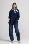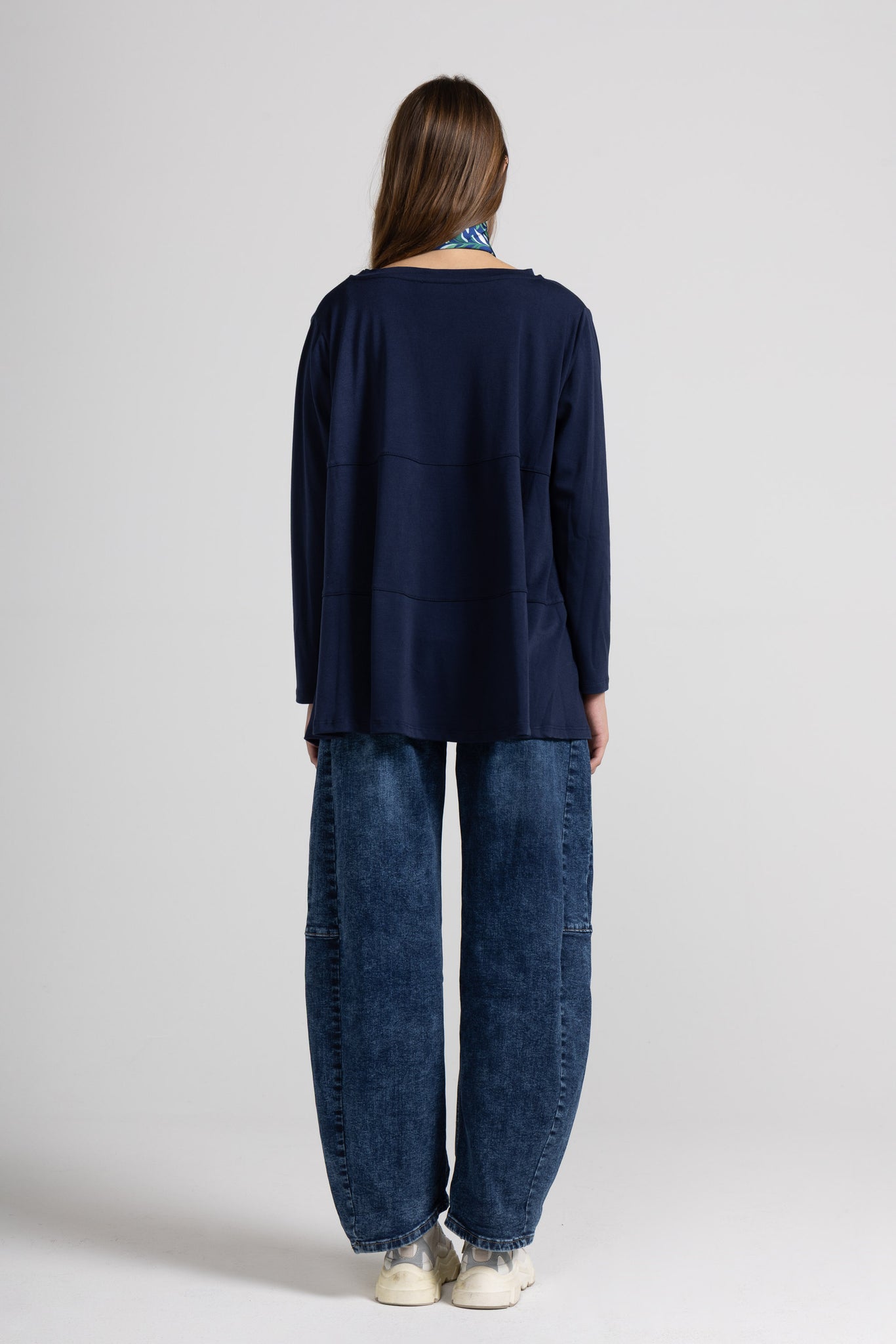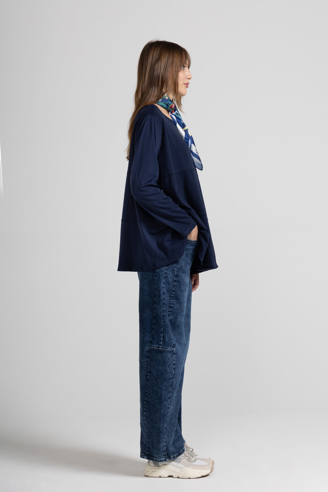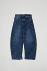 Dark, faded denim, high-waisted with belt loops, metal button and zip fly, five classic pockets (two at the front, two at the back, and a small coin pocket), a very loose, flared fit, with a wide leg and a relaxed fit that tapers slightly toward the bottom. Additionally, prominent vertical seams add structure and a geometric effect to the design.