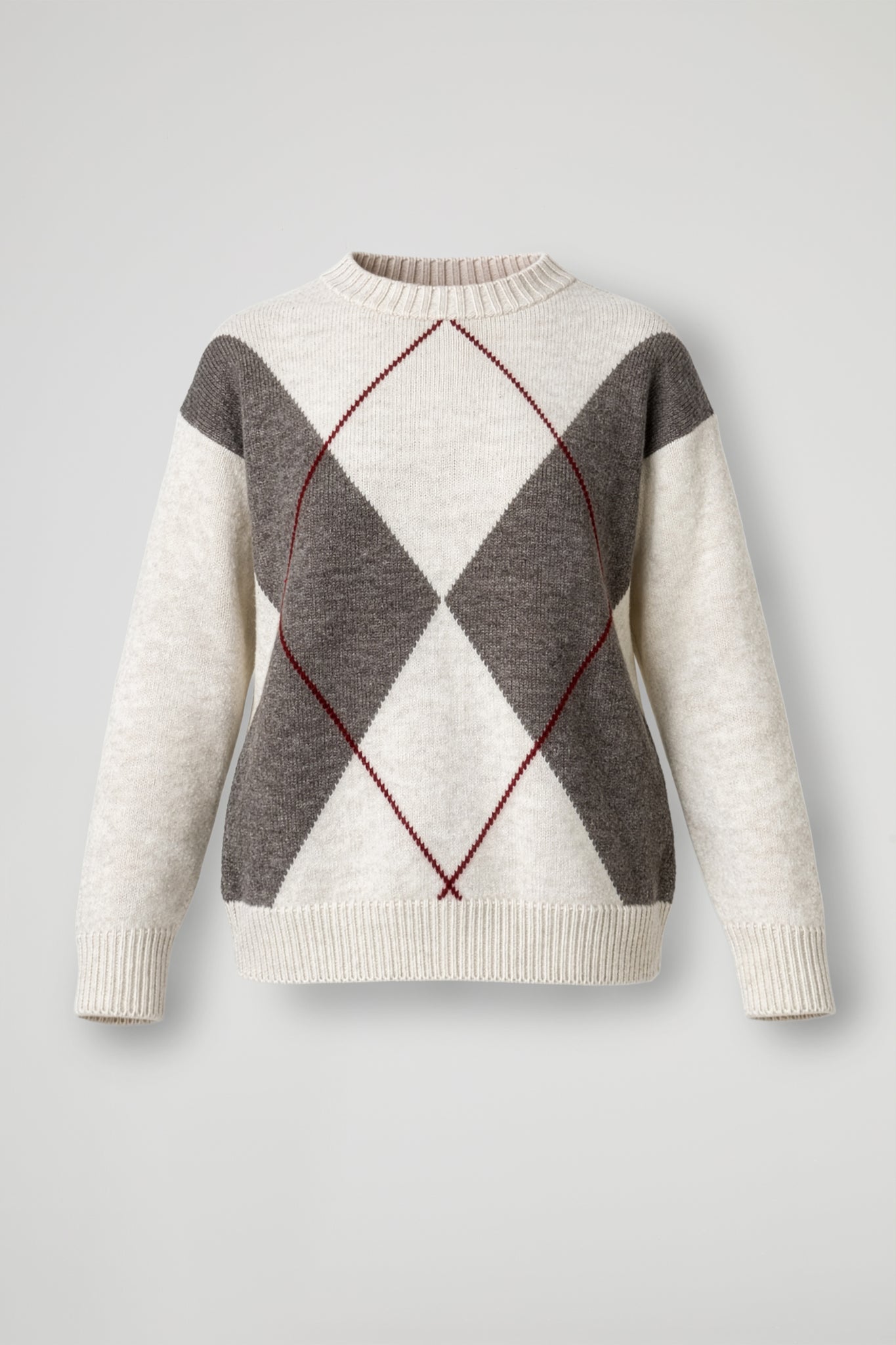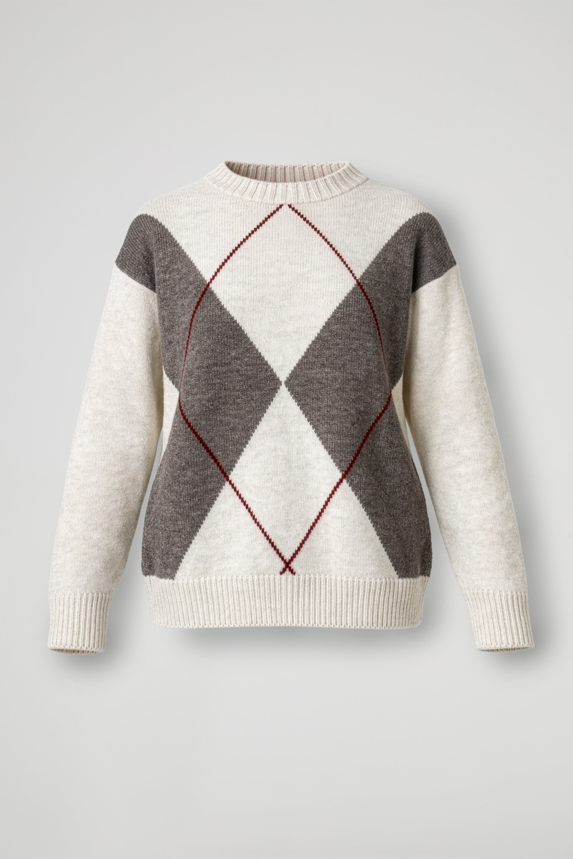 Maglia morbida dal gusto rétro con maxi motivo a rombi sul davanti e profilo a contrasto panna; La linea è morbida e confortevole, con maniche lunghe e spalla leggermente scesa per un fit rilassato.