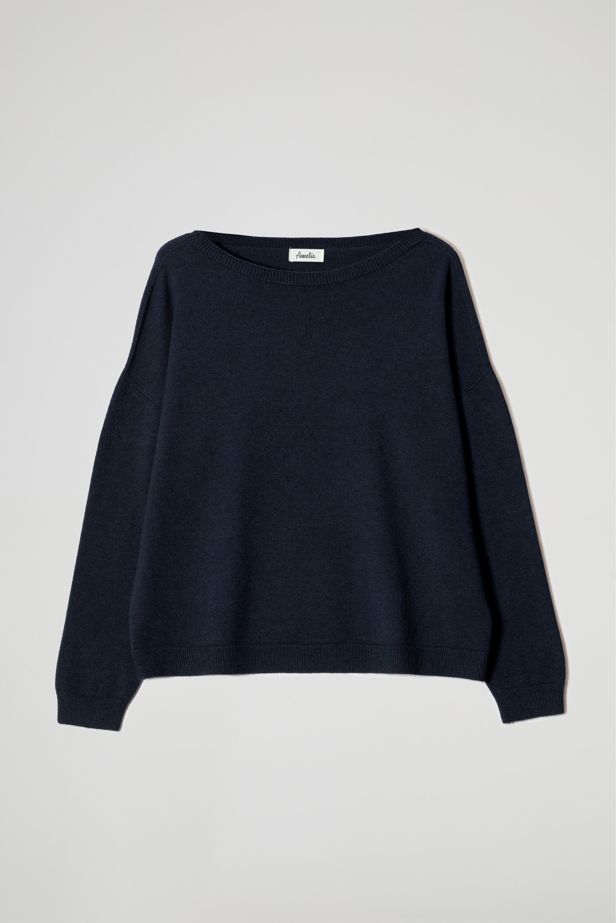 Oversized sweater, wide, round neckline with ribbed trim, dropped shoulders, long sleeves with ribbed cuffs, high folded hem with ribbed detail at the bottom. Loose, soft fit.