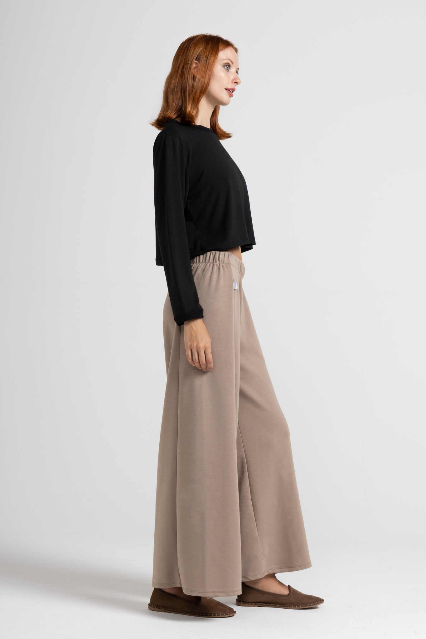 PALAZZO TROUSERS IN FLUENT VISCOSE FABRIC, CUT DETAIL ON THE HIP, ELASTIC WAIST.