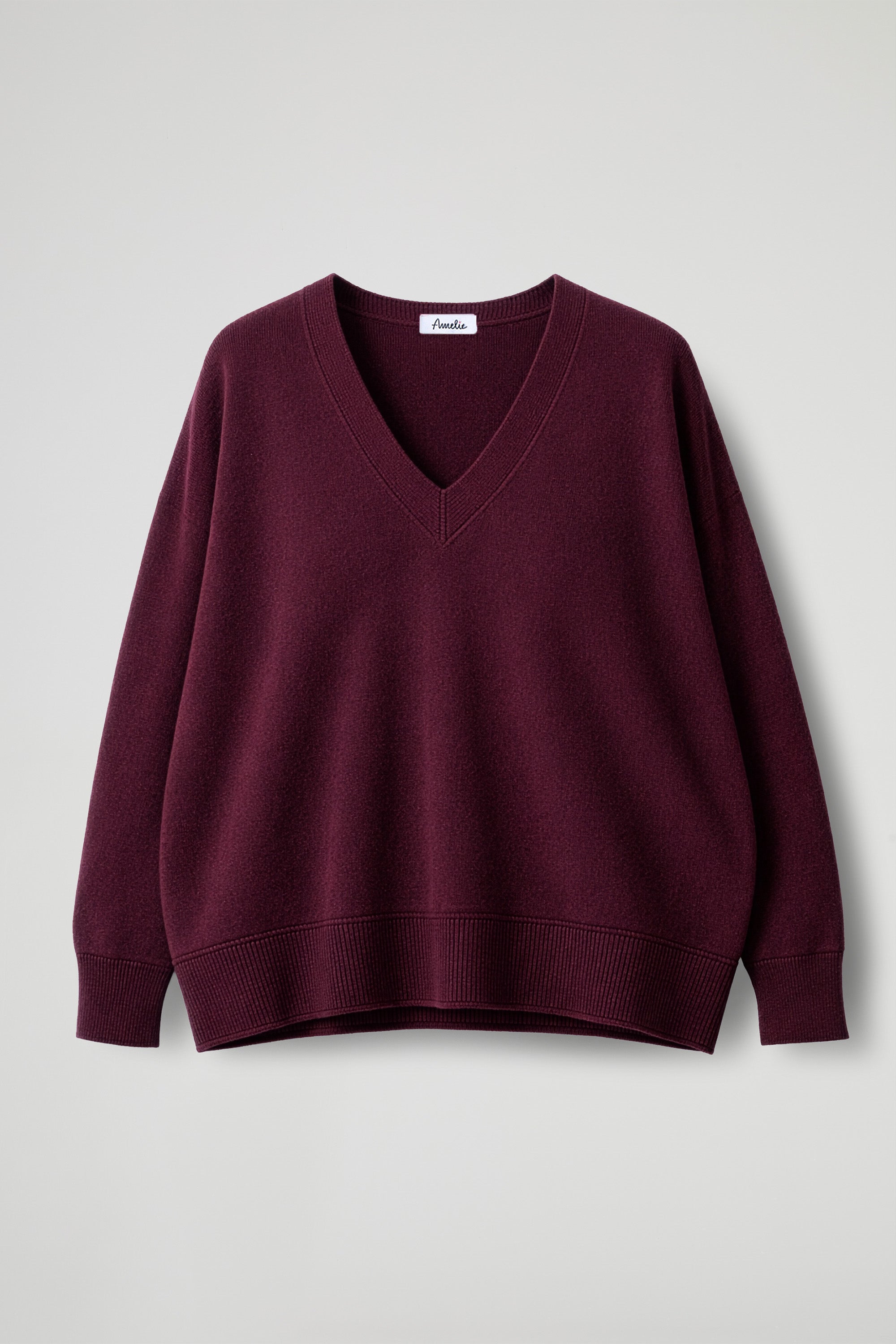 Maglia Over, scollo a V rifinito a coste, spalla scesa, manica lunga con dettaglio polsino alto a costine elasticizzato, fondo stondato con orlo alto a costine. Linea ampia.