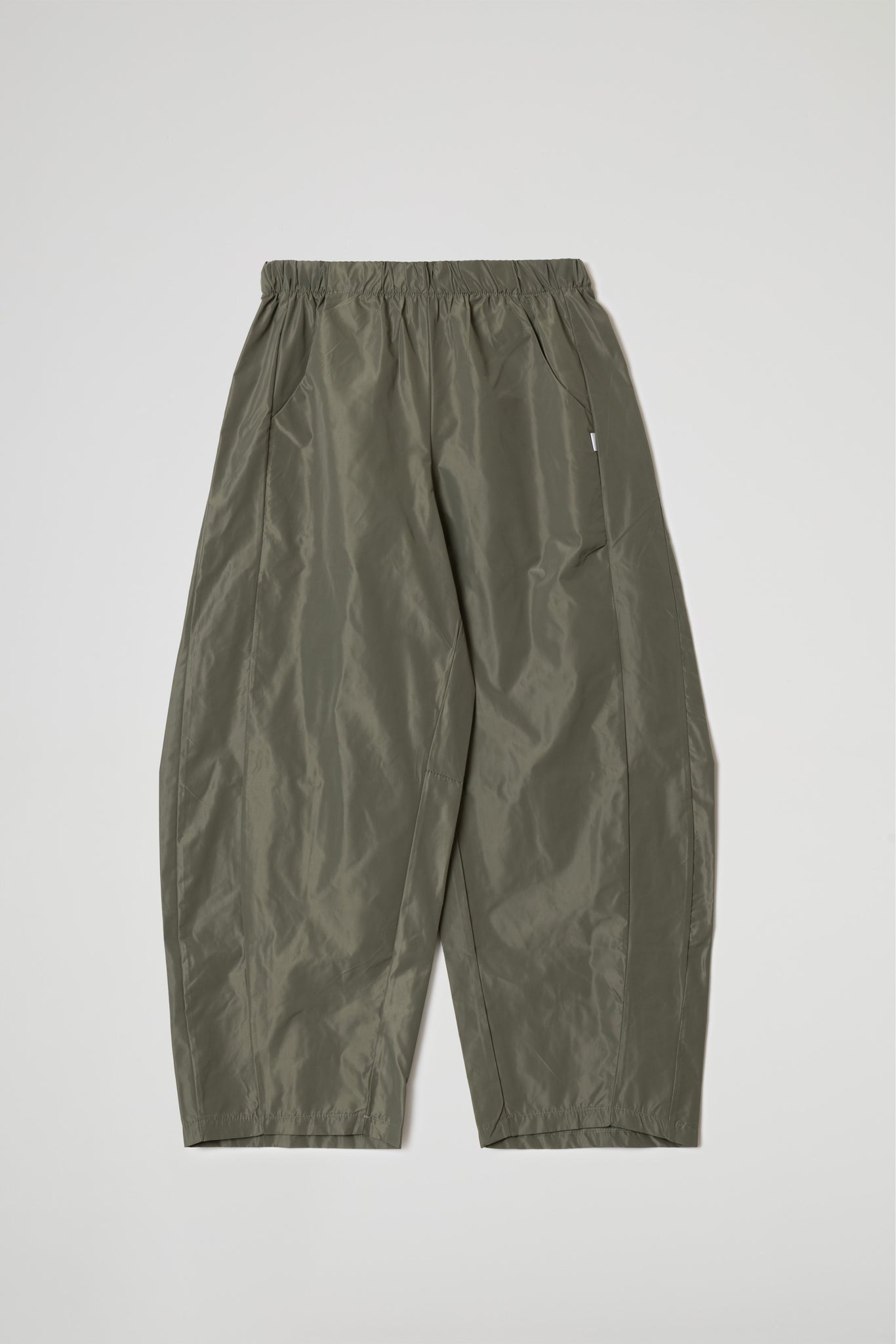 BARREL TROUSERS IN NACRE-EFFECT TAFFETA FABRIC, ELASTIC WAIST, CUT ON THE LEG, SQUARE POCKETS, BAGGY LINE