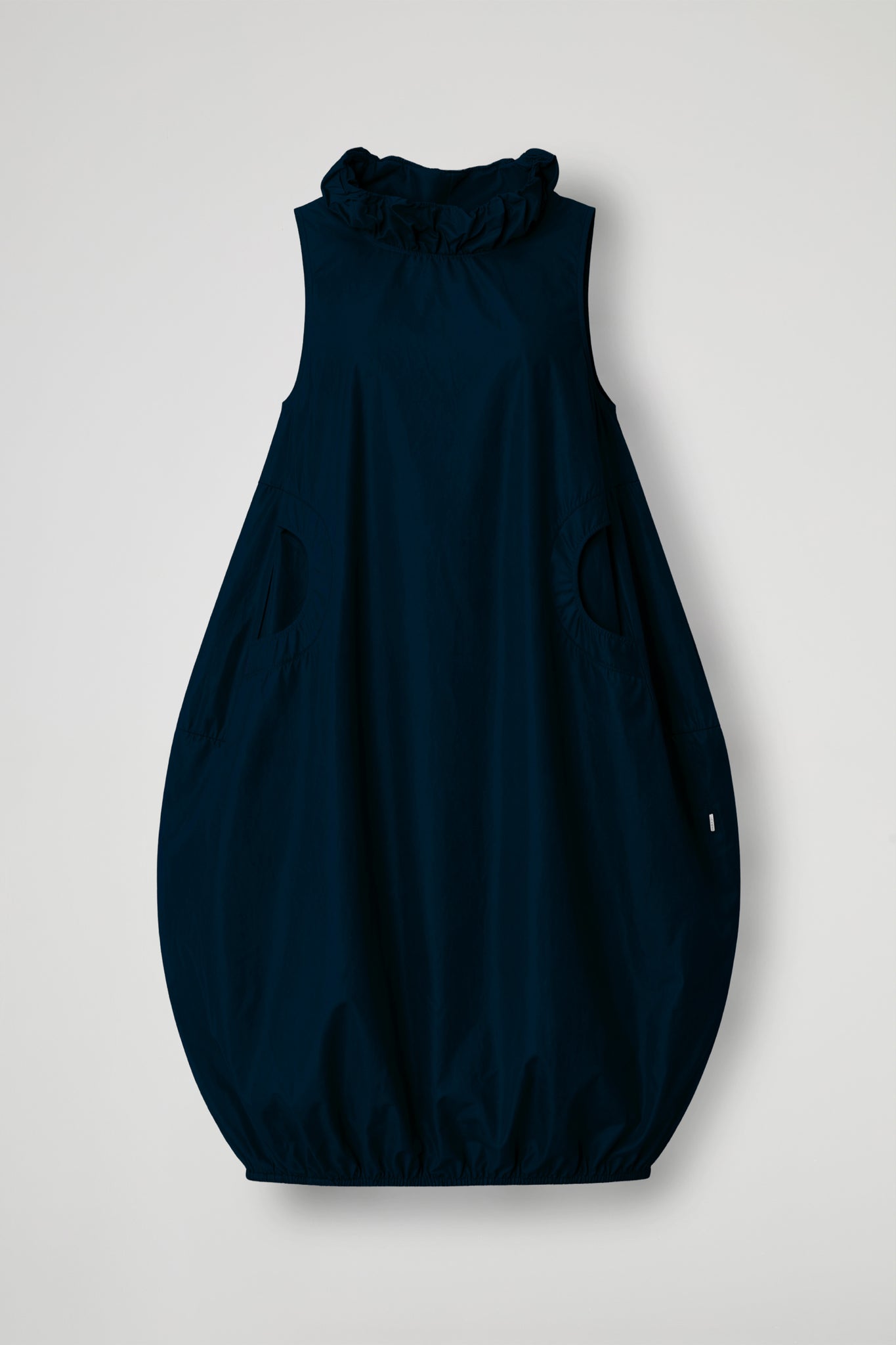 MAXI SLEEVELESS DRESS IN NACRE EFFECT TAFFETA FABRIC, RING NECK WITH RUFFLES, PORTHOLE POCKETS, ELASTIC AT THE BOTTOM, EGG-SHAPED LINE.