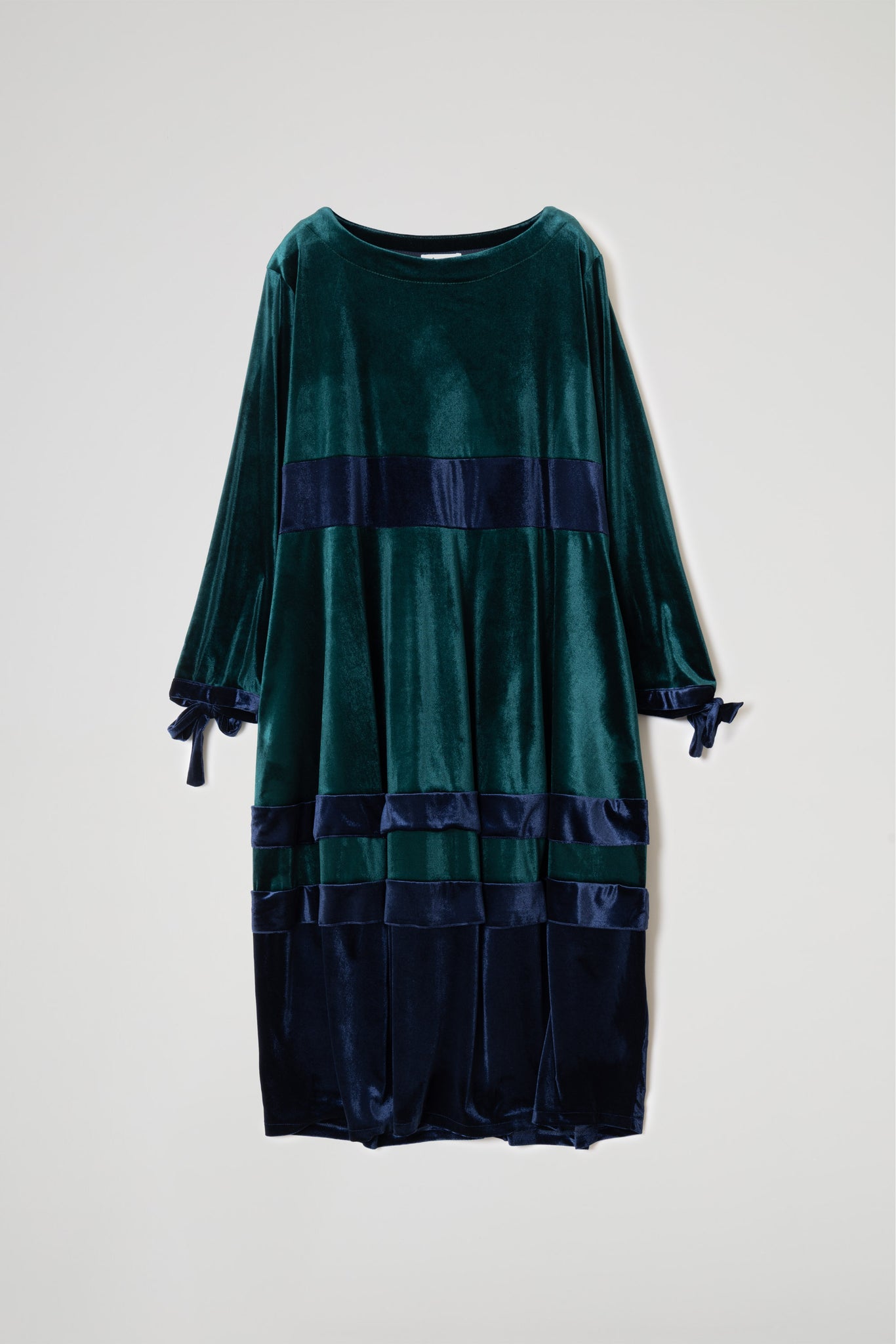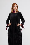 LONG EGG-SHAPED DRESS IN STRETCH VELVET FABRIC, LONG SLEEVES WITH ADJUSTABLE BOW CUFFS, RUFFLE DETAIL, WIDE HIGH FOLDED BOAT NECK.