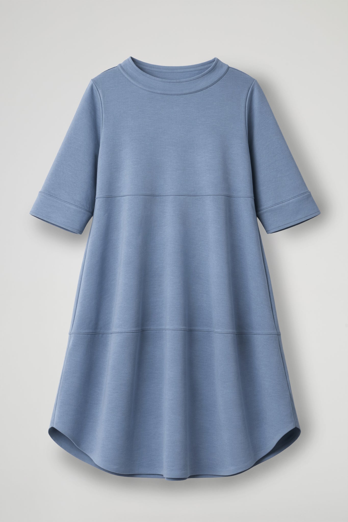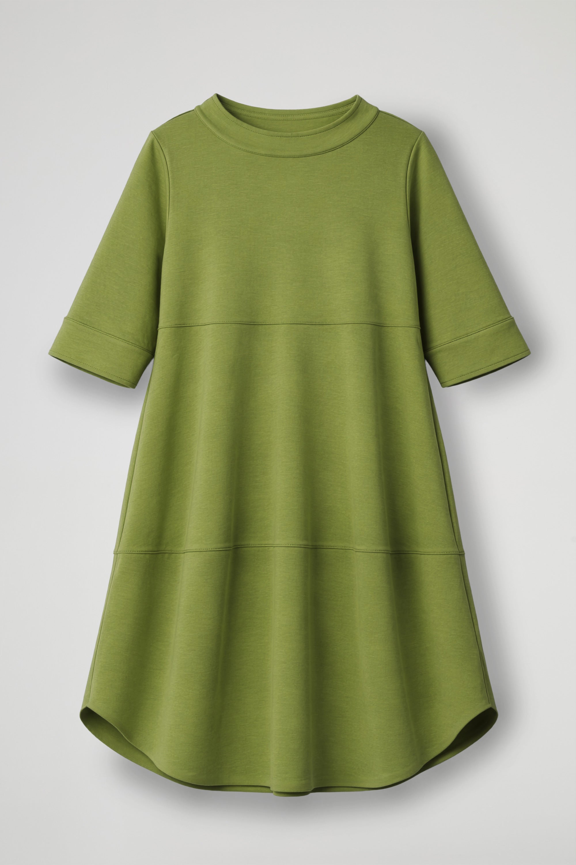 Abito in tessuto fluido, collo ampio e rotondo dall' orlo ribattuto alto, maniche a ¾ con orlo ribattuto alto, tasche a filo, cuciture orizzontali decorative, orlo a petalo sul fondo. Linea