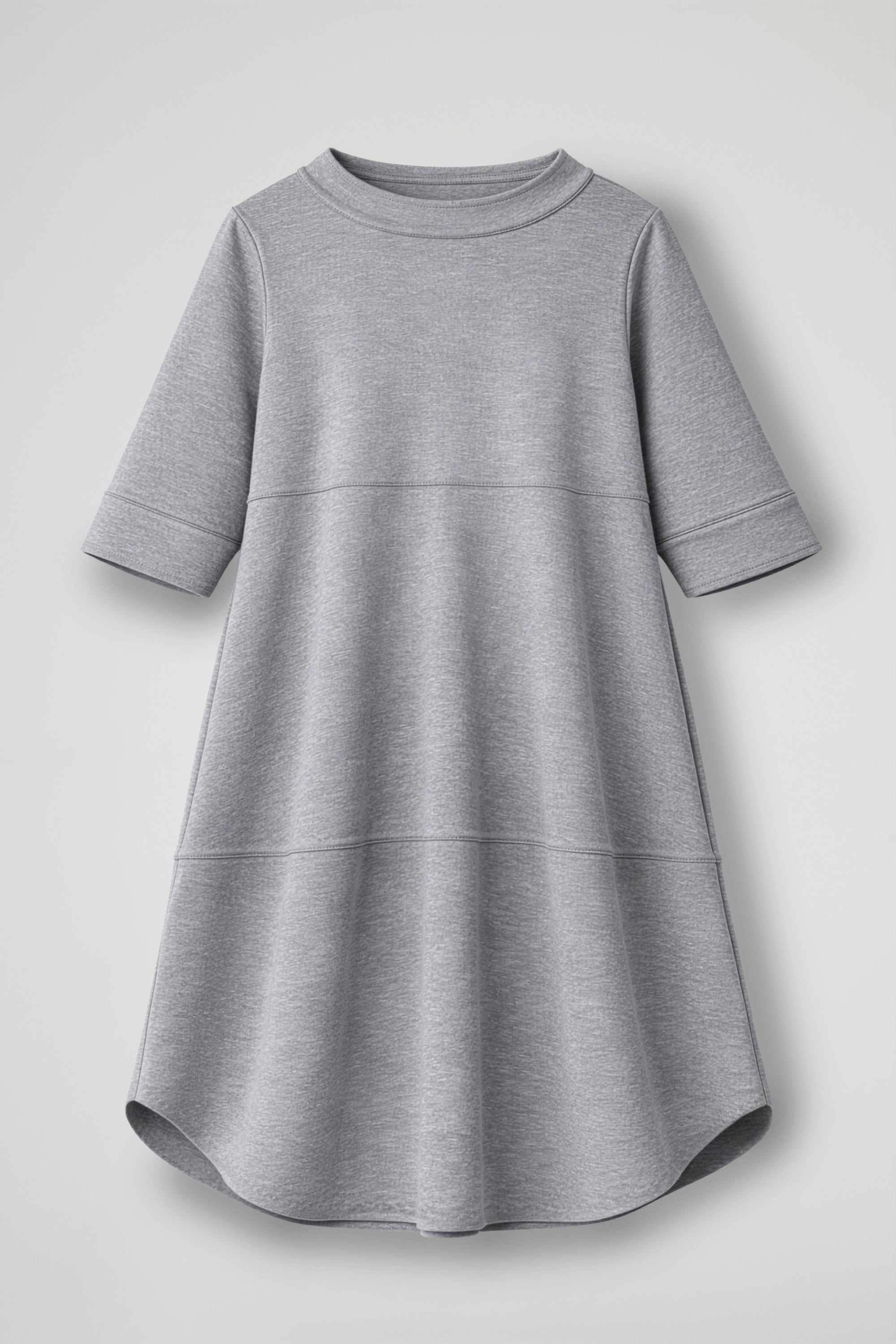 Abito realizzato in tessuto morbido e avvolgente, unisce praticità ed eleganza in un design essenziale ma ricercato. La linea ampia e fluida accompagna delicatamente le forme, mentre i tagli orizzontali donano movimento e carattere al capo, creando una silhouette moderna e armoniosa. Il collo rotondo e le maniche a tre quarti dal taglio morbido aggiungono un tocco contemporaneo e rilassato, perfetto per un look casual-chic.