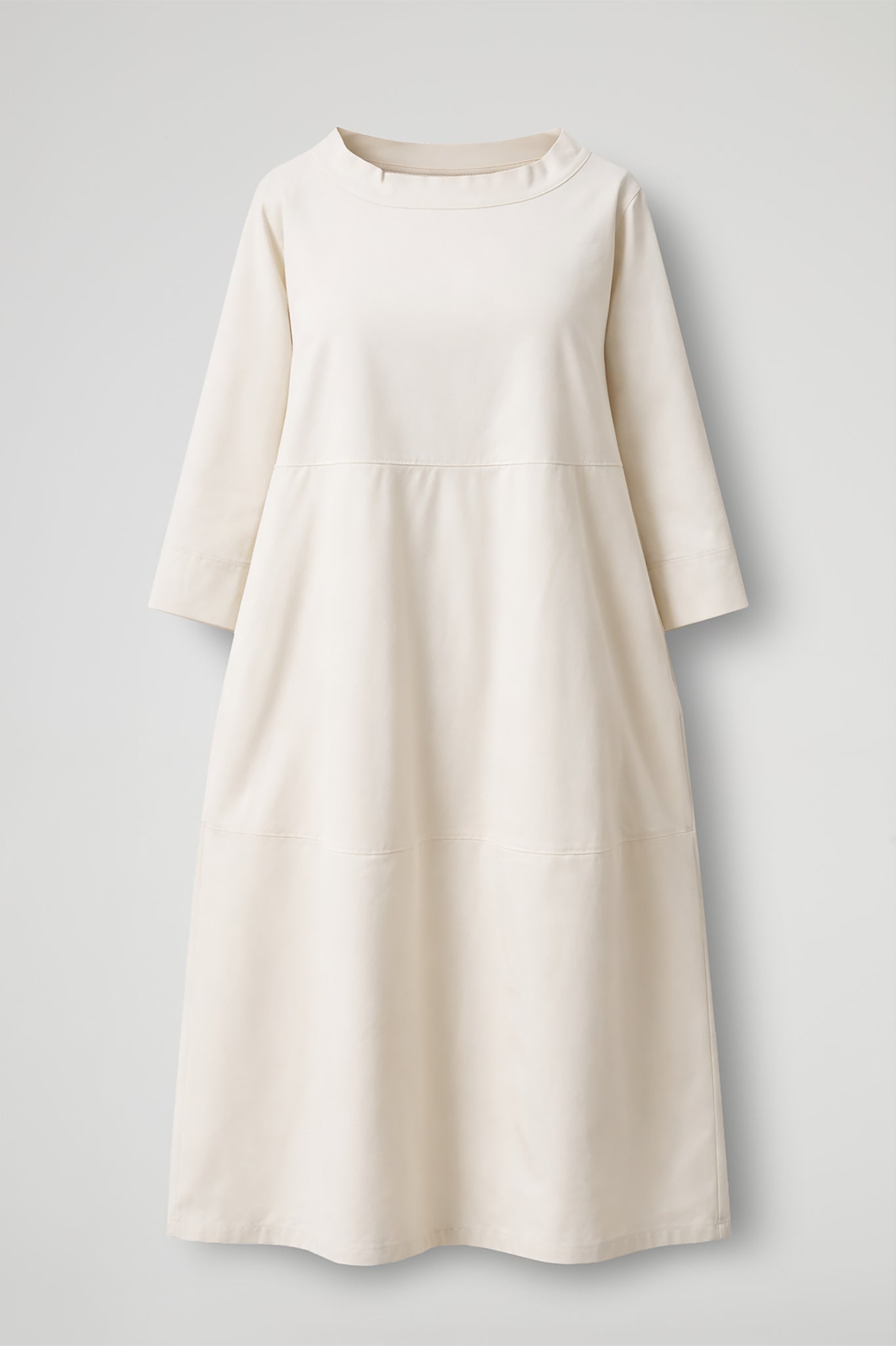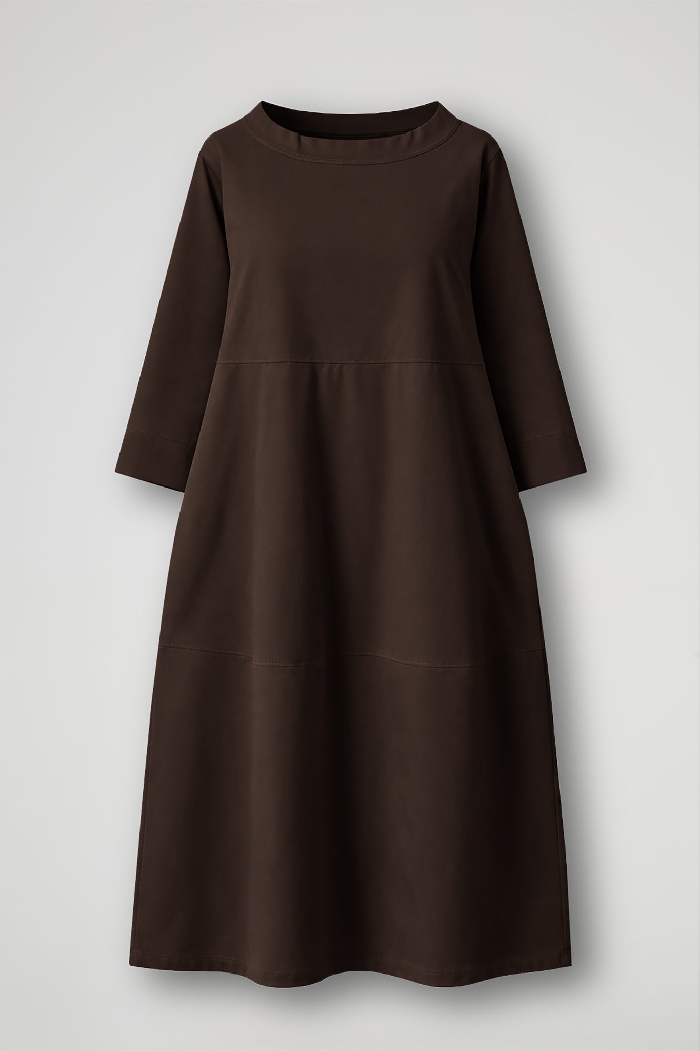 Simple and sophisticated, this dress is the perfect transitional piece. The high neck lends a clean elegance, while the flared silhouette with horizontal cuts creates movement and flatters the figure with a soft, feminine fit. The 3/4 sleeves make it practical and versatile.