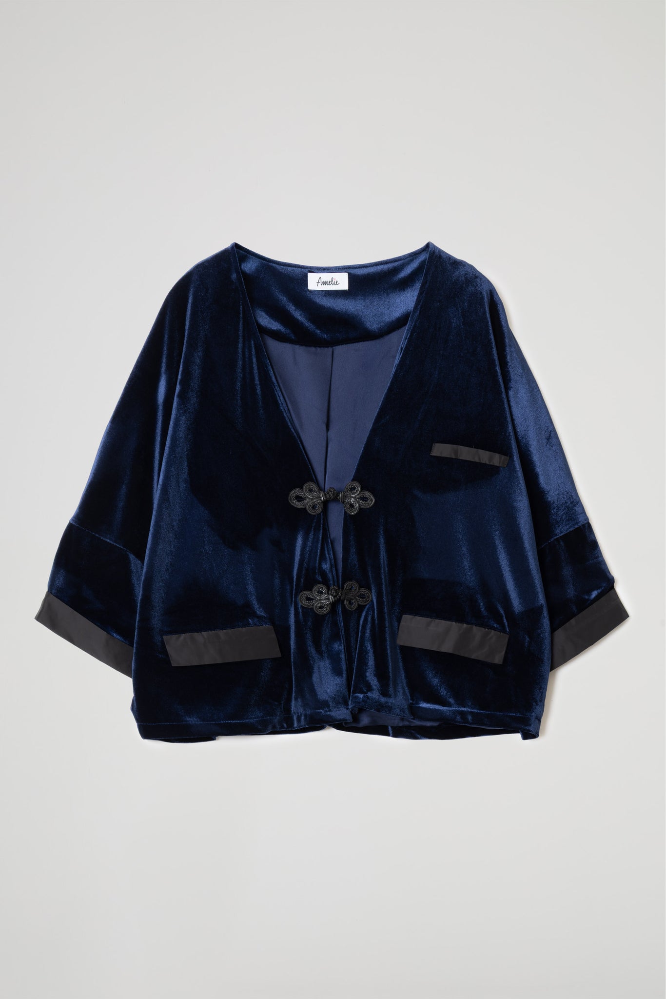 SHORT CARDIGAN IN STRETCH VELVET FABRIC AND ELASTIC LINING, ¾ SLEEVES, HIGH FOLDED CUFFS IN TAFFETA FABRIC, PATCH POCKET WITH TAFFETA FLAP, FAKE HEART-HEIGHT TAFFETA POCKET, TOGGLE CLOSURE. BOXY LINE.
