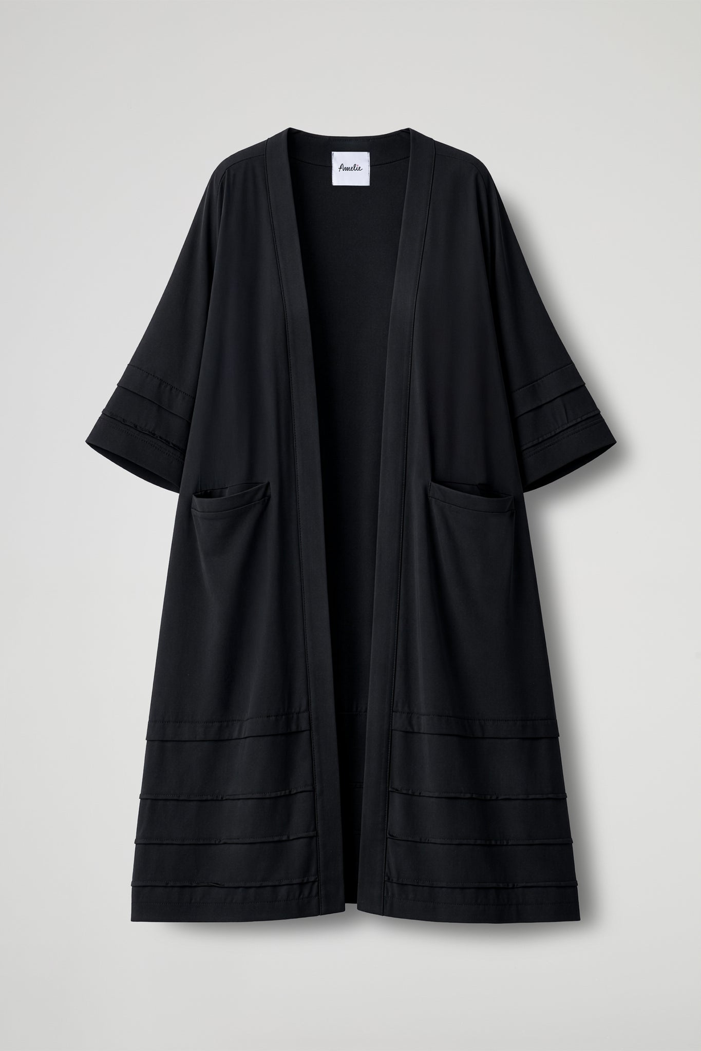 Maxi soprabito stile kimono dalle linee pulite e dall’eleganza rilassata; la silhouette dritta e fluida scivola sul corpo senza costringere ,le maniche ampie a 3/4 e le tasche applicate aggiungono praticità e carattere mentre le impunture/fasce orizzontali a fondo capo e sulle maniche creano il dettaglio che valorizza il design senza appesantirlo. E' il capospalla perfetto per completare qualsiasi look con un tocco minimale e contemporaneo.