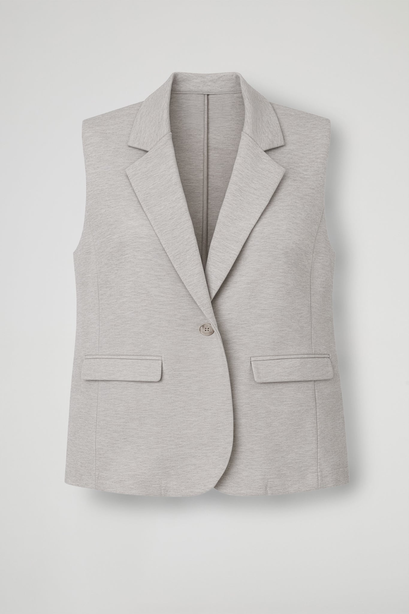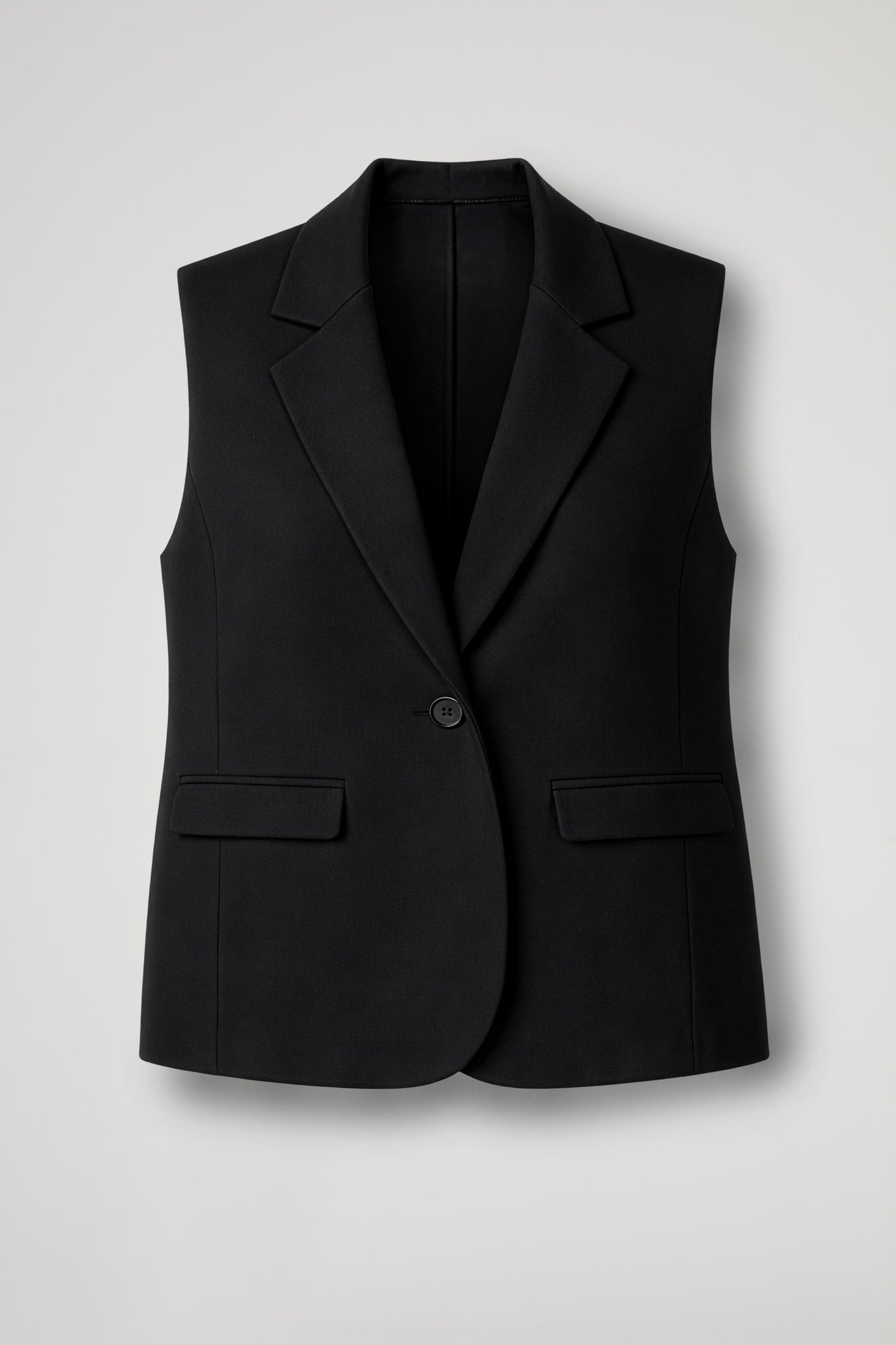 A sleeveless vest with a bold, contemporary cut, perfect for adding character to even the most basic look. The style features notched lapels , a single marble-effect button closure , and a clean silhouette that flows over the body with a relaxed fit . On the front, the flap pockets recall the tailoring of a traditional blazer, while the vent and rounded hem soften the silhouette and make the piece easy to layer.