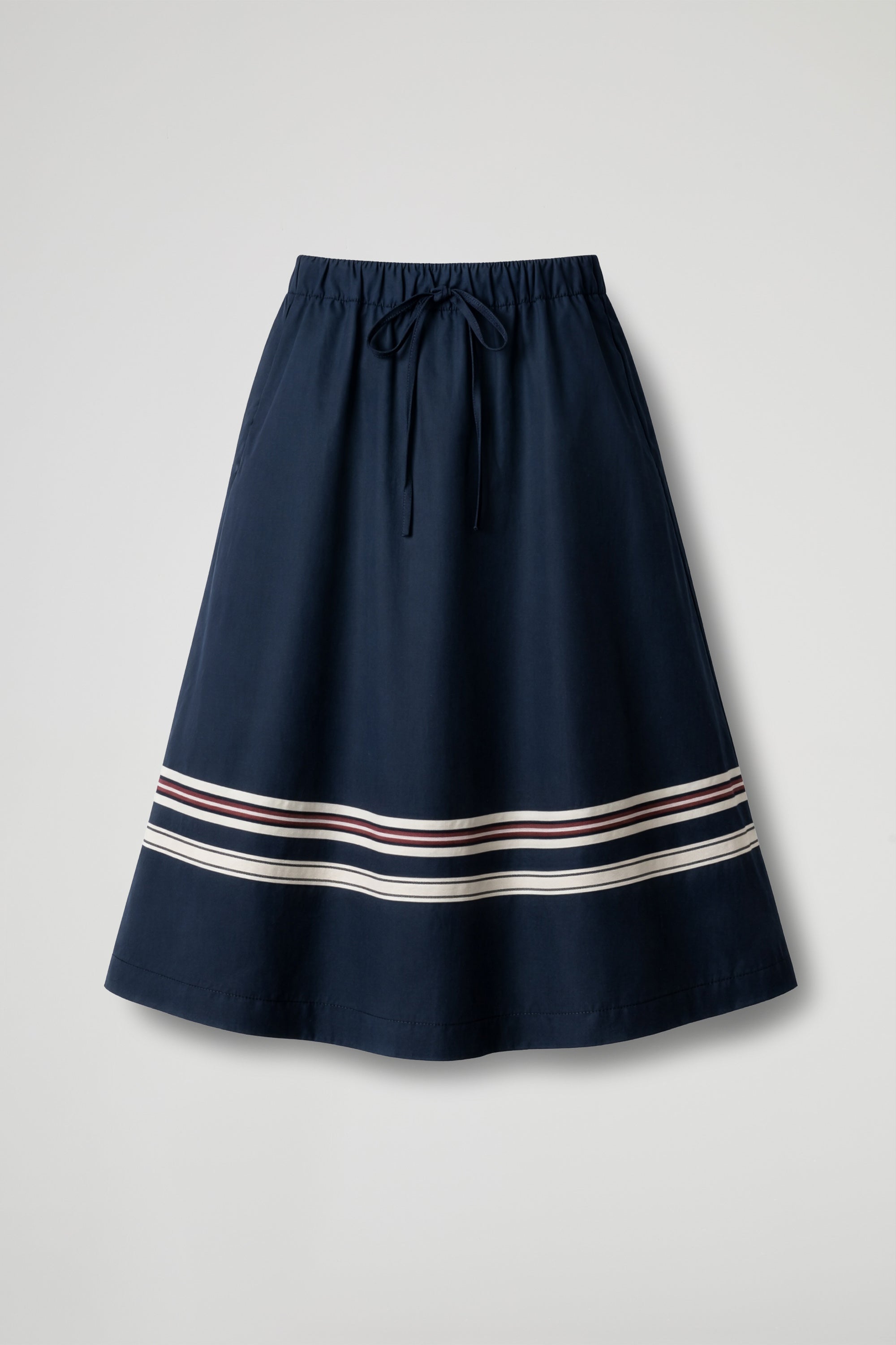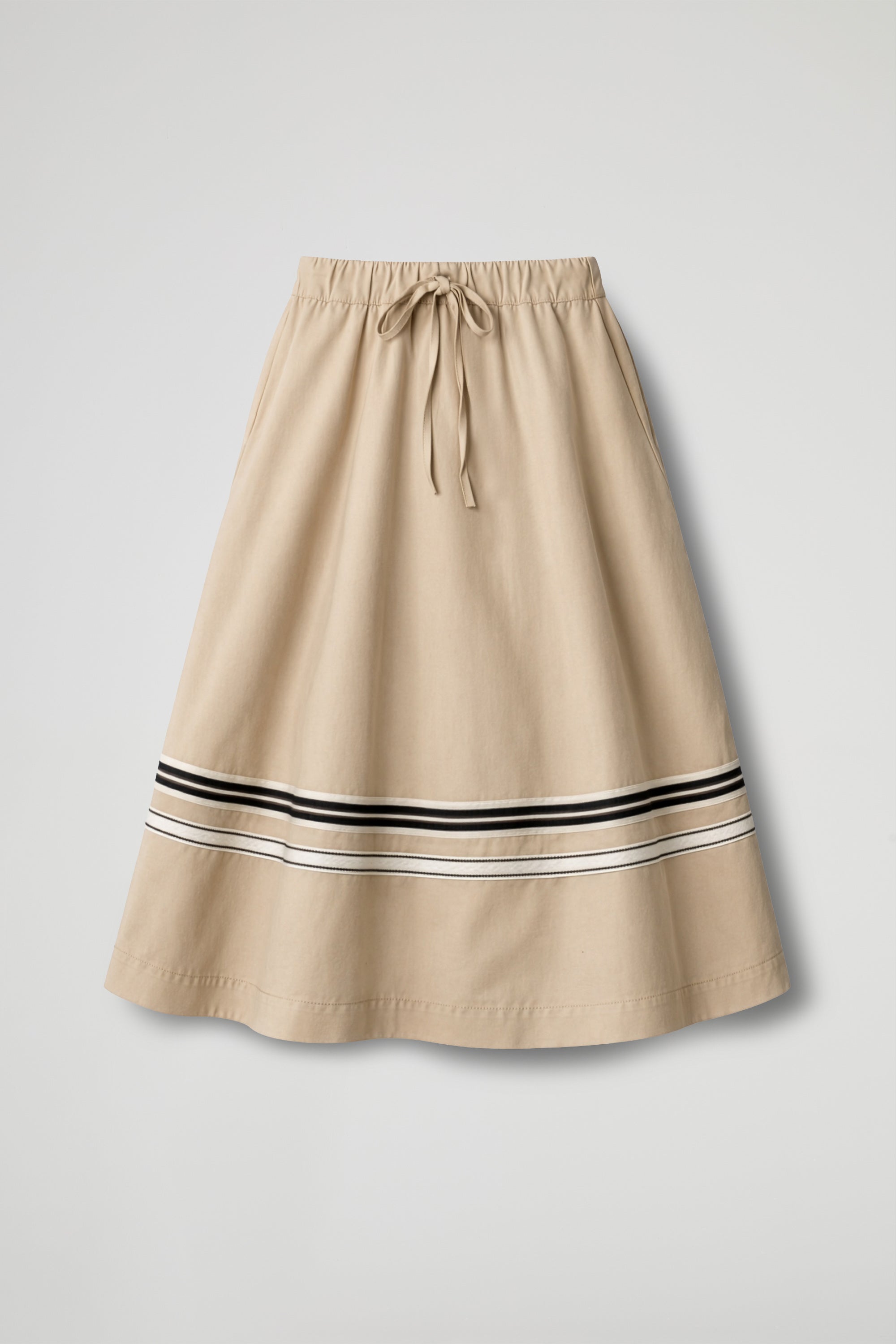 A-line midi skirt that lends fluid, feminine movement to every step. The elasticated drawstring waistline flatters the silhouette, while the side welt pockets add practicality without sacrificing the clean design. A contrasting band at the hem makes it special, a chic graphic detail that adds character to even the most minimalist looks.