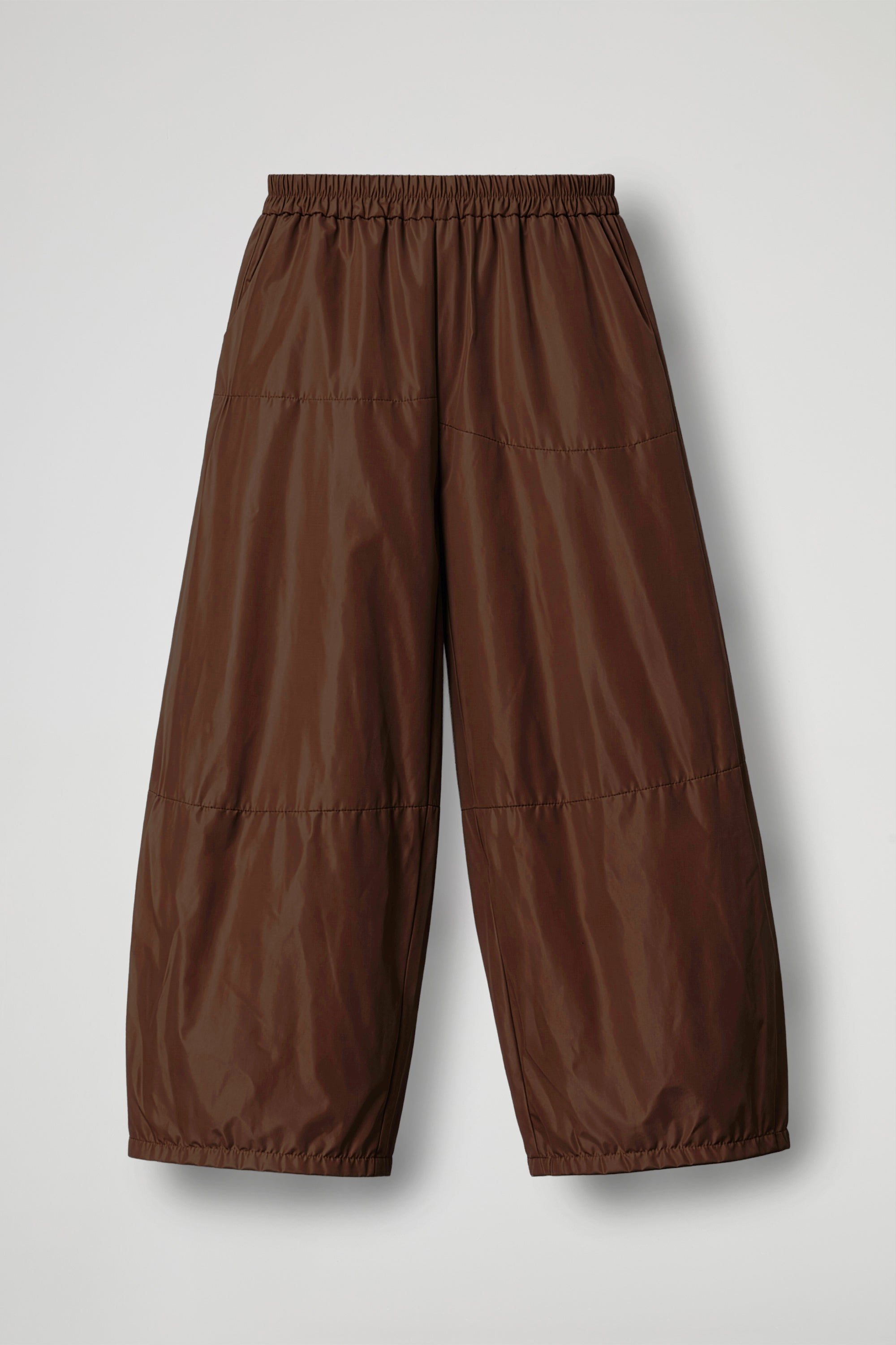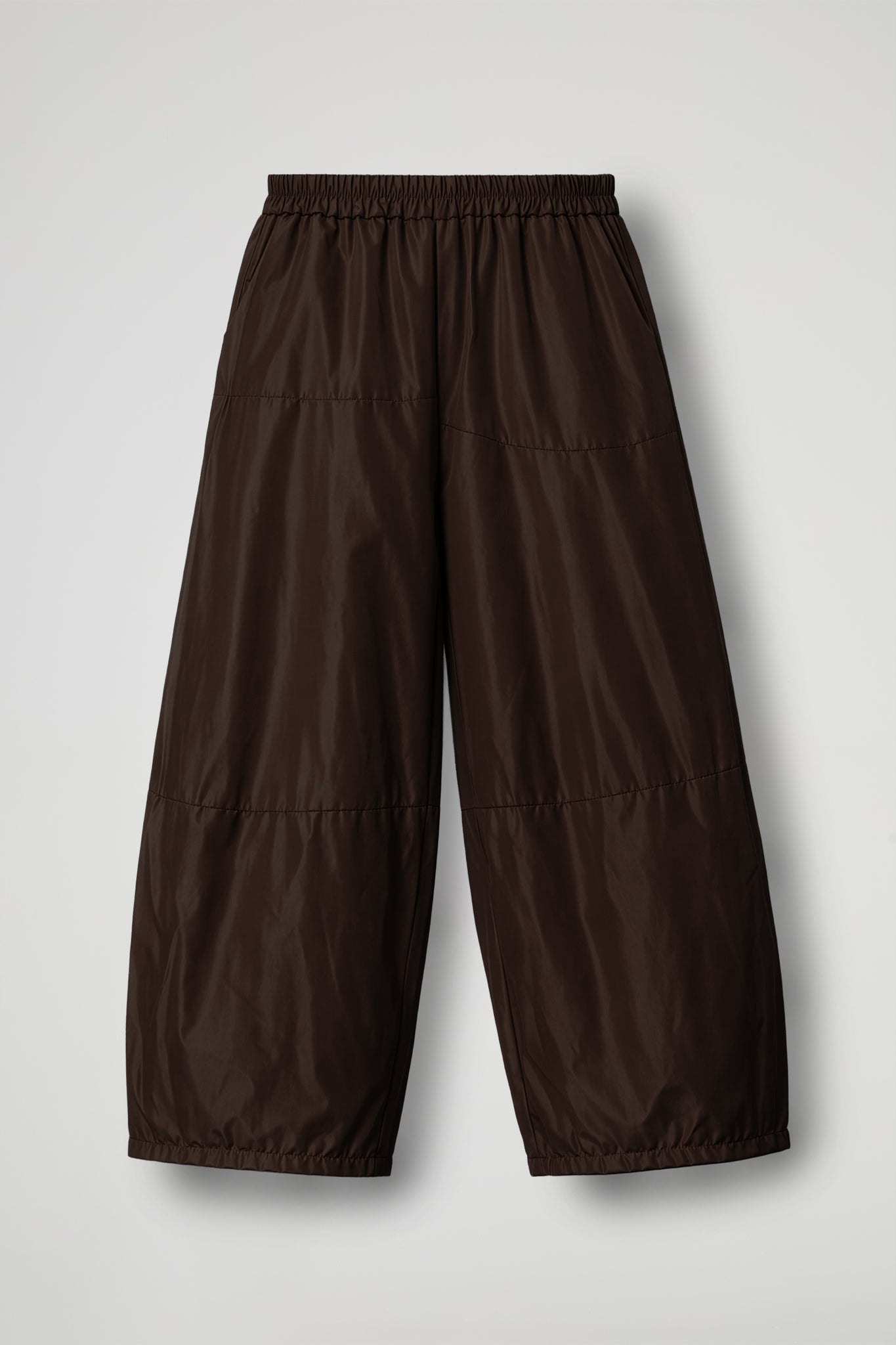 Baggy trousers in taffeta fabric with an elasticated waist, French pockets and asymmetrical stitching detail along the entire leg