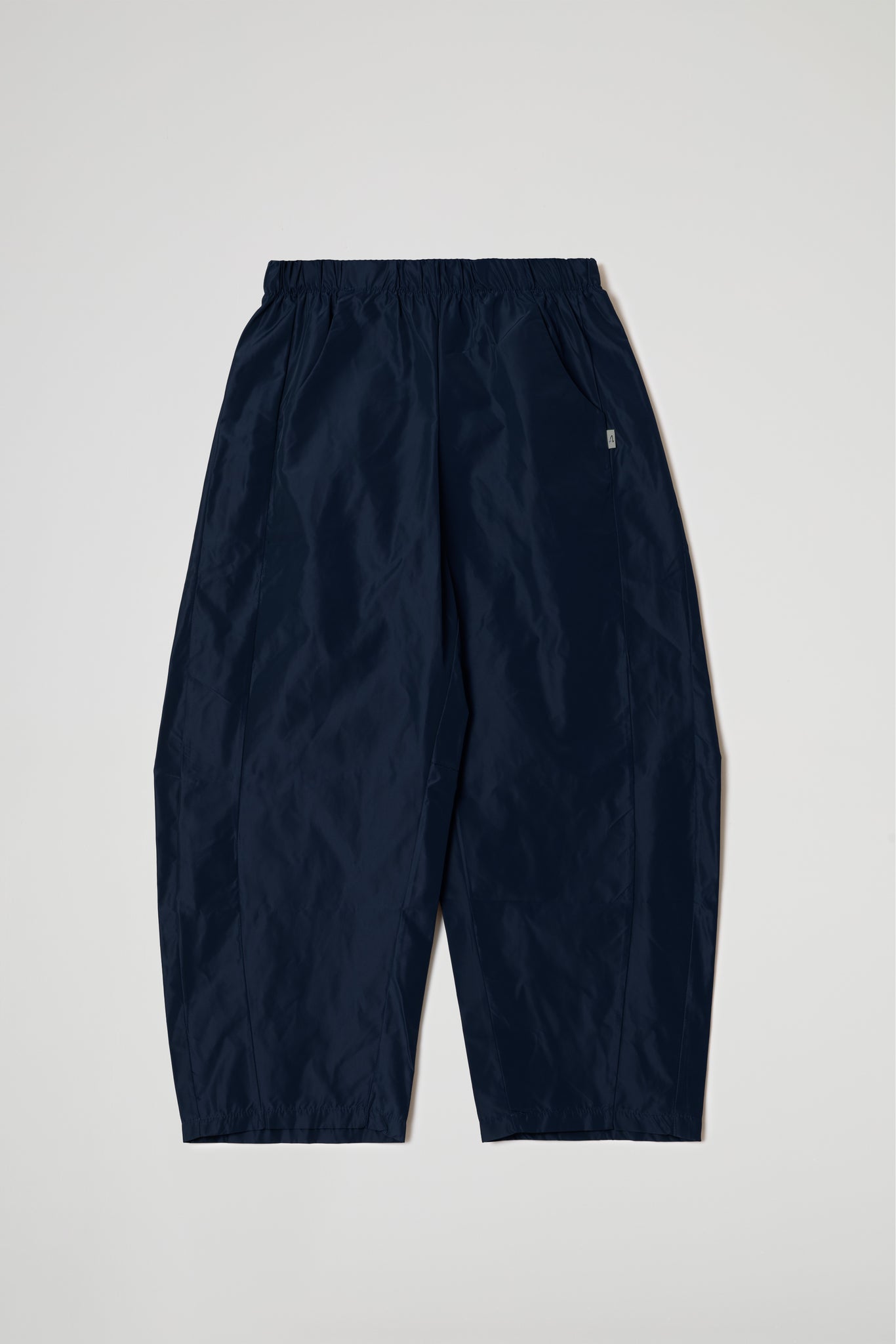 BARREL TROUSERS IN NACRE-EFFECT TAFFETA FABRIC, ELASTIC WAIST, CUT ON THE LEG, SQUARE POCKETS, BAGGY LINE