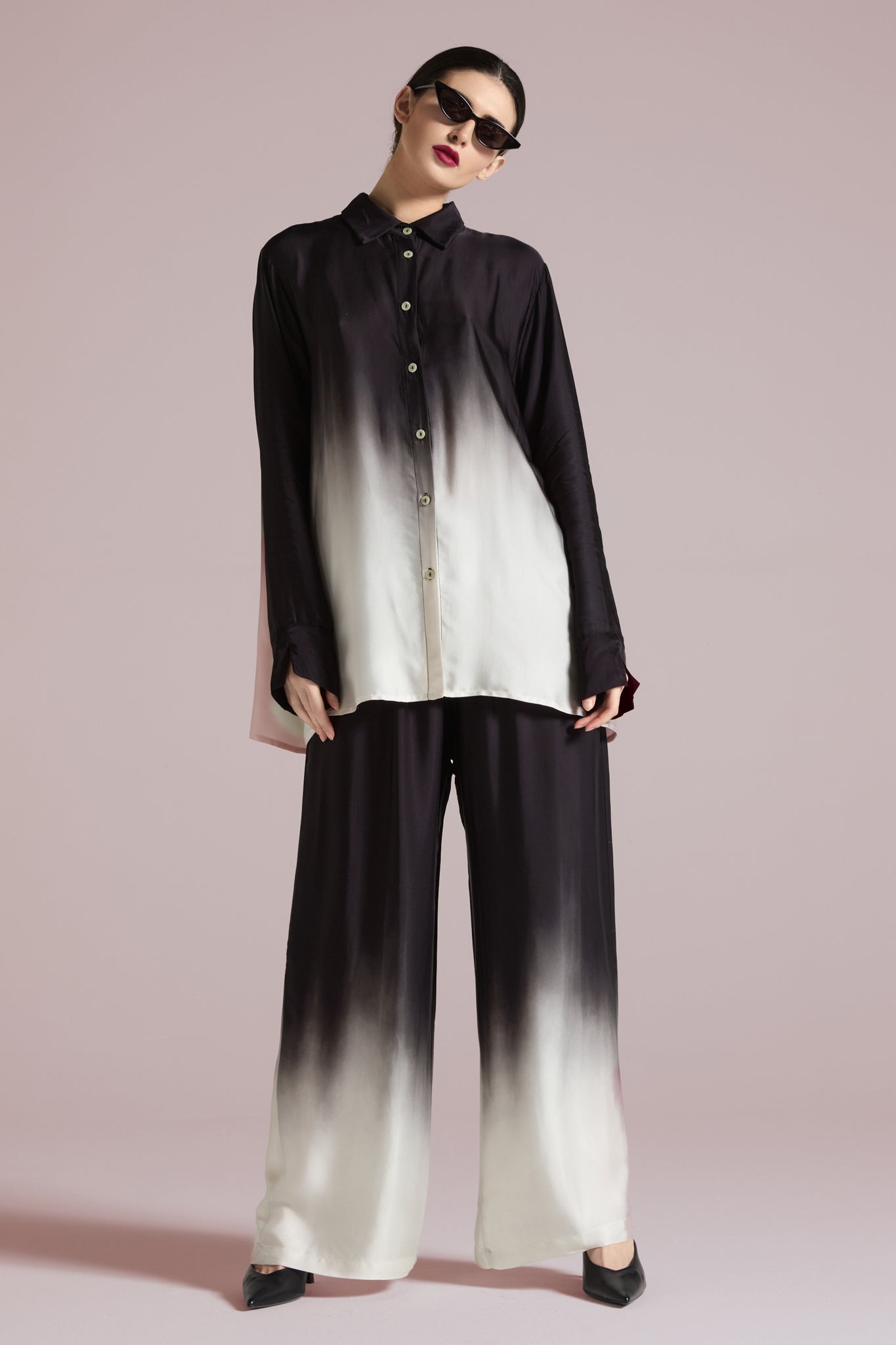 Palazzo pants, designed for a relaxed yet refined look. The elasticized gathered waistband adjusts easily, while the drawstring allows for adjustable fit. The extra-wide leg enhances the silhouette and accompanies movement, while the gradient color adds a unique and luminous touch.