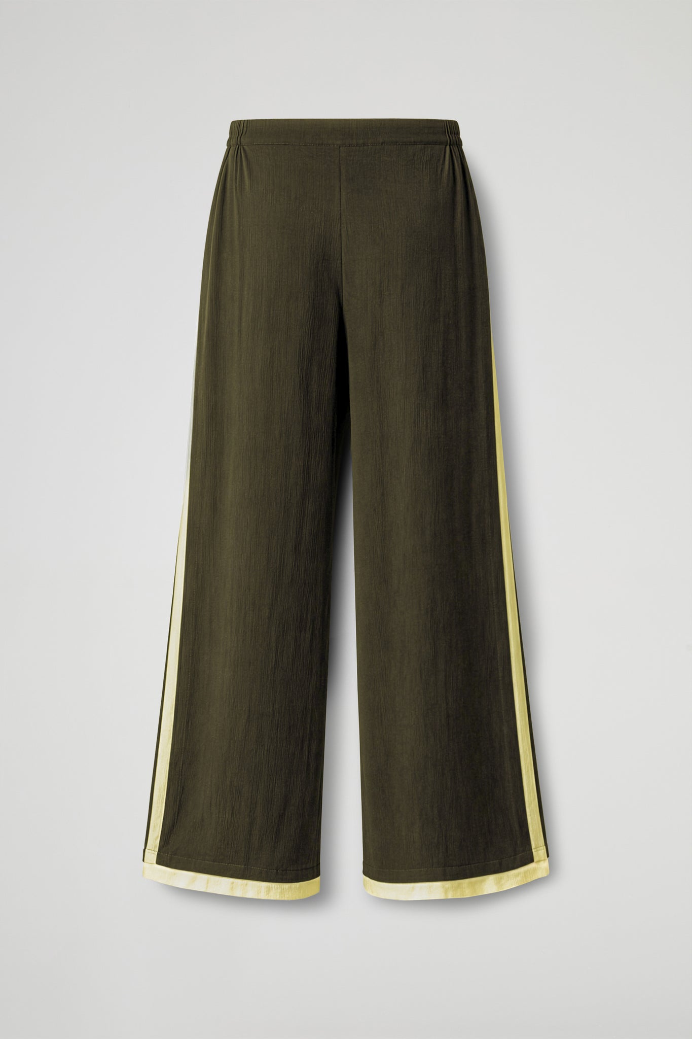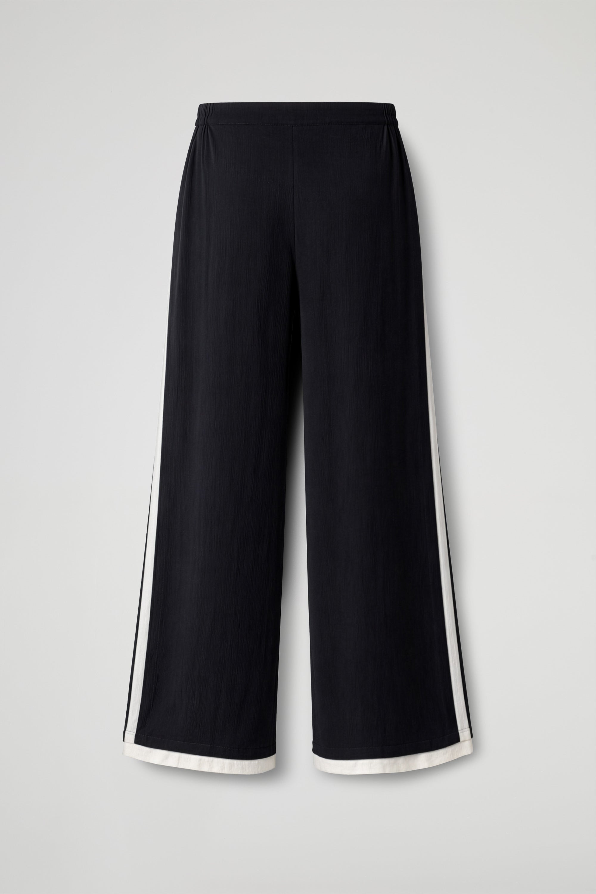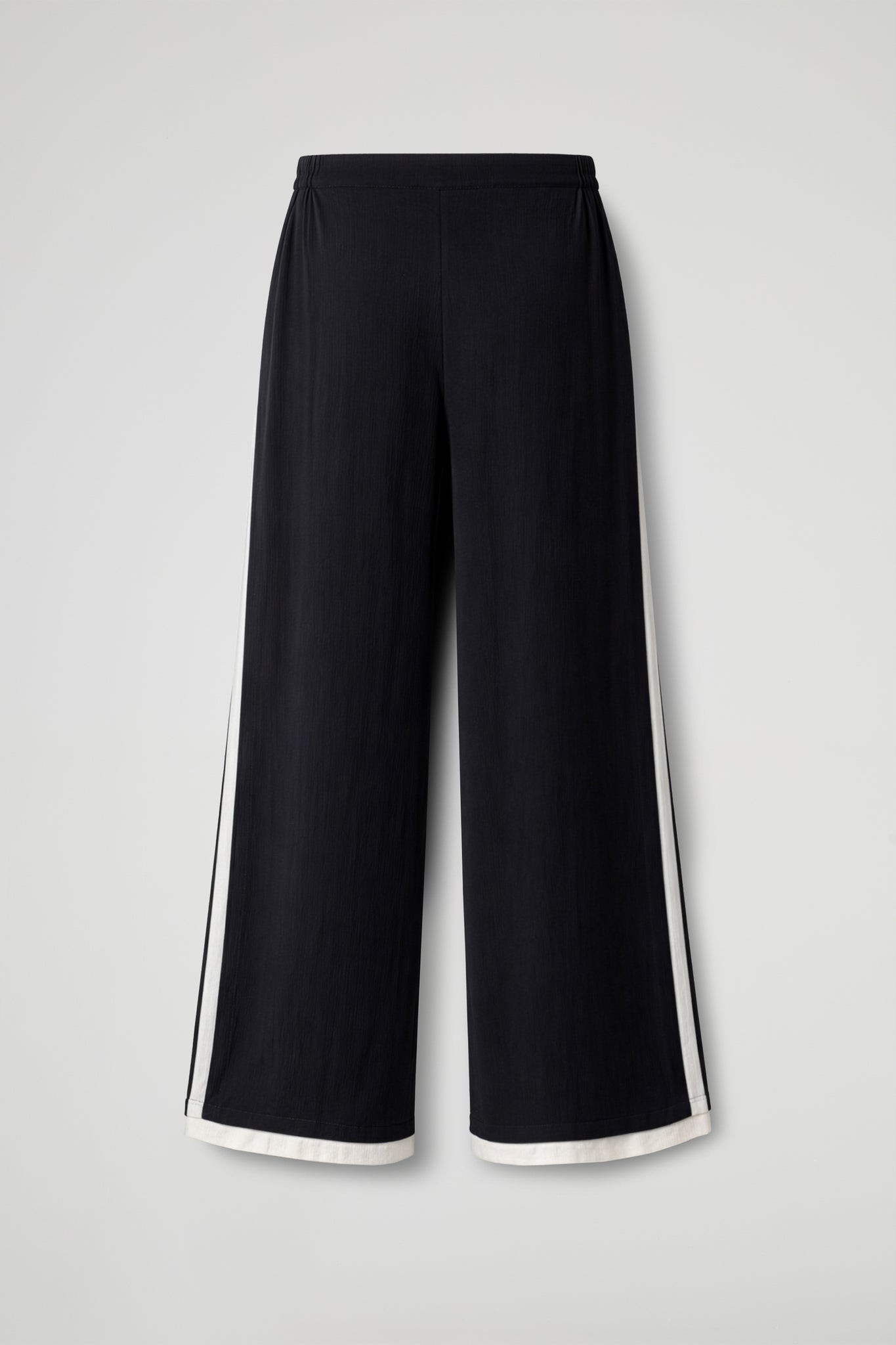 Long trousers with a wide and flowing cut, made of lightweight fabric with a slightly crinkled texture; high waist with a smooth band and soft line, contrasting color detail that runs straight down the leg, adding a distinctive touch. Essential garment with a minimalist style, perfect for both casual and more sophisticated looks.